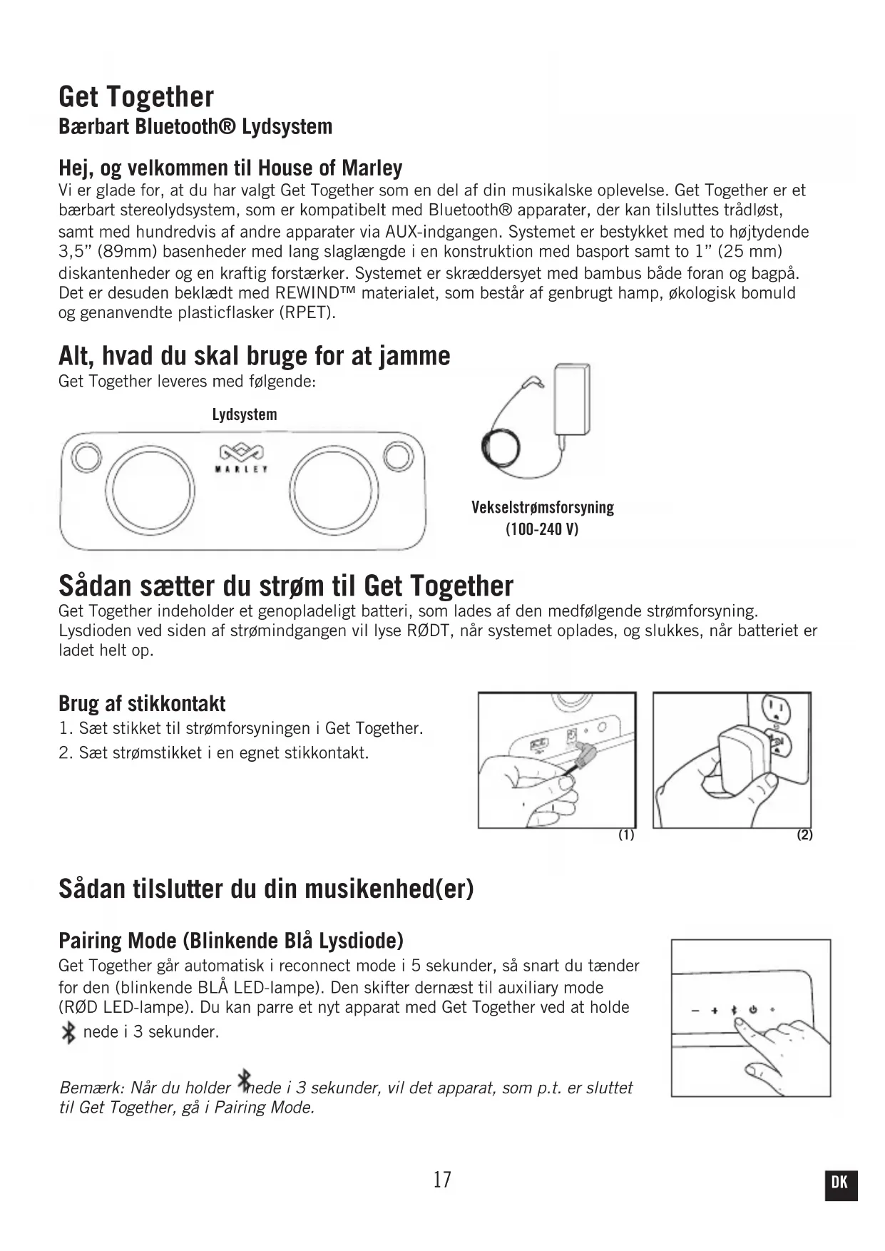 Questo simbolo indica che le batterie devono essere smaltite separatamente dai rifiuti domestici poiche contengono sostanze potenzialmente nocive per l’ambiente ela salute umana. Smaltire le batterie negli appositi centri di raccolta. IT17 Get Together Bærbart Bluetooth® Lydsystem Hej, og velkommen til House of Marley Vi er glade for, at du har valgt Get Together som en del af din musikalske oplevelse. Get Together er et bærbart stereolydsystem, som er kompatibelt med Bluetooth® apparater, der kan tilsluttes trådløst, samt med hundredvis af andre apparater via AUX-indgangen. Systemet er bestykket med to højtydende 3,5” (89mm) basenheder med lang slaglængde i en konstruktion med basport samt to 1” (25 mm) diskantenheder og en kraftig forstærker. Systemet er skræddersyet med bambus både foran og bagpå. Det er desuden beklædt med REWIND™ materialet, som består af genbrugt hamp, økologisk bomuld og genanvendte plasticflasker (RPET). Alt, hvad du skal bruge for at jamme Get Together leveres med følgende: Lydsystem Vekselstrømsforsyning (100-240 V) Sådan sætter du strøm til Get Together Get Together indeholder et genopladeligt batteri, som lades af den medfølgende strømforsyning. Lysdioden ved siden af strømindgangen vil lyse RØDT, når systemet oplades, og slukkes, når batteriet er ladet helt op. Brug af stikkontakt