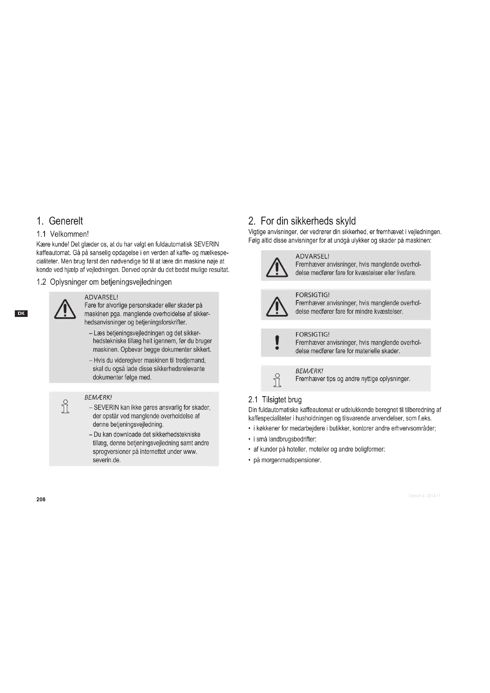 ADVARSEL! Fare for alvorlige personskader eller skader på maskinen pga. manglende overholdelse af sikker- hedsanvisninger og betjeningsforskrifter. – Læs betjeningsvejledningen og det sikker- hedstekniske tillæg helt igennem, før du bruger maskinen. Opbevar begge dokumenter sikkert. – Hvis du videregiver maskinen til tredjemand, skal du også lade disse sikkerhedsrelevante dokumenter følge med. BEMÆRK! – SEVERIN kan ikke gøres ansvarlig for skader, der opstår ved manglende overholdelse af denne betjeningsvejledning. – Du kan downloade det sikkerhedstekniske tillæg, denne betjeningsvejledning samt andre sprogversioner på internettet under www. severin.de.