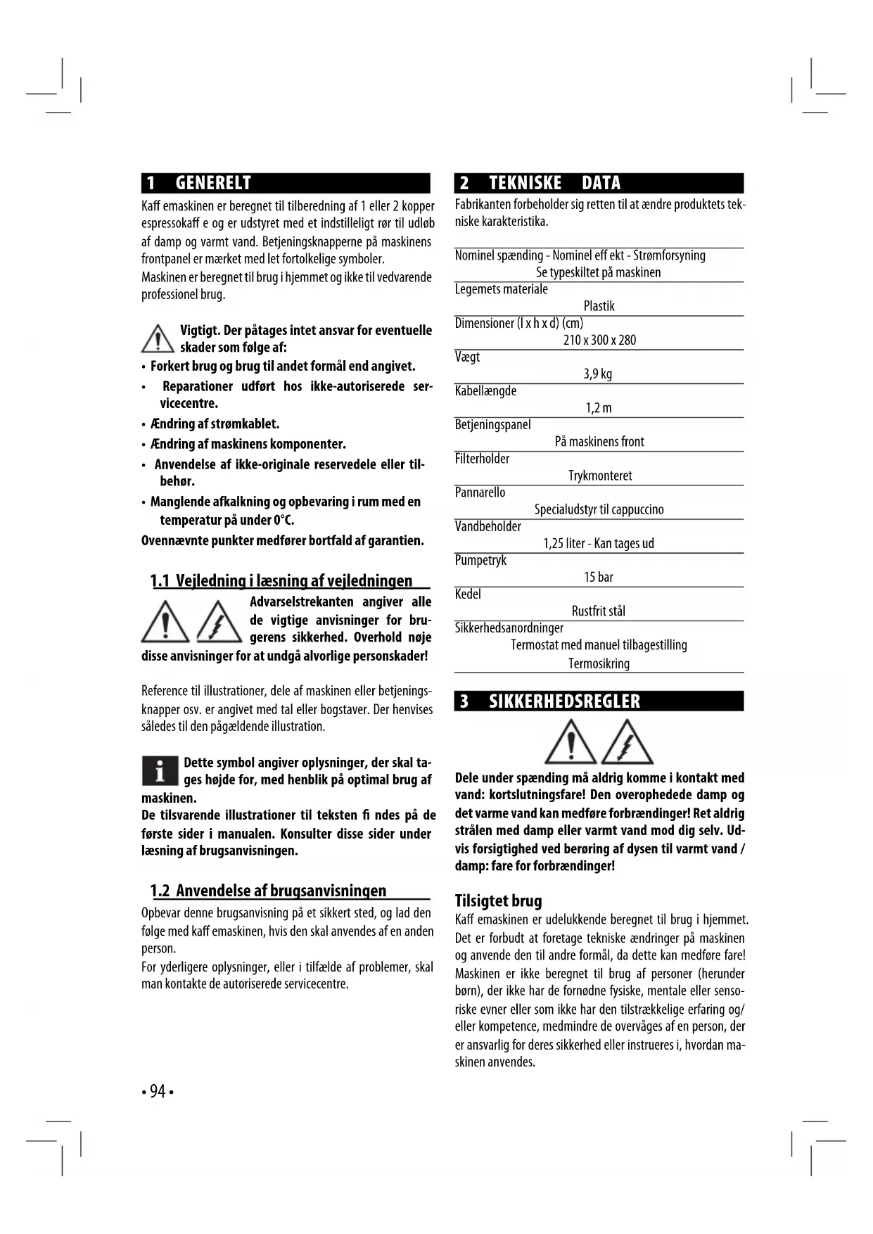 Opbevar denne brugsanvisning på et sikkert sted, og lad den følge med ka emaskinen, hvis den skal anvendes af en anden person. For yderligere oplysninger, eller i tilfælde af problemer, skal man kontakte de autoriserede servicecentre. 2 TEKNISKE DATA Fabrikanten forbeholder sig retten til at ændre produktets tek- niske karakteristika. Nominel spænding - Nominel e ekt - Strømforsyning Se typeskiltet på maskinen Legemets materiale Plastik Dimensioner (l x h x d) (cm) 210 x 300 x 280 Vægt 3,9 kg Kabellængde 1,2 m Betjeningspanel På maskinens front Filterholder Trykmonteret Pannarello Specialudstyr til cappuccino Vandbeholder 1,25 liter - Kan tages ud Pumpetryk 15 bar Kedel Rustfrit stål Sikkerhedsanordninger Termostat med manuel tilbagestilling Termosikring 3 SIKKERHEDSREGLER Dele under spænding må aldrig komme i kontakt med vand: kortslutningsfare! Den overophedede damp og det varme vand kan medføre forbrændinger! Ret aldrig strålen med damp eller varmt vand mod dig selv. Ud- vis forsigtighed ved berøring af dysen til varmt vand / damp: fare for forbrændinger! Tilsigtet brug Ka emaskinen er udelukkende beregnet til brug i hjemmet. Det er forbudt at foretage tekniske ændringer på maskinen og anvende den til andre formål, da dette kan medføre fare! Maskinen er ikke beregnet til brug af personer (herunder børn), der ikke har de fornødne fysiske, mentale eller senso- riske evner eller som ikke har den tilstrækkelige erfaring og/ eller kompetence, medmindre de overvåges af en person, der er ansvarlig for deres sikkerhed eller instrueres i, hvordan ma- skinen anvendes.• 95 • Dansk Strømforsyning Tilslut kun maskinen til en egnet stikkontakt. Spændingen skal stemme overens med værdien angivet på maskinens typeskilt. Strømkabel Tag ikke maskinen i brug, hvis strømkablet er defekt. Hvis strømkablet er defekt, skal det udskiftes af fabrikanten eller hos et af de autoriserede servicecentre. Lad ikke strømkablet løbe langs hjørner eller skarpe punkter eller varme genstande og beskyt det imod olie. Bær eller yt ikke ka emaskinen ved at trække i kablet. Træk ikke stikket ud ved at trække i kablet og rør ikke ved kablet med våde hænder. Undgå, at strømkablet falder frit ned over borde eller skabe. Personsikkerhed Hold altid børn under opsyn for at undgå, at de leger med ma- skinen. Børn er ikke klar over den fare, der er forbundet med husholdningsapparater. Lad heller ikke børn lege med maski- nens emballagemateriale. Fare for forbrænding Undgå at rette strålen med overophedet damp og/eller varmt vand mod dig selv og/eller andre personer. Brug altid de der- til indrettede håndtag eller greb. Filterholderen må aldrig afmonteres ( ernes), mens ka en er ved at løbe ud. Under opvarmningsfasen af ka eudløbsenheden kan der løbe dråber af varmt vand ud. Undgå at brygge ka e, når kontakten (