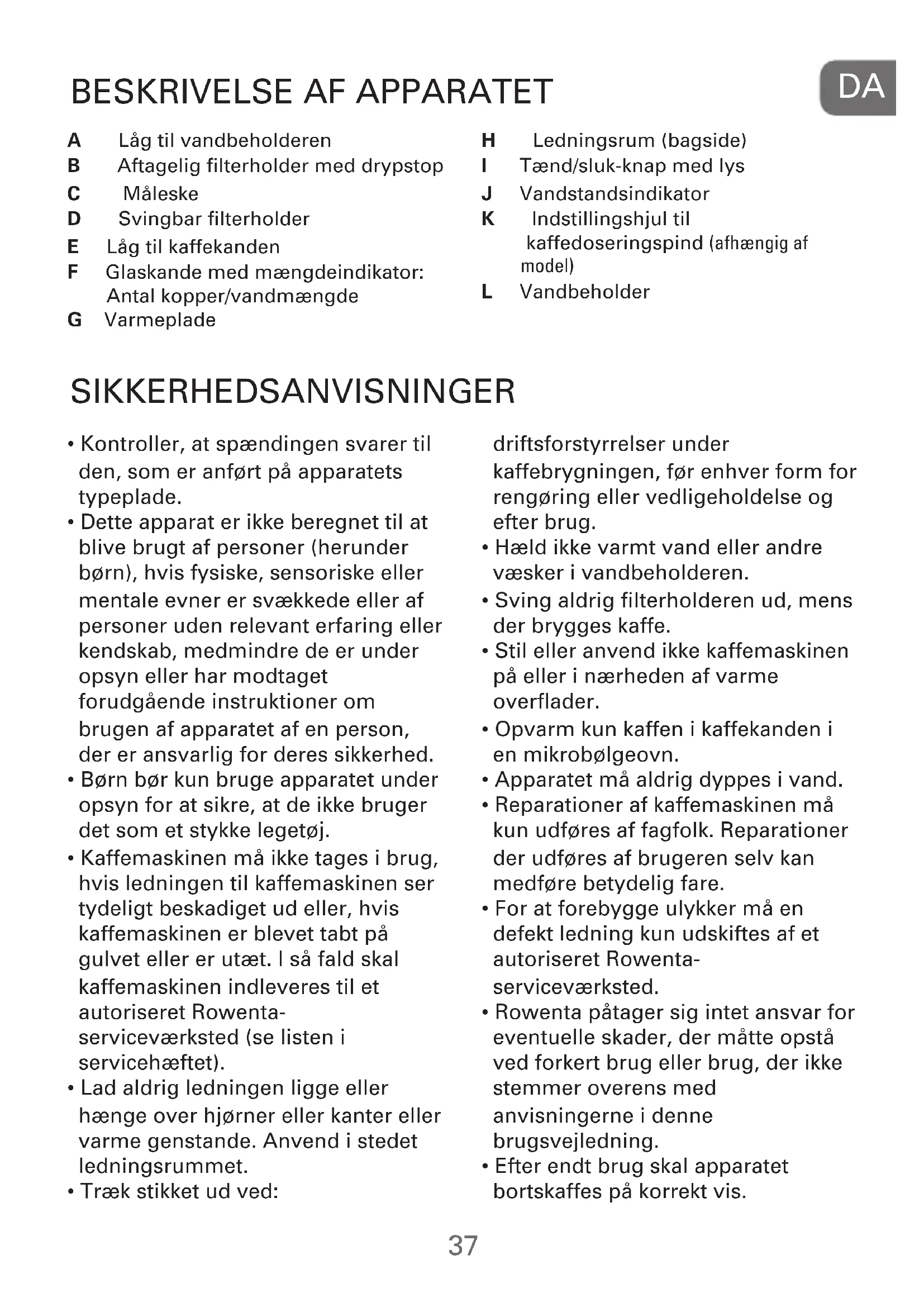 H Ledningsrum (bagside) I Tænd/sluk-knap med lys J Vandstandsindikator K Indstillingshjul til kaffedoseringspind (afhængig af model) L Vandbeholder A Låg til vandbeholderen B Aftagelig filterholder med drypstop C Måleske D Svingbar filterholder E Låg til kaffekanden F Glaskande med mængdeindikator: Antal kopper/vandmængde G Varmeplade driftsforstyrrelser under kaffebrygningen, før enhver form for rengøring eller vedligeholdelse og efter brug.