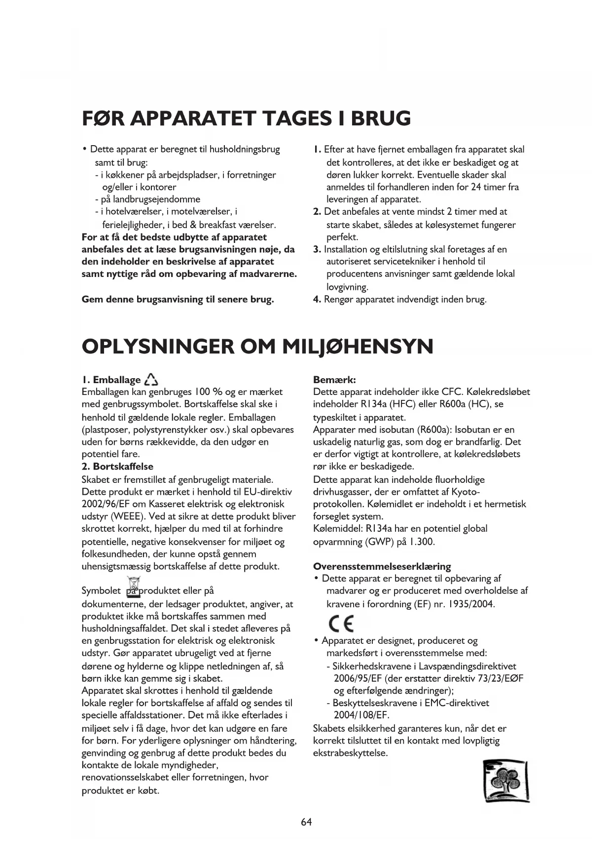 Skabet er fremstillet af genbrugeligt materiale. Dette produkt er mærket i henhold til EU-direktiv 2002/96/EF om Kasseret elektrisk og elektronisk udstyr (WEEE). Ved at sikre at dette produkt bliver skrottet korrekt, hjælper du med til at forhindre potentielle, negative konsekvenser for miljøet og folkesundheden, der kunne opstå gennem uhensigtsmæssig bortskaffelse af dette produkt. Symbolet på produktet eller på dokumenterne, der ledsager produktet, angiver, at produktet ikke må bortskaffes sammen med husholdningsaffaldet. Det skal i stedet afleveres på en genbrugsstation for elektrisk og elektronisk udstyr. Gør apparatet ubrugeligt ved at fjerne dørene og hylderne og klippe netledningen af, så børn ikke kan gemme sig i skabet. Apparatet skal skrottes i henhold til gældende lokale regler for bortskaffelse af affald og sendes til specielle affaldsstationer. Det må ikke efterlades i miljøet selv i få dage, hvor det kan udgøre en fare for børn. For yderligere oplysninger om håndtering, genvinding og genbrug af dette produkt bedes du kontakte de lokale myndigheder, renovationsselskabet eller forretningen, hvor produktet er købt. Bemærk: Dette apparat indeholder ikke CFC. Kølekredsløbet indeholder R134a (HFC) eller R600a (HC), se typeskiltet i apparatet. Apparater med isobutan (R600a): Isobutan er en uskadelig naturlig gas, som dog er brandfarlig. Det er derfor vigtigt at kontrollere, at kølekredsløbets rør ikke er beskadigede. Dette apparat kan indeholde fluorholdige drivhusgasser, der er omfattet af Kyoto- protokollen. Kølemidlet er indeholdt i et hermetisk forseglet system. Kølemiddel: R134a har en potentiel global opvarmning (GWP) på 1.300. Overensstemmelseserklæring