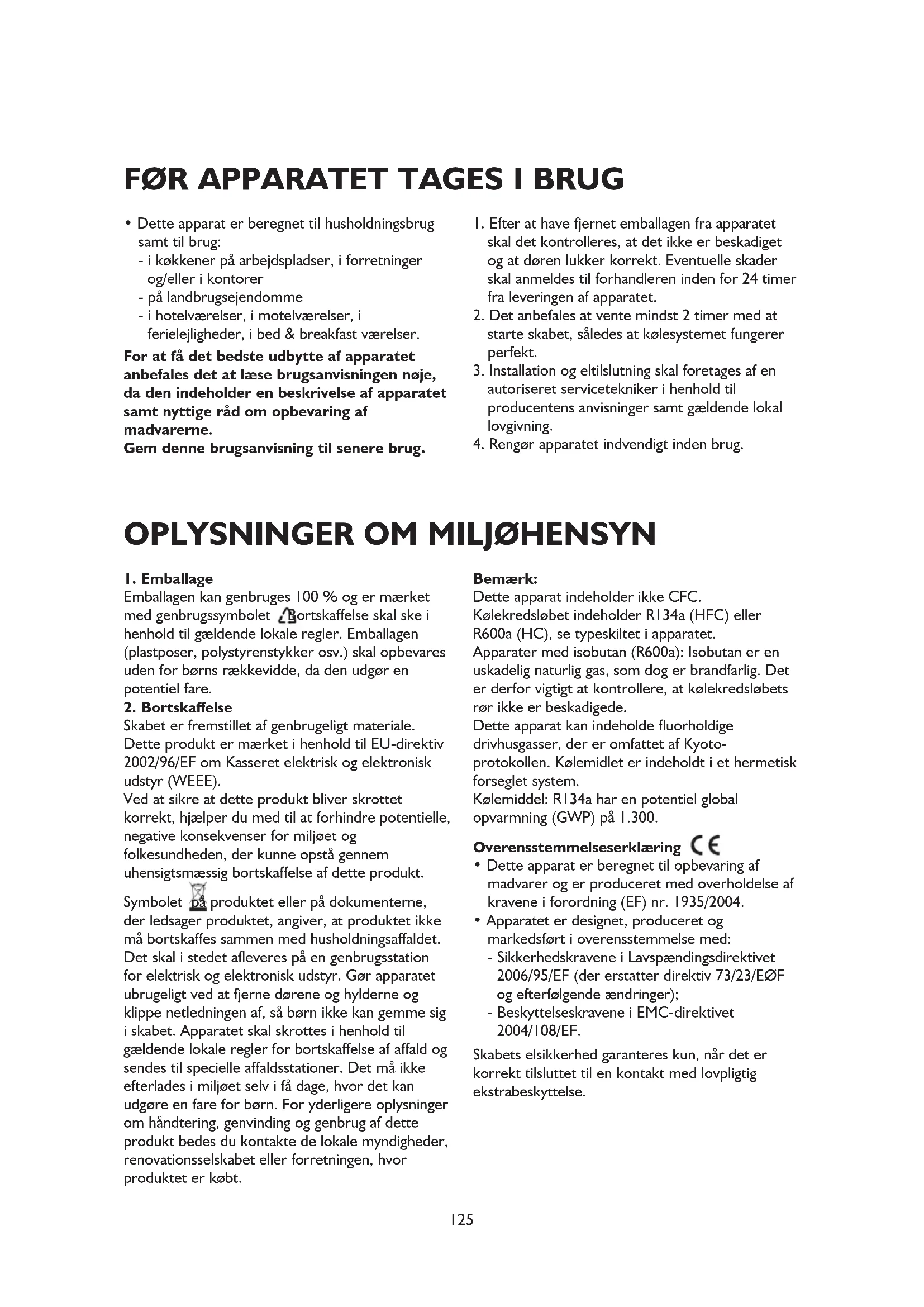 Skabet er fremstillet af genbrugeligt materiale. Dette produkt er mærket i henhold til EU-direktiv 2002/96/EF om Kasseret elektrisk og elektronisk udstyr (WEEE). Ved at sikre at dette produkt bliver skrottet korrekt, hjælper du med til at forhindre potentielle, negative konsekvenser for miljøet og folkesundheden, der kunne opstå gennem uhensigtsmæssig bortskaffelse af dette produkt. Symbolet på produktet eller på dokumenterne, der ledsager produktet, angiver, at produktet ikke må bortskaffes sammen med husholdningsaffaldet. Det skal i stedet afleveres på en genbrugsstation for elektrisk og elektronisk udstyr. Gør apparatet ubrugeligt ved at fjerne dørene og hylderne og klippe netledningen af, så børn ikke kan gemme sig i skabet. Apparatet skal skrottes i henhold til gældende lokale regler for bortskaffelse af affald og sendes til specielle affaldsstationer. Det må ikke efterlades i miljøet selv i få dage, hvor det kan udgøre en fare for børn. For yderligere oplysninger om håndtering, genvinding og genbrug af dette produkt bedes du kontakte de lokale myndigheder, renovationsselskabet eller forretningen, hvor produktet er købt. Bemærk: Dette apparat indeholder ikke CFC. Kølekredsløbet indeholder R134a (HFC) eller R600a (HC), se typeskiltet i apparatet. Apparater med isobutan (R600a): Isobutan er en uskadelig naturlig gas, som dog er brandfarlig. Det er derfor vigtigt at kontrollere, at kølekredsløbets rør ikke er beskadigede. Dette apparat kan indeholde fluorholdige drivhusgasser, der er omfattet af Kyoto- protokollen. Kølemidlet er indeholdt i et hermetisk forseglet system. Kølemiddel: R134a har en potentiel global opvarmning (GWP) på 1.300. Overensstemmelseserklæring
