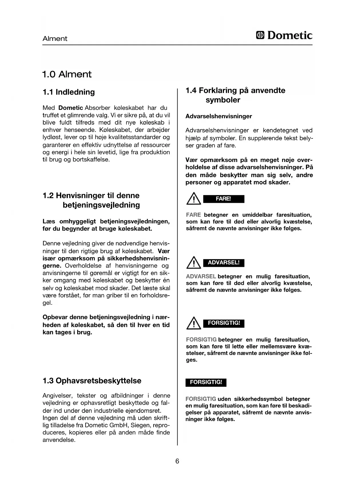 symboler Advarselshenvisninger er kendetegnet ved hjælp af symboler. En supplerende tekst bely- ser graden af fare. Vær opmærksom på en meget nøje over- holdelse af disse advarselshenvisninger. På den måde beskytter man sig selv, andre personer og apparatet mod skader. Advarselshenvisninger FARE betegner en umiddelbar faresituation, som kan føre til død eller alvorlig kvæstelse, såfremt de nævnte anvisninger ikke følges. FARE! ADVARSEL betegner en mulig faresituation, som kan føre til død eller alvorlig kvæstelse, såfremt de nævnte anvisninger ikke følges. ADVARSEL! FORSIGTIG betegner en mulig faresituation, som kan føre til lette eller mellemsvære kvæ- stelser, såfremt de nævnte anvisninger ikke føl- ges. FORSIGTIG! FORSIGTIG uden sikkerhedssymbol betegner en mulig faresituation, som kan føre til beskadi- gelser på apparatet, såfremt de nævnte anvis- ninger ikke følges. FORSIGTIG!7 Alment Garantiindfrielse sker i henhold til EU direktiv 44/1999/CE samt nationale vilkår. I tilfælde af en garantisag bedes du henvende dig til din forhandler. Skader, der er opstået som resultat af fejlagtig brug, er ikke omfattet af garantien. Garantien dækker ikke ved ændringer på køleskabet eller brug af andre dele end originale Dometic-dele ; garantien dækker ikke, hvis installerings- eller betjeningsvejledningen ikke er fulgt, og vi påtager os intet ansvar herfor.