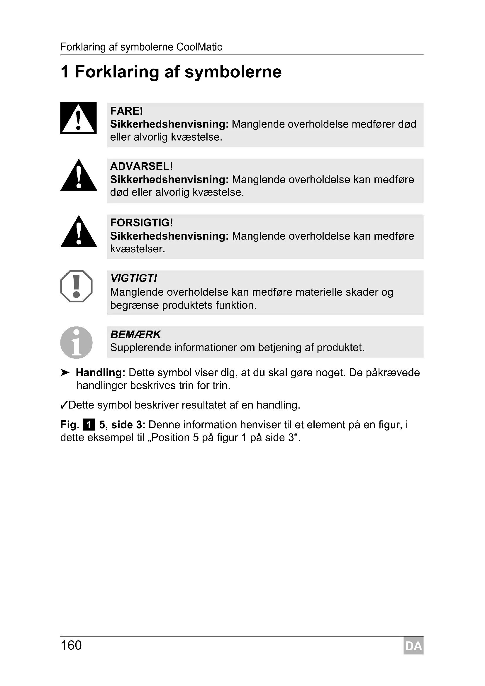 ➤ Handling: Dette symbol viser dig, at du skal gøre noget. De påkrævede handlinger beskrives trin for trin. ✓ Dette symbol beskriver resultatet af en handling. Fig. 1 5, side 3: Denne information henviser til et element på en figur, i dette eksempel til „Position 5 på figur 1 på side 3“. FARE! Sikkerhedshenvisning: Manglende overholdelse medfører død eller alvorlig kvæstelse. ADVARSEL! Sikkerhedshenvisning: Manglende overholdelse kan medføre død eller alvorlig kvæstelse. FORSIGTIG! Sikkerhedshenvisning: Manglende overholdelse kan medføre kvæstelser. VIGTIGT! Manglende overholdelse kan medføre materielle skader og begrænse produktets funktion. BEMÆRK Supplerende informationer om betjening af produktet.DA CoolMatic Sikkerhedshenvisninger