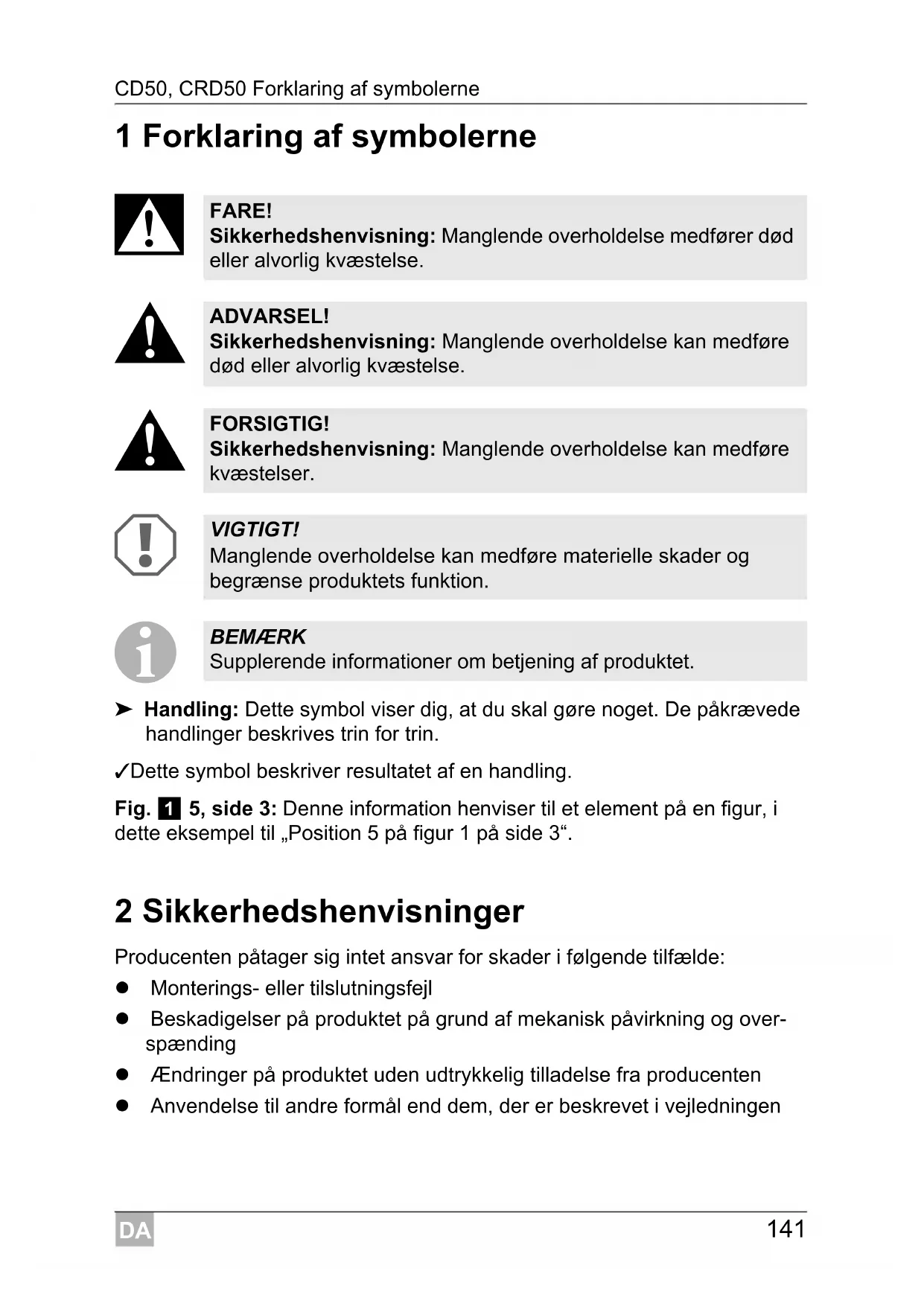 ➤ Handling: Dette symbol viser dig, at du skal gøre noget. De påkrævede handlinger beskrives trin for trin. ✓ Dette symbol beskriver resultatet af en handling. Fig. 1 5, side 3: Denne information henviser til et element på en figur, i dette eksempel til „Position 5 på figur 1 på side 3“. 2 Sikkerhedshenvisninger Producenten påtager sig intet ansvar for skader i følgende tilfælde: Monterings- eller tilslutningsfejl Beskadigelser på produktet på grund af mekanisk påvirkning og over- spænding Ændringer på produktet uden udtrykkelig tilladelse fra producenten Anvendelse til andre formål end dem, der er beskrevet i vejledningen FARE! Sikkerhedshenvisning: Manglende overholdelse medfører død eller alvorlig kvæstelse. ADVARSEL! Sikkerhedshenvisning: Manglende overholdelse kan medføre død eller alvorlig kvæstelse. FORSIGTIG! Sikkerhedshenvisning: Manglende overholdelse kan medføre kvæstelser. VIGTIGT! Manglende overholdelse kan medføre materielle skader og begrænse produktets funktion. BEMÆRK Supplerende informationer om betjening af produktet.DA Sikkerhedshenvisninger CD50, CRD50