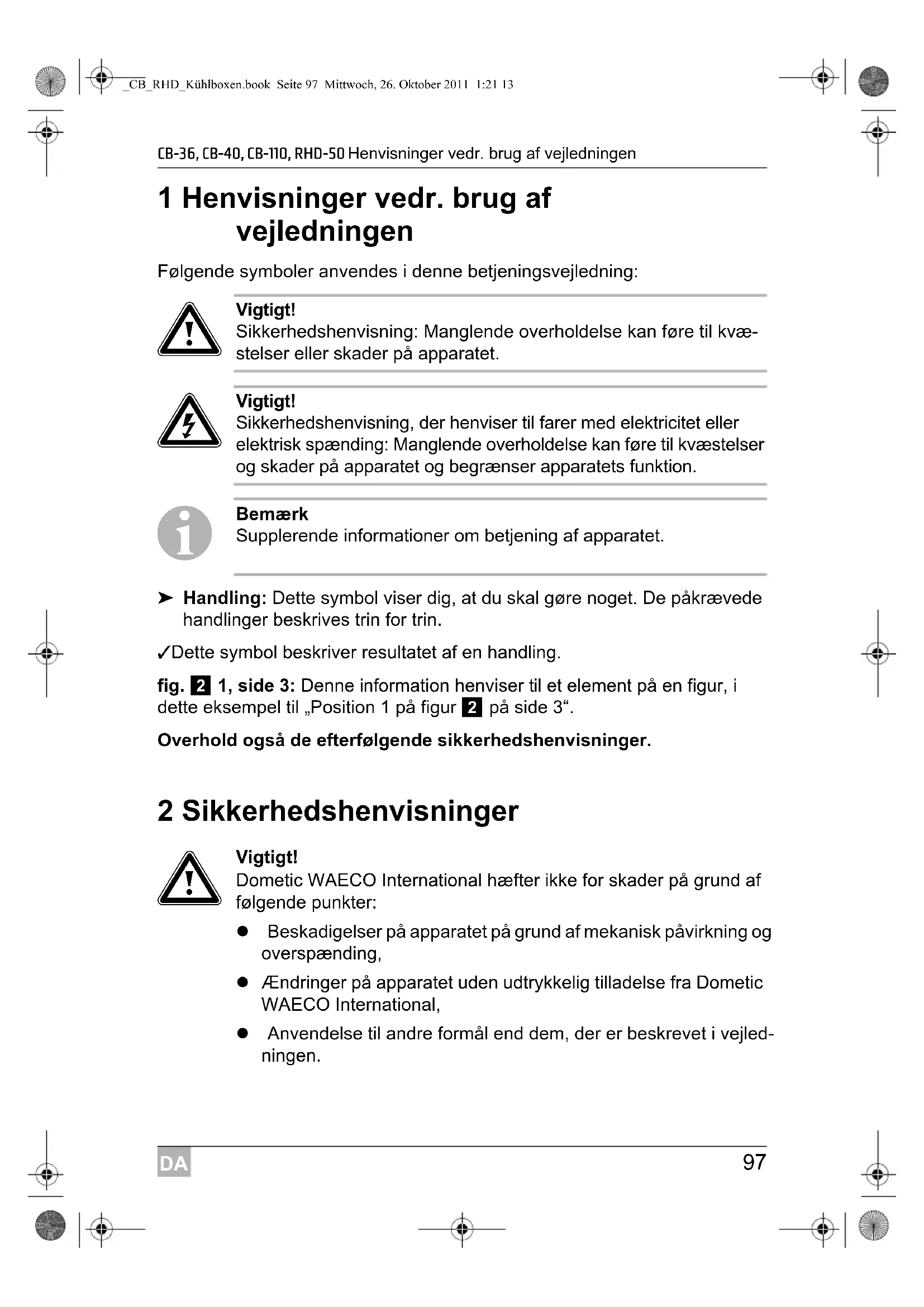 Vigtigt! Dometic WAECO International hæfter ikke for skader på grund af følgende punkter: Beskadigelser på apparatet på grund af mekanisk påvirkning og overspænding, Ændringer på apparatet uden udtrykkelig tilladelse fra Dometic WAECO International, Anvendelse til andre formål end dem, der er beskrevet i vejled- ningen. _CB_RHD_Kühlboxen.book Seite 97 Mittwoch, 26. Oktober 2011 1:21 13DA Sikkerhedshenvisninger CB-36, CB-40, CB-110, RHD-50