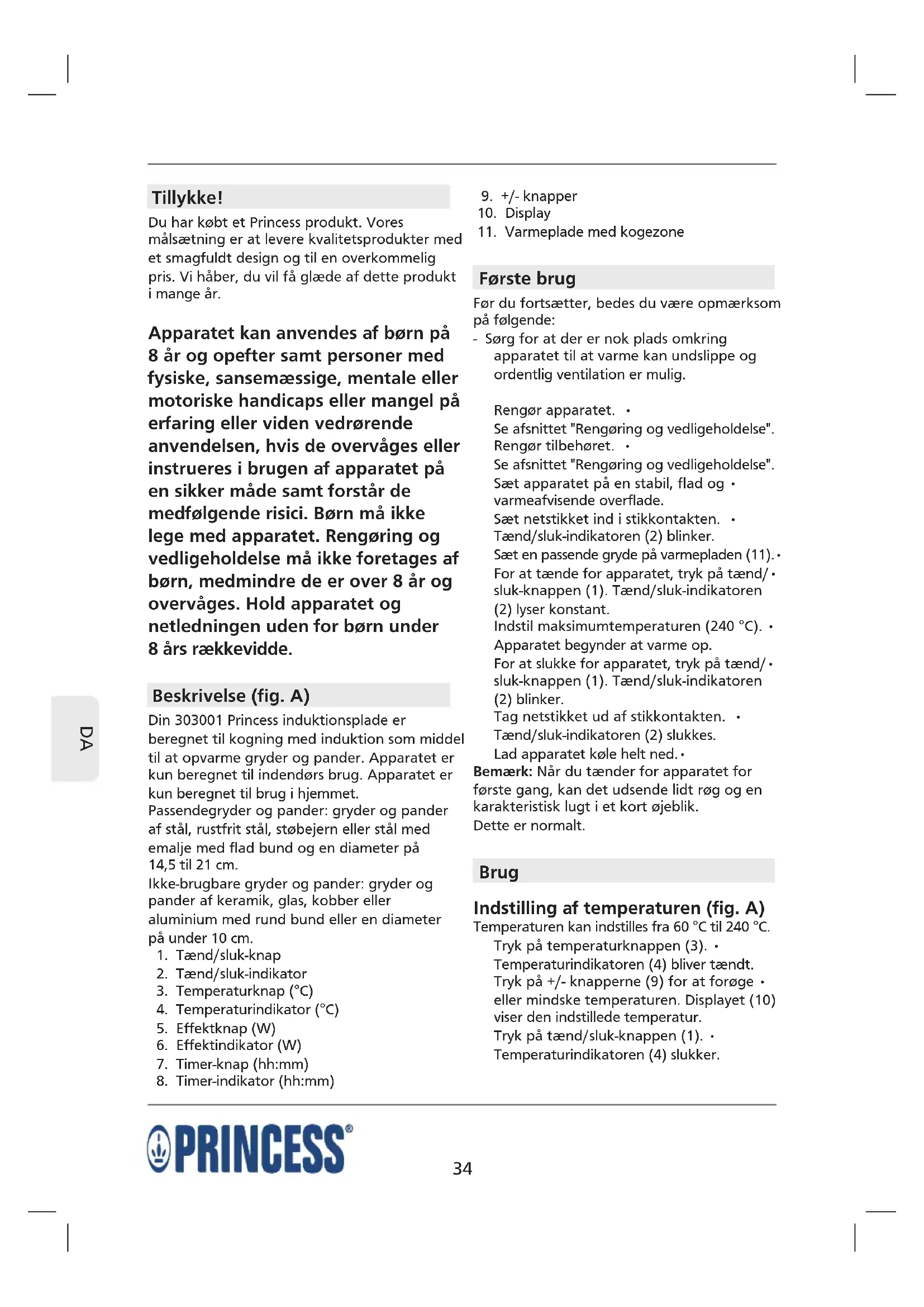 Tillykke! Du har købt et Princess produkt. Vores målsætning er at levere kvalitetsprodukter med et smagfuldt design og til en overkommelig pris. Vi håber, du vil få glæde af dette produkt i mange år. Apparatet kan anvendes af børn på 8 år og opefter samt personer med fysiske, sansemæssige, mentale eller motoriske handicaps eller mangel på erfaring eller viden vedrørende anvendelsen, hvis de overvåges eller instrueres i brugen af apparatet på en sikker måde samt forstår de medfølgende risici. Børn må ikke lege med apparatet. Rengøring og vedligeholdelse må ikke foretages af børn, medmindre de er over 8 år og overvåges. Hold apparatet og netledningen uden for børn under 8 års rækkevidde. Beskrivelse (fig. A) Din 303001 Princess induktionsplade er beregnet til kogning med induktion som middel til at opvarme gryder og pander. Apparatet er kun beregnet til indendørs brug. Apparatet er kun beregnet til brug i hjemmet. Passendegryder og pander: gryder og pander af stål, rustfrit stål, støbejern eller stål med emalje med flad bund og en diameter på 14,5 til 21 cm. Ikke-brugbare gryder og pander: gryder og pander af keramik, glas, kobber eller aluminium med rund bund eller en diameter på under 10 cm.