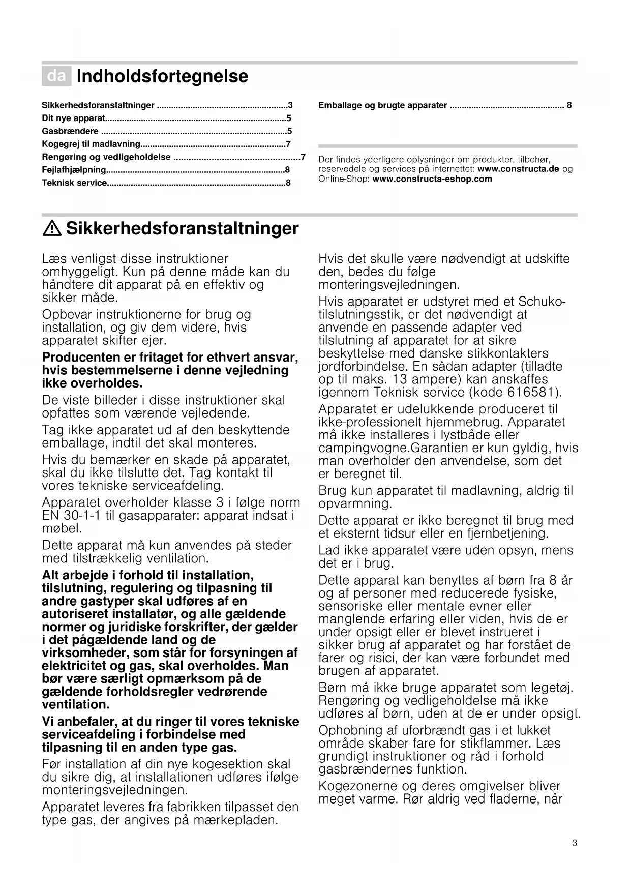 - Emballage og brugte apparater Produktinfo Der findes yderligere oplysninger om produkter, tilbehør, reservedele og services på internettet: www.constructa.de og Online-Shop: www.constructa-eshop.com : Sikkerhedsforanstaltninger Læs venligst disse instruktioner omhyggeligt. Kun på denne måde kan du håndtere dit apparat på en effektiv og sikker måde. Opbevar instruktionerne for brug og installation, og giv dem videre, hvis apparatet skifter ejer. Producenten er fritaget for ethvert ansvar, hvis bestemmelserne i denne vejledning ikke overholdes. De viste billeder i disse instruktioner skal opfattes som værende vejledende. Tag ikke apparatet ud af den beskyttende emballage, indtil det skal monteres. Hvis du bemærker en skade på apparatet, skal du ikke tilslutte det. Tag kontakt til vores tekniske serviceafdeling. Apparatet overholder klasse 3 i følge norm EN 30-1-1 til gasapparater: apparat indsat i møbel. Dette apparat må kun anvendes på steder med tilstrækkelig ventilation. Alt arbejde i forhold til installation, tilslutning, regulering og tilpasning til andre gastyper skal udføres af en autoriseret installatør, og alle gældende normer og juridiske forskrifter, der gælder i det pågældende land og de virksomheder, som står for forsyningen af elektricitet og gas, skal overholdes. Man bør være særligt opmærksom på de gældende forholdsregler vedrørende ventilation. Vi anbefaler, at du ringer til vores tekniske serviceafdeling i forbindelse med tilpasning til en anden type gas. Før installation af din nye kogesektion skal du sikre dig, at installationen udføres ifølge monteringsvejledningen. Apparatet leveres fra fabrikken tilpasset den type gas, der angives på mærkepladen. Hvis det skulle være nødvendigt at udskifte den, bedes du følge monteringsvejledningen. Hvis apparatet er udstyret med et Schuko- tilslutningsstik, er det nødvendigt at anvende en passende adapter ved tilslutning af apparatet for at sikre beskyttelse med danske stikkontakters jordforbindelse. En sådan adapter (tilladte op til maks. 13 ampere) kan anskaffes igennem Teknisk service (kode 616581). Apparatet er udelukkende produceret til ikke-professionelt hjemmebrug. Apparatet må ikke installeres i lystbåde eller campingvogne.Garantien er kun gyldig, hvis man overholder den anvendelse, som det er beregnet til. Brug kun apparatet til madlavning, aldrig til opvarmning. Dette apparat er ikke beregnet til brug med et eksternt tidsur eller en fjernbetjening. Lad ikke apparatet være uden opsyn, mens det er i brug. Dette apparat kan benyttes af børn fra 8 år og af personer med reducerede fysiske, sensoriske eller mentale evner eller manglende erfaring eller viden, hvis de er under opsigt eller er blevet instrueret i sikker brug af apparatet og har forstået de farer og risici, der kan være forbundet med brugen af apparatet. Børn må ikke bruge apparatet som legetøj. Rengøring og vedligeholdelse må ikke udføres af børn, uden at de er under opsigt. Ophobning af uforbrændt gas i et lukket område skaber fare for stikflammer. Læs grundigt instruktioner og råd i forhold gasbrændernes funktion. Kogezonerne og deres omgivelser bliver meget varme. Rør aldrig ved fladerne, når4 der er varme. Hold børn under 8 år på sikker afstand. Kogezonerne bliver meget varme. Læg aldrig brændbare genstande på kogesektionen. Opbevar ikke genstande på kogesektionen. Opbevar, eller brug ikke korroderende, kemiske produkter, damp, ildfaste materialer eller ikke-fødevarer under apparatet eller i nærheden af det. Fedtstoffer eller opvarmet madolie kan let antændes. Vær ikke fraværende under opvarmning af fedtstoffer eller olier. Hvis de antændes, må du ikke slukke ilden med vand. ¡Fare for forbrændinger! Dæk kogegrejet med et låg for at kvæle ilden, og afbryd kogezonen. Kogegrej, der udviser skader, har en uegnet størrelse, støder på kanterne af kogesektionen eller er forkert placeret, kan resultere i alvorlige læsioner. Overhold råd og vejledninger om kogegrej til madlavning. Anvendelse af gasapparatet producerer varme, fugtighed og forbrændingsprodukter i lokalet, hvor det er installeret. Sørg for en passende ventilation i køkkenet, specielt imens kogesektionen er i brug: Hold de naturlige ventilationsåbninger åbne eller installér mekanisk ventilation (emhætte). Kraftig og langvarig brug af apparatet kan skabe behov for ekstra eller mere effektiv ventilation: åbn et vindue eller forøg styrken på den mekaniske ventilation. Udsæt ikke apparatet for luftstrømme. Brænderne kan blive slukket. Brug ikke damprensemaskiner på kogesektionen. ¡Fare for elektrisk stød! I tilfælde af nedbrud skal du afbryde tilførslen af gas og elektricitet til apparatet. Kontakt vores tekniske serviceafdeling i forbindelse med reparation. Udfør ikke ændringer af de indvendige dele af apparatet. Hvis det skulle være nødvendigt, skal du kontakte vores tekniske serviceafdeling. Hvis en af betjeningsknapperne ikke kan drejes rundt, må du ikke tvinge den. Ring øjeblikkeligt til vores tekniske serviceafdeling, så den kan blive repareret eller udskiftet.5 Dit nye apparat På side 2 vil du finde en generel oversigt over apparatet foruden styrken i brænderne. Tilbehør Afhængigt af model kan kogesektionen være leveret med følgende tilbehør. Dette kan også købes hos teknisk serviceafdeling. p. 8