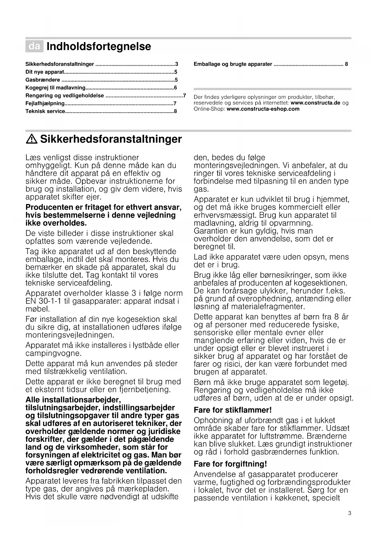 - Emballage og brugte apparater Produktinfo Der findes yderligere oplysninger om produkter, tilbehør, reservedele og services på internettet: www.constructa.de og Online-Shop: www.constructa-eshop.com : Sikkerhedsforanstaltninger Læs venligst disse instruktioner omhyggeligt. Kun på denne måde kan du håndtere dit apparat på en effektiv og sikker måde. Opbevar instruktionerne for brug og installation, og giv dem videre, hvis apparatet skifter ejer. Producenten er fritaget for ethvert ansvar, hvis bestemmelserne i denne vejledning ikke overholdes. De viste billeder i disse instruktioner skal opfattes som værende vejledende. Tag ikke apparatet ud af den beskyttende emballage, indtil det skal monteres. Hvis du bemærker en skade på apparatet, skal du ikke tilslutte det. Tag kontakt til vores tekniske serviceafdeling. Apparatet overholder klasse 3 i følge norm EN 30-1-1 til gasapparater: apparat indsat i møbel. Før installation af din nye kogesektion skal du sikre dig, at installationen udføres ifølge monteringsvejledningen. Apparatet må ikke installeres i lystbåde eller campingvogne. Dette apparat må kun anvendes på steder med tilstrækkelig ventilation. Dette apparat er ikke beregnet til brug med et eksternt tidsur eller en fjernbetjening. Alle installationsarbejder, tilslutningsarbejder, indstillingsarbejder og tilslutningsopgaver til andre typer gas skal udføres af en autoriseret tekniker, der overholder gældende normer og juridiske forskrifter, der gælder i det pågældende land og de virksomheder, som står for forsyningen af elektricitet og gas. Man bør være særligt opmærksom på de gældende forholdsregler vedrørende ventilation. Apparatet leveres fra fabrikken tilpasset den type gas, der angives på mærkepladen. Hvis det skulle være nødvendigt at udskifte den, bedes du følge monteringsvejledningen. Vi anbefaler, at du ringer til vores tekniske serviceafdeling i forbindelse med tilpasning til en anden type gas. Apparatet er kun udviklet til brug i hjemmet, og det må ikke bruges kommercielt eller erhvervsmæssigt. Brug kun apparatet til madlavning, aldrig til opvarmning. Garantien er kun gyldig, hvis man overholder den anvendelse, som det er beregnet til. Lad ikke apparatet være uden opsyn, mens det er i brug. Brug ikke låg eller børnesikringer, som ikke anbefales af producenten af kogesektionen. De kan forårsage ulykker, herunder f.eks. på grund af overophedning, antænding eller løsning af materialefragmenter. Dette apparat kan benyttes af børn fra 8 år og af personer med reducerede fysiske, sensoriske eller mentale evner eller manglende erfaring eller viden, hvis de er under opsigt eller er blevet instrueret i sikker brug af apparatet og har forstået de farer og risici, der kan være forbundet med brugen af apparatet. Børn må ikke bruge apparatet som legetøj. Rengøring og vedligeholdelse må ikke udføres af børn, uden at de er under opsigt. Fare for stikflammer! Ophobning af uforbrændt gas i et lukket område skaber fare for stikflammer. Udsæt ikke apparatet for luftstrømme. Brænderne kan blive slukket. Læs grundigt instruktioner og råd i forhold gasbrændernes funktion. Fare for forgiftning! Anvendelse af gasapparatet producerer varme, fugtighed og forbrændingsprodukter i lokalet, hvor det er installeret. Sørg for en passende ventilation i køkkenet, specielt4 imens kogesektionen er i brug: Hold de naturlige ventilationsåbninger åbne eller installér mekanisk ventilation (emhætte). Kraftig og langvarig brug af apparatet kan skabe behov for ekstra eller mere effektiv ventilation: åbn et vindue eller forøg styrken på den mekaniske ventilation. Fare for forbrændinger! Kogezonerne og de tilgrænsende områder bliver meget varme. Berør aldrig de varme overflader. Hold børn under 8 år på behørig afstand. Risiko for brand! p. 8
