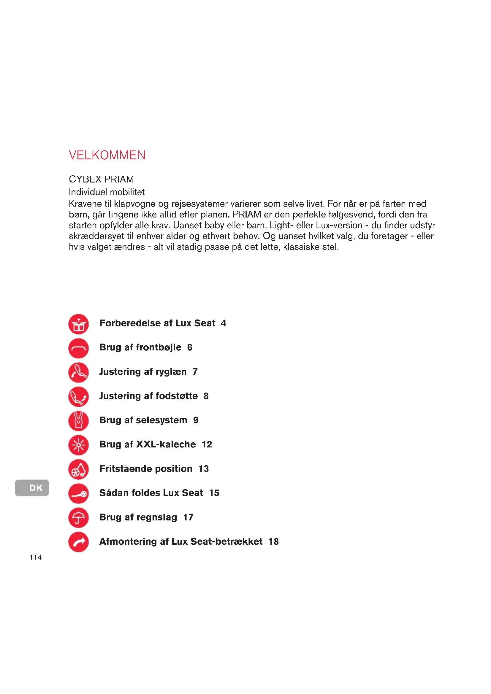 VELKOMMEN Kravene til klapvogne og rejsesystemer varierer som selve livet. For når er på farten med børn, går tingene ikke altid efter planen. PRIAM er den perfekte følgesvend, fordi den fra starten opfylder alle krav. Uanset baby eller barn, Light- eller Lux-version - du finder udstyr skræddersyet til enhver alder og ethvert behov. Og uanset hvilket valg, du foretager - eller hvis valget ændres - alt vil stadig passe på det lette, klassiske stel. Individuel mobilitet CYBEX PRIAM Forberedelse af Lux Seat 4 Brug af frontbøjle 6 Justering af ryglæn 7 Justering af fodstøtte 8 Brug af selesystem 9 Brug af XXL-kaleche 12 Fritstående position 13 Sådan foldes Lux Seat 15 Brug af regnslag 17 Afmontering af Lux Seat-betrækket 18DK