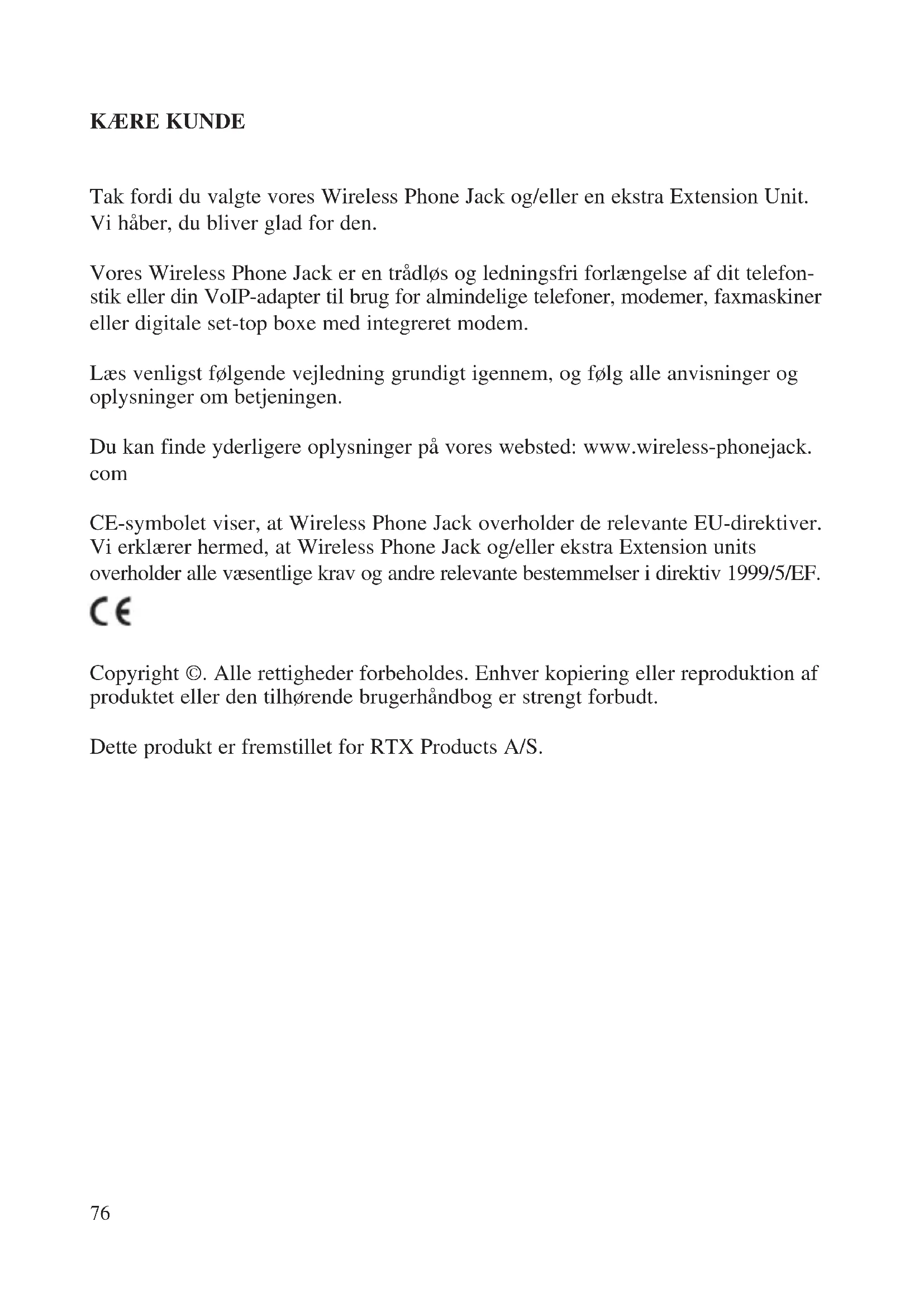 Tak fordi du valgte vores Wireless Phone Jack og/eller en ekstra Extension Unit. Vi håber, du bliver glad for den. Vores Wireless Phone Jack er en trådløs og ledningsfri forlængelse af dit telefon- stik eller din VoIP-adapter til brug for almindelige telefoner, modemer, faxmaskiner eller digitale set-top boxe med integreret modem. Læs venligst følgende vejledning grundigt igennem, og følg alle anvisninger og oplysninger om betjeningen. Du kan finde yderligere oplysninger på vores websted: www.wireless-phonejack. com CE-symbolet viser, at Wireless Phone Jack overholder de relevante EU-direktiver. Vi erklærer hermed, at Wireless Phone Jack og/eller ekstra Extension units overholder alle væsentlige krav og andre relevante bestemmelser i direktiv 1999/5/EF. Copyright ©. Alle rettigheder forbeholdes. Enhver kopiering eller reproduktion af produktet eller den tilhørende brugerhåndbog er strengt forbudt. Dette produkt er fremstillet for RTX Products A/S.77 UDPAKNING Pak forsigtigt enhederne ud af emballagen. Hvis der er synlige skader, bør du IKKE forsøge at installere dit Wireless Phone Jack. Henvend dig straks til forhandleren eller fragtmanden. KASSENS INDHOLD: