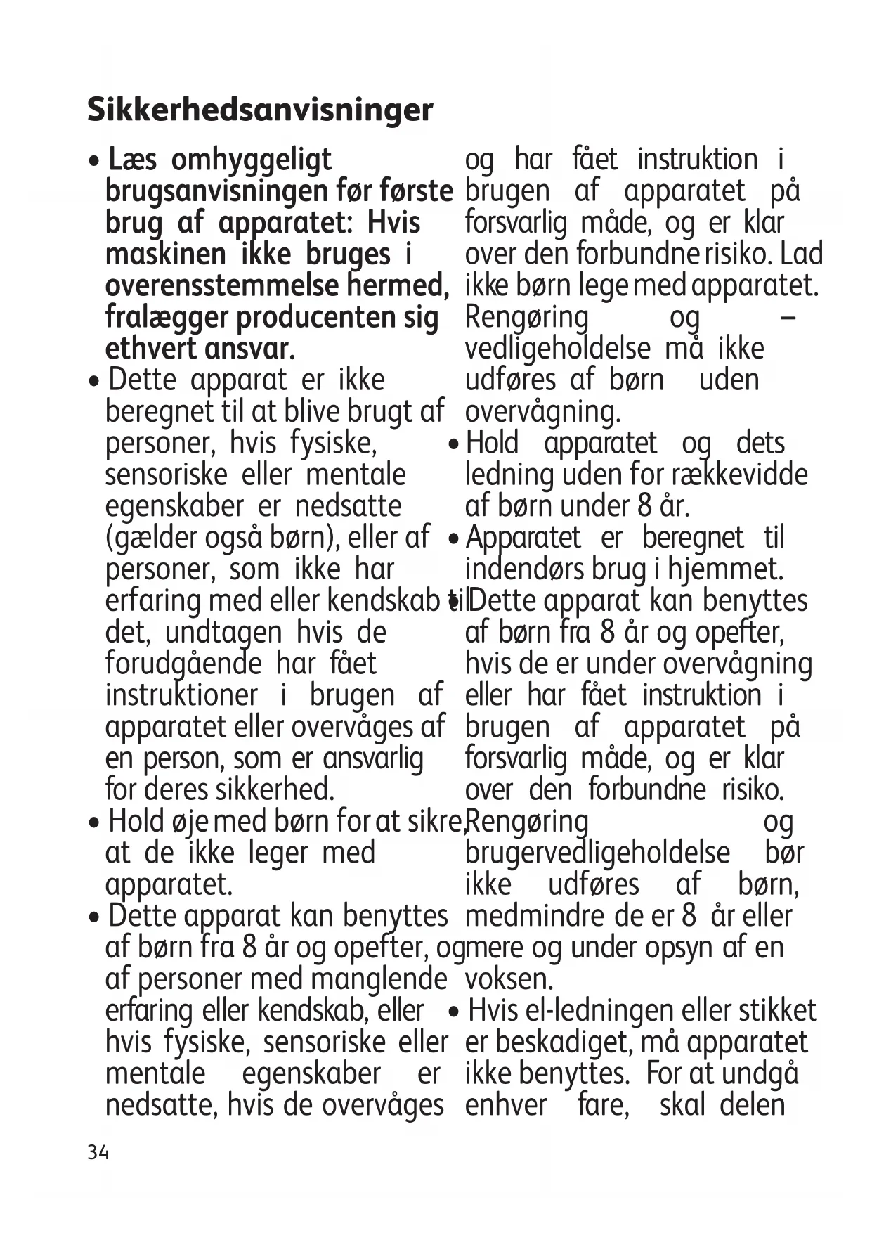 - Dette apparat kan benyttes af børn fra 8 år og opefter, og af personer med manglende erfaring eller kendskab, eller hvis fysiske, sensoriske eller mentale egenskaber er nedsatte, hvis de overvåges og har fået instruktion i brugen af apparatet på forsvarlig måde, og er klar over den forbundne risiko. Lad ikke børn lege med apparatet. Rengøring og – vedligeholdelse må ikke udføres af børn uden overvågning.