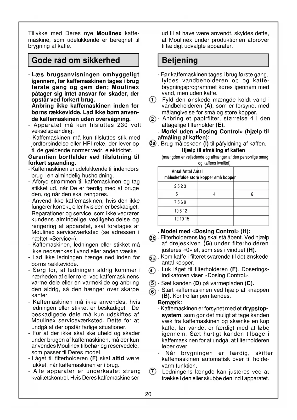 Tillykke med Deres nye Moulinex kaffe- maskine, som udelukkende er beregnet til brygning af kaffe. Gode råd om sikkerhed - Læs brugsanvisningen omhyggeligt igennem, før kaffemaskinen tages i brug første gang og gem den; Moulinex påtager sig intet ansvar for skader, der opstår ved forkert brug. - Anbring ikke kaffemaskinen inden for børns rækkevidde. Lad ikke børn anven- de kaffemaskinen uden overvågning. - Apparatet må kun tilsluttes 230 volt vekselspænding. - Kaffemaskinen må kun tilsluttes stik med jordforbindelse eller HFI-relæ, der lever op til de gældende normer vedr. elektricitet. Garantien bortfalder ved tilslutning til forkert spænding. - Kaffemaskinen er udelukkende til indendørs brug i en almindelig husholdning. - Afbryd strømmen til kaffemaskinen og tag stikket ud, når De er færdig med at bruge den, og når den skal rengøres. - Anvend ikke kaffemaskinen, hvis den ikke fungerer korrekt, eller hvis den er beskadiget. Reparationer og service, som ikke vedrører kundens almindelige vedligeholdelse og rengøring af apparatet, skal foretages af Moulinex serviceværksted (se adressen i hæftet «Service»). - Kaffemaskinen, ledningen eller stikket må ikke nedsænkes i vand eller anden væske. - Lad ikke ledningen hænge ned inden for børns rækkevidde. - Sørg for, at ledningen aldrig kommer i nærheden af eller rører ved kaffemaskinens varme dele eller en varmekilde og anbring den aldrig, så den hænger over skarpe kanter. - Kaffemaskinen må ikke anvendes, hvis ledningen eller stikket er beskadiget. De beskadigede dele må kun udskiftes af Moulinex serviceværksted. Dette for at undgå at der opstår farlige situationer. - For at der ikke skal ske uheld og skader under brugen af kaffemaskinen, må der kun anvendes Moulinex tilbehør og reservedele, som passer til Deres model. - Låget til filterholderen (F) skal altid være lukket, når kaffemaskinen er i brug. - Alle apparater er underkastet streng kvalitetskontrol. Hvis Deres kaffemaskine ser ud til at have være anvendt, skyldes dette, at Moulinex under produktionen afprøver tilfældigt udvalgte apparater. Betjening - Før kaffemaskinen tages i brug første gang, fyldes vandbeholderen op og kaffe- brygningsprogrammet køres igennem med vand, men uden kaffe. - Fyld den ønskede mængde koldt vand i vandbeholderen (A), som er forsynet med målangivelse for små og store kopper. - Anbring et papirfilter, størrelse 4 i den aftagelige filterholder (E). . Model uden «Dosing Control» (hjælp til afmåling af kaffen): . Brug måleskeen (I) til påfyldning af kaffen. Hjælp til afmåling af kaffen (mængden er vejledende og afhænger af den personlige smag og kaffens kvalitet) Antal Antal Antal måleskefulde store kopper små kopper 2,5 2 3