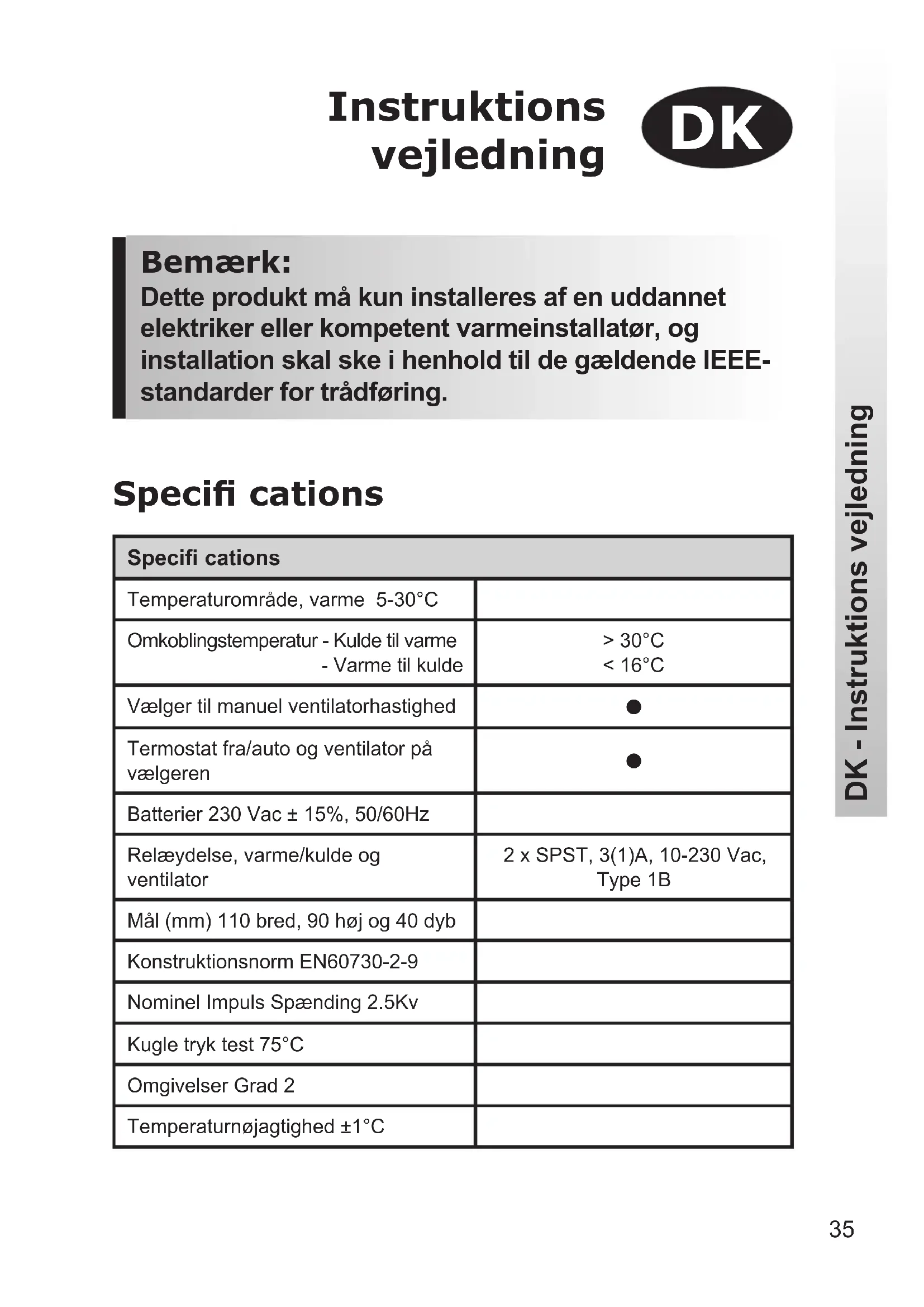 DK - Instruktions vejledning Specifi cationsTemperaturområde, varme 5-30°COmkoblingstemperatur - Kulde til varme - Varme til kulde> 30°C< 16°CVælger til manuel ventilatorhastighed Termostat fra/auto og ventilator på vælgeren Batterier 230 Vac ± 15%, 50/60HzRelæydelse, varme/kulde og ventilator2 x SPST, 3(1)A, 10-230 Vac, Type 1BMål (mm) 110 bred, 90 høj og 40 dybKonstruktionsnorm EN60730-2-9Nominel Impuls Spænding 2.5KvKugle tryk test 75°COmgivelser Grad 2Temperaturnøjagtighed ±1°C Specifi cations36 DK - Instruktions vejledning Produktoversigt Termostaten er udviklet til brug i systemer, der er udstyret med ventilationskonvektorer med et centralt omskiftningssystem med 2 rør. Termostaten styrer en motoriseret ventil, som ved opvarmning åbnes, når der er behov for varme, og ved afkøling åbnes, når der er behov for kulde. Omskiftningen fra varme til kulde opnås automatisk ved, at temperaturen i fremløbsrøret måles. Hvis fremløbstemperaturen overstiger 30°C, fungerer termostaten som opvarmningstermostat, og hvis fremløbstemperaturen er lavere end 16°C, fungerer termostaten som afkølingstermostat. Vigtigt: Det er vigtigt, at det kredsløb, som rørsensoren er placeret i, ikke er lukket af, og at der hele tiden cirkulerer vand forbi sensoren. Det kan gøre det nødvendigt at montere en bypass ventil mellem fremløb og retur i enden af hvert kredsløb. Vejledning Fjern først vægpladen bag på enheden For at kunne montere indstiksmodulet skal der i øverste venstre hjørne af vægpladen være en afstand på mindst 50 mm over vægpladen og 100 mm under vægpladen. !37 Monter den i en højde på ca. 1,5 m fra gulvet væk fra lufttræks- eller varmekilder såsom radiatorer, åben ild eller direkte sollys. Rørsensorens placering Monter rørsensoren på gennemstrømningsrøret ved hjælp af den medfølgende fastspændingsrem. Vigtigt: Det er vigtigt, at det kredsløb, som rørsensoren er placeret i, ikke er lukket af, og at der hele tiden cirkulerer vand forbi sensoren. Det kan gøre det nødvendigt at montere en bypass ventil mellem fremløb og retur i enden af hvert kredsløb.