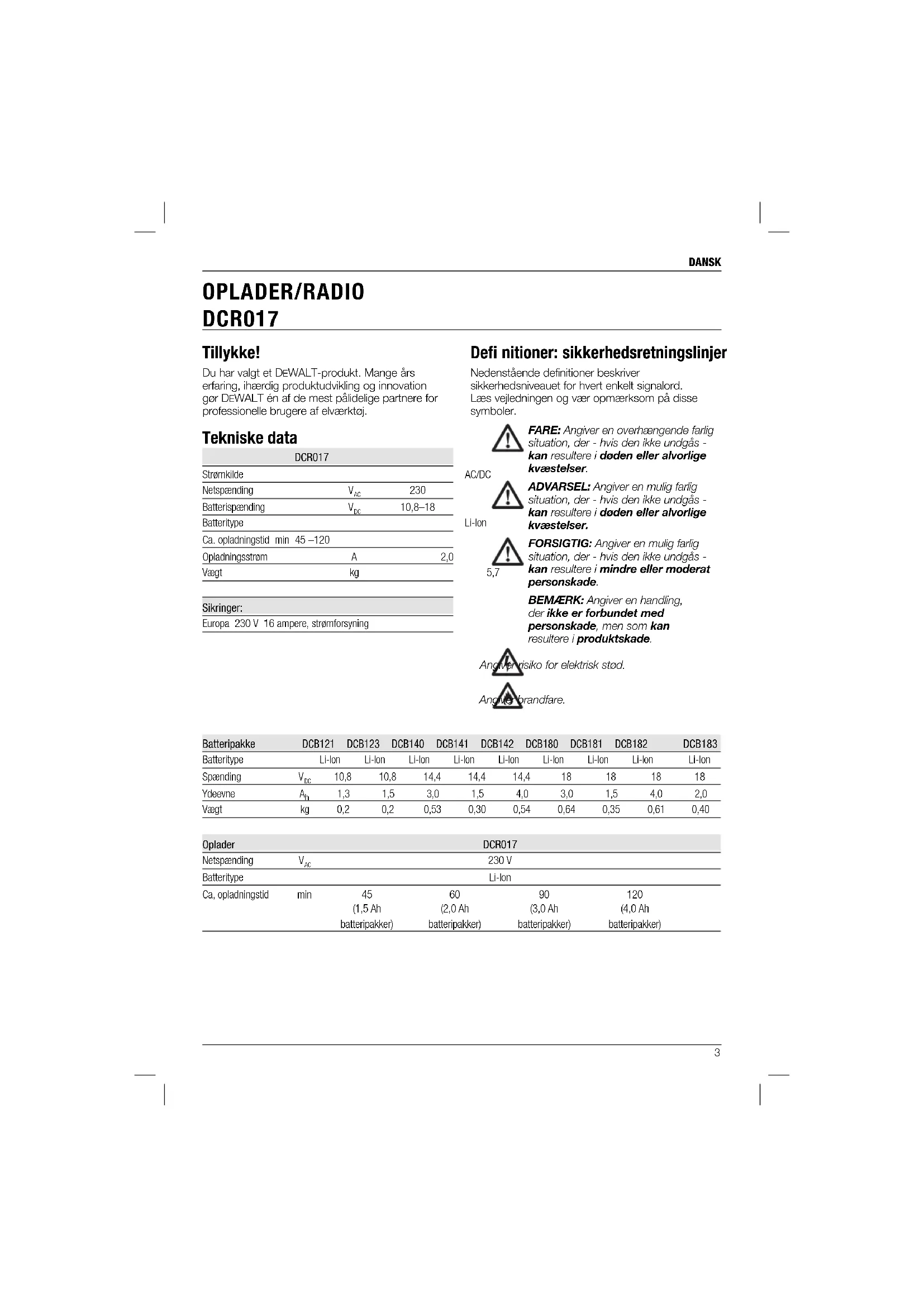 10,8–18 Batteritype Li-Ion Ca. opladningstid min 45 –120 Opladningsstrøm A 2,0 Vægt kg 5,7 Sikringer: Europa 230 V 16 ampere, strømforsyning Defi nitioner: sikkerhedsretningslinjer Nedenstående definitioner beskriver sikkerhedsniveauet for hvert enkelt signalord. Læs vejledningen og vær opmærksom på disse symboler. FARE: Angiver en overhængende farlig situation, der - hvis den ikke undgås - kan resultere i døden eller alvorlige kvæstelser. ADVARSEL: Angiver en mulig farlig situation, der - hvis den ikke undgås - kan resultere i døden eller alvorlige kvæstelser. FORSIGTIG: Angiver en mulig farlig situation, der - hvis den ikke undgås - kan resultere i mindre eller moderat personskade. BEMÆRK: Angiver en handling, der ikke er forbundet med personskade, men som kan resultere i produktskade. Angiver risiko for elektrisk stød. Angiver brandfare. OPLADER/RADIO DCR017 Batteripakke DCB121 DCB123 DCB140 DCB141 DCB142 DCB180 DCB181 DCB182 DCB183 Batteritype Li-Ion Li-Ion Li-Ion Li-Ion Li-Ion Li-Ion Li-Ion Li-Ion Li-Ion Spænding
