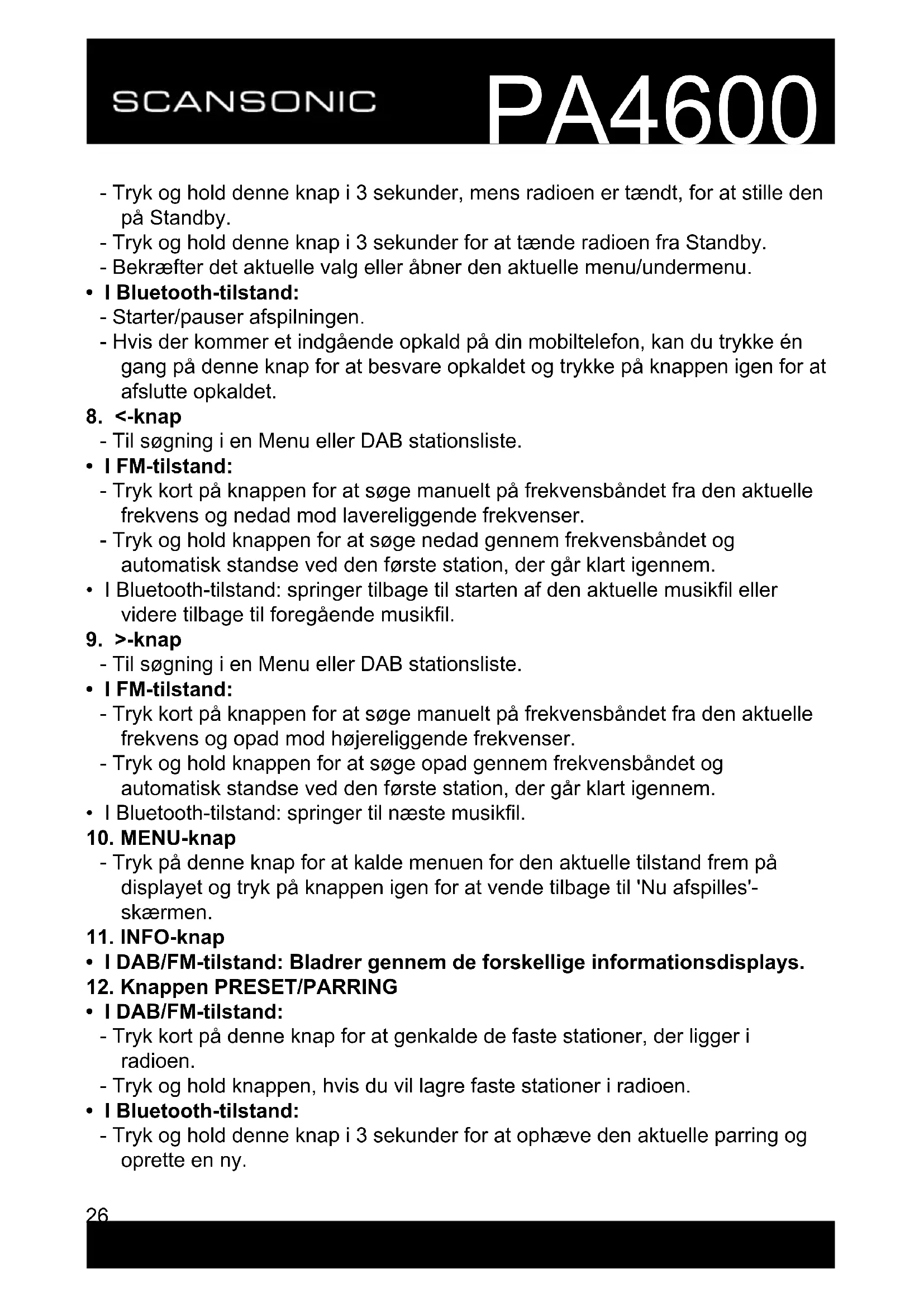 -enhed. Bluetooth-enheden er næsten udenfor PA4600 rækkevidde Flyt din Bluetooth-enhed tættere på PA460042 PA4600 SPECIFIKATIONER SPECIFIKATIONER Strømforsyning (medfølger) Indgangsspænding AC 100-240 V, 50/60 Hz Udgangsspænding DC 5V 1,5A Batterikapacitet (medfølger) 1050 mAH Afspilningstid (med batteri) 3,5 Timer Strømforbrug 8 W Standby Strømforbrug <1 W DAB Frekvensområde 174,928-239,2 MHz FM Frekvensområde 87,5-108MHz Bluetoothunderstøttelse V2.1+ EDR Bluetooth rækkevidde op til 10 meter Sendefrekvens 2,4 GHz Protokoller A2DP 1.2 Driftstemperatur -5 °C ~ +40 °C Luftfugtighed på brugssted 20% ~ 80% Ret til tekniske og designmæssige ændringer forbeholdes. Radioen undergår stadig produktudvikling. Denne radio er testet i overensstemmelse med alle relevante nugældende EU-retningslinjer, som f.eks. direktivet om elektromagnetisk kompatibilitet og lavstrømsdirektivet, og er fremstillet i overensstemmelse med de nyeste sikkerhedsbestemmelser. Made in China Imported by Dantax Radio A/S Bransagervej 15 · 9490 Pandrup · Denmark www.scansonic.dkPA4600 PA4600 Tragbares DAB+/DAB/UKW-Radio mit Bluetooth-Funktion DE Bedienungsanleitung Brand Portable DAB+/DAB/FM Radio With Bluetooth Function
