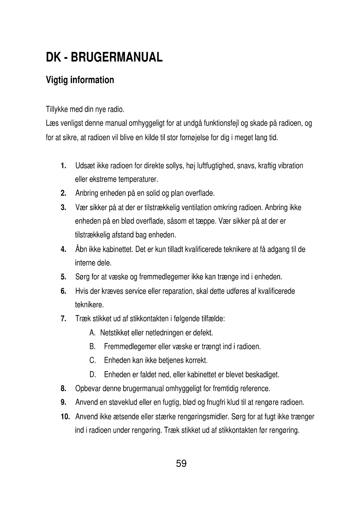 A. Netstikket eller netledningen er defekt. B. Fremmedlegemer eller væske er trængt ind i radioen. C. Enheden kan ikke betjenes korrekt. D. Enheden er faldet ned, eller kabinettet er blevet beskadiget.