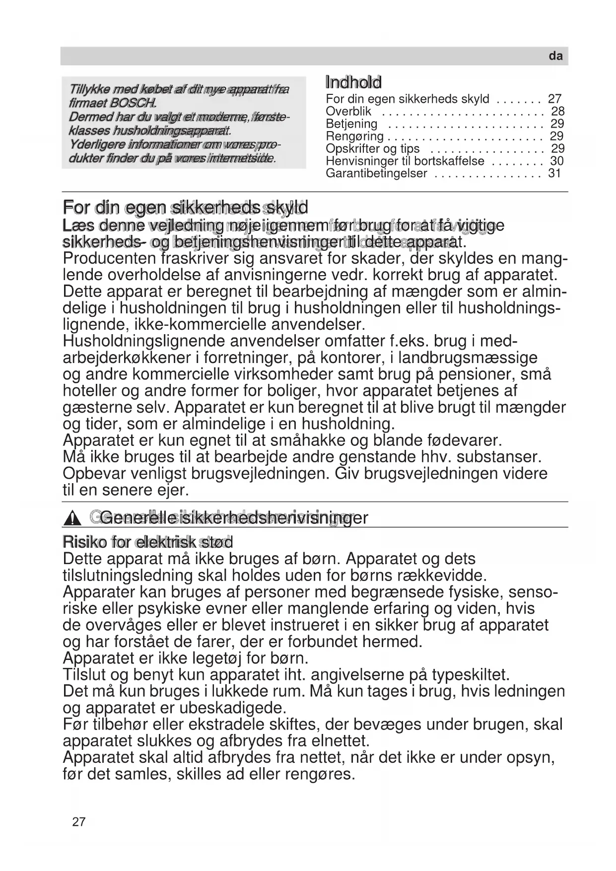 - Garantibetingelser For din egen sikkerheds skyld Læs denne vejledning nøje igennem før brug for at få vigtige sikkerheds- og betjeningshenvisninger til dette apparat. Producenten fraskriver sig ansvaret for skader, der skyldes en mang- lende overholdelse af anvisningerne vedr. korrekt brug af apparatet. Dette apparat er beregnet til bearbejdning af mængder som er almin- delige i husholdningen til brug i husholdningen eller til husholdnings- lignende, ikke-kommercielle anvendelser. Husholdningslignende anvendelser omfatter f.eks. brug i med- arbejderkøkkener i forretninger, på kontorer, i landbrugsmæssige og andre kommercielle virksomheder samt brug på pensioner, små hoteller og andre former for boliger, hvor apparatet betjenes af gæsterne selv. Apparatet er kun beregnet til at blive brugt til mængder og tider, som er almindelige i en husholdning. Apparatet er kun egnet til at småhakke og blande fødevarer. Må ikke bruges til at bearbejde andre genstande hhv. substanser. Opbevar venligst brugsvejledningen. Giv brugsvejledningen videre til en senere ejer. , Generelle sikkerhedshenvisninger Risiko for elektrisk stød Dette apparat må ikke bruges af børn. Apparatet og dets tilslutningsledning skal holdes uden for børns rækkevidde. Apparater kan bruges af personer med begrænsede fysiske, senso- riske eller psykiske evner eller manglende erfaring og viden, hvis de overvåges eller er blevet instrueret i en sikker brug af apparatet og har forstået de farer, der er forbundet hermed. Apparatet er ikke legetøj for børn. Tilslut og benyt kun apparatet iht. angivelserne på typeskiltet. Det må kun bruges i lukkede rum. Må kun tages i brug, hvis ledningen og apparatet er ubeskadigede. Før tilbehør eller ekstradele skiftes, der bevæges under brugen, skal apparatet slukkes og afbrydes fra elnettet. Apparatet skal altid afbrydes fra nettet, når det ikke er under opsyn, før det samles, skilles ad eller rengøres. p. 31