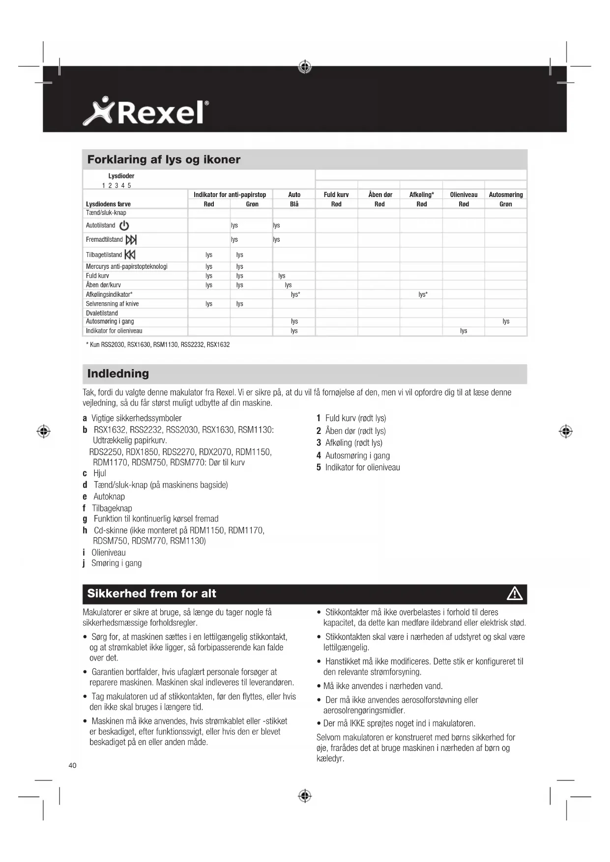 Garanti ACCO Brands garanterer, at dets produkter og dele ikke indeholder fejl i materiale og forarbejdning ved normal brug i en periode på 24 måneder fra den oprindelige købsdato. I denne periode vil vi reparere eller udskifte et defekt produkt eller en defekt del ifølge følgende garantibetingelser: Garantien gælder kun for fejl i materiale og bearbejdning ved normal brug og dækker ikke skader på produktet eller delene som følge af: Ændring, reparation, modificering eller service, der er udført af andre end et autoriseret ACCO-servicecenter. Uheld, forsømmelighed eller misbrug på grund af manglende overholdelse af de normale driftsprocedurer for et produkt af denne type. Intet i denne garanti kan medføre ophævelse af ACCOs eksklusive ansvar i forbindelse med dødsfald eller personskader på grund af ACCOs forsømmelser. Denne garanti tilbydes (ifølge disse vilkår og betingelser) som supplement til og uden indvirkning på dine lovmæssige rettigheder. Supplerende garanti ACCO Brands garanterer, at makulatorens knive er fri for fejl i materiale og forarbejdning i 10 år for model RSS2030, RSX1630, RSM1130, RSS2232 og RSX1632 og i 20 år for model RDS2250, RDX1850, RDM1150, RDM1170, RDSM750, RDSM770, RSS2270 og RDX2070 fra den oprindelige forbrugers købsdato.