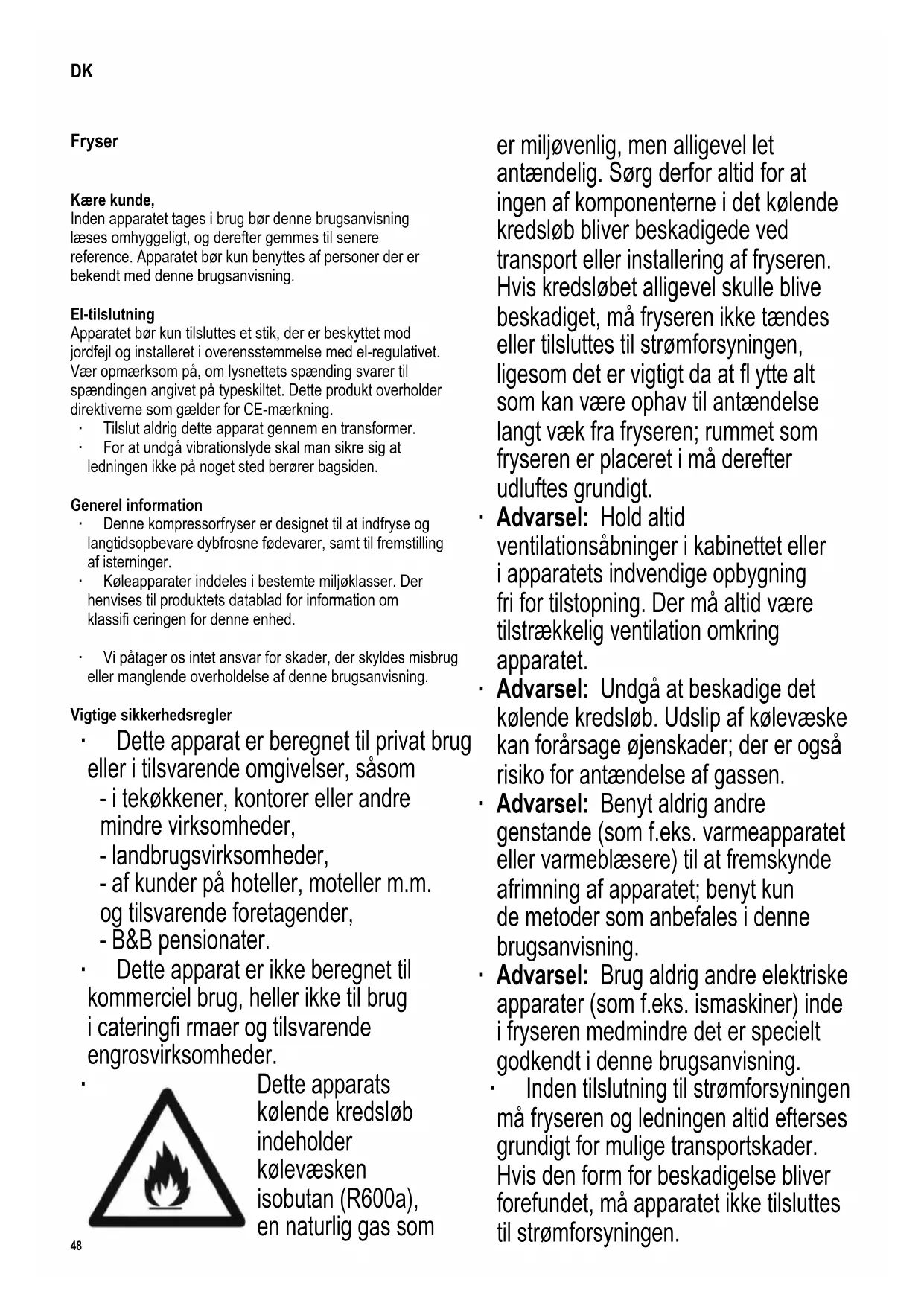 Dette apparats kølende kredsløb indeholder kølevæsken isobutan (R600a), en naturlig gas som er miljøvenlig, men alligevel let antændelig. Sørg derfor altid for at ingen af komponenterne i det kølende kredsløb bliver beskadigede ved transport eller installering af fryseren. Hvis kredsløbet alligevel skulle blive beskadiget, må fryseren ikke tændes eller tilsluttes til strømforsyningen, ligesom det er vigtigt da at fl ytte alt som kan være ophav til antændelse langt væk fra fryseren; rummet som fryseren er placeret i må derefter udluftes grundigt. ∙ Advarsel: Hold altid ventilationsåbninger i kabinettet eller i apparatets indvendige opbygning fri for tilstopning. Der må altid være tilstrækkelig ventilation omkring apparatet. ∙ Advarsel: Undgå at beskadige det kølende kredsløb. Udslip af kølevæske kan forårsage øjenskader; der er også risiko for antændelse af gassen. ∙ Advarsel: Benyt aldrig andre genstande (som f.eks. varmeapparatet eller varmeblæsere) til at fremskynde afrimning af apparatet; benyt kun de metoder som anbefales i denne brugsanvisning. ∙ Advarsel: Brug aldrig andre elektriske apparater (som f.eks. ismaskiner) inde i fryseren medmindre det er specielt godkendt i denne brugsanvisning. ∙ Inden tilslutning til strømforsyningen må fryseren og ledningen altid efterses grundigt for mulige transportskader. Hvis den form for beskadigelse bliver forefundet, må apparatet ikke tilsluttes til strømforsyningen. DK49 ∙ Dette apparat er ikke beregnet til opbevaring af eksplosive substanser såsom spraydåser med brændbar drivgas. ∙ Hvis apparatet sælges, overdrages til tredjepart eller bortskaffes til en genbrugsstation, må man gøre opmærksom på tilstedeværelse af både isoleringsmidlet ’cyclopenthan’ og kølevæsken R600a. Yderligere information om korrekt genbrug fi ndes i afsnittet om Bortskaffelse. ∙ For at overholde sikkerhedsregulativet og undgå fare, skal alle reparationer eller ændringer af denne fryser udføres af vores autoriserede servicepersonel, dette inkluderer også udskiftning af ledningen. ∙ Dette apparat kan benyttes af børn (som er mindst 8 år) og af personer med reducerede fysiske, sensoriske eller mentale evner, eller mangel på erfaring eller viden, såfremt de har fået vejledning og instruktion i brugen af dette apparat og fuldt ud forstår alle farer og forholdsregler vedrørende sikkerheden som brug af apparatet medfører. ∙ Børn må aldrig få lov til at lege med apparatet. ∙ Børn må aldrig få lov til at udføre nogen former for rengøring eller vedligehold af dette apparat medmindre de er under opsyn. ∙ Til regelmæssig rengøring anbefaler vi varmt vand med et mildt opvaskemiddel. Tilbehørsdelene bør rengøres separat med varmt sæbevand. De kan ikke tåle opvaskemaskine. ∙ For at undgå risiko for personskade eller beskadigelse af fryseren, må apparatet kun transporteres mens det er pakket ind i den originale emballage. Ved udpakning og installering er det nødvendigt at 2 personer hjælpes ad. ∙ Advarsel: Hold børn væk fra emballeringen, da denne udgør en mulig risiko for tilskadekomst, ved f.eks. kvælning. ∙ Den is som fjernes fra fryseren ved afrimning skal kasseres, den er ikke egnet til at blive spist. ∙ Ledningen bør jævnligt efterses for beskadigelse. Hvis man opdager fejl ved ledningen, må apparatet ikke længere benyttes. ∙ For at undgå brandfare, må man aldrig placere nogen form for elektriske apparater ovenpå fryseren. Placer heller aldrig nogen beholdere med væske ovenpå apparatet: Dette for at undgå at lækage eller væskespild skal kunne beskadige isoleringen på det elektriske kredsløb. ∙ Dette apparat er kun designet til opbevaring af fødevarer. ∙ Alkohol må kun opbevares i tæt forseglede beholdere og skal altid stå oprejst. ∙ Opbevar aldrig glasfl asker med kulsyreholdige eller andre væsker, som kan indfryses i fryseren: Den slags fl asker kan sprænges under indfrysningen. ∙ For at undgå risiko for madforgiftning, bør man aldrig spise fødevarer hvor holdbarhedsdatoen er overskredet. Optøede madvarer må aldrig indfryses igen. ∙ Man må aldrig hænge i eller lægge urimelig meget vægt på hylderne, skufferne, døren etc. ∙ Beskyt altid fryserens indre mod åben ild og alle andre kilder til antændelse. ∙ Tag altid stikket ud af stikkontakten - i tilfælde af fejlfunktion, - inden afrimning, - under rengøring, - inden vedligehold eller reparationer udføres. ∙ Træk aldrig i selve ledningen, når ledningen tages ud af stikkontakten; tag altid fat i selve stikket. ∙ Hvis apparatet ikke benyttes i en længere periode, anbefaler vi at døren står åben. ∙ Vi forbeholder os ret til at ændre apparatets specifi kationer. Oversigt