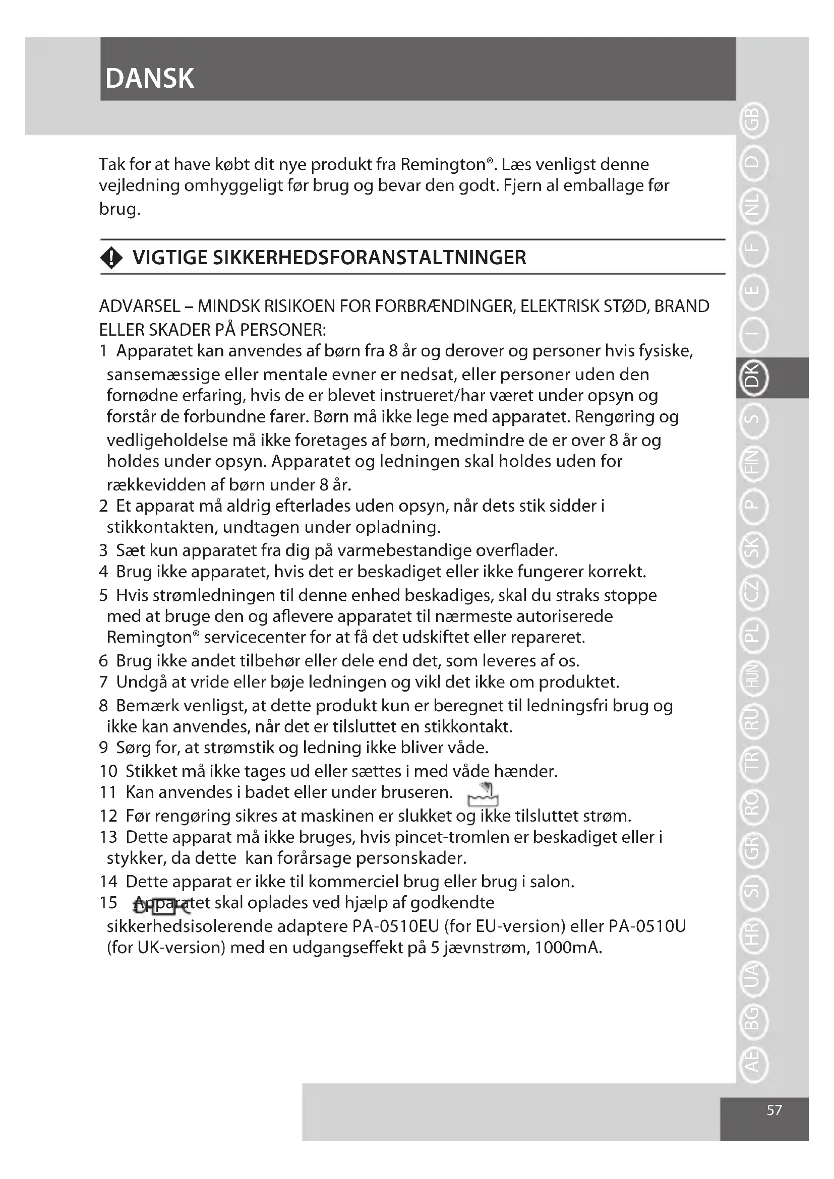 ADVARSEL – MINDSK RISIKOEN FOR FORBRÆNDINGER, ELEKTRISK STØD, BRAND ELLER SKADER PÅ PERSONER: 1 Apparatet kan anvendes af børn fra 8 år og derover og personer hvis fysiske, sansemæssige eller mentale evner er nedsat, eller personer uden den fornødne erfaring, hvis de er blevet instrueret/har været under opsyn og forstår de forbundne farer. Børn må ikke lege med apparatet. Rengøring og vedligeholdelse må ikke foretages af børn, medmindre de er over 8 år og holdes under opsyn. Apparatet og ledningen skal holdes uden for rækkevidden af børn under 8 år. 2 Et apparat må aldrig efterlades uden opsyn, når dets stik sidder i stikkontakten, undtagen under opladning. 3 Sæt kun apparatet fra dig på varmebestandige overflader. 4 Brug ikke apparatet, hvis det er beskadiget eller ikke fungerer korrekt. 5 Hvis strømledningen til denne enhed beskadiges, skal du straks stoppe med at bruge den og aflevere apparatet til nærmeste autoriserede Remington® servicecenter for at få det udskiftet eller repareret. 6 Brug ikke andet tilbehør eller dele end det, som leveres af os. 7 Undgå at vride eller bøje ledningen og vikl det ikke om produktet. 8 Bemærk venligst, at dette produkt kun er beregnet til ledningsfri brug og ikke kan anvendes, når det er tilsluttet en stikkontakt. 9 Sørg for, at strømstik og ledning ikke bliver våde. 10 Stikket må ikke tages ud eller sættes i med våde hænder. 11 Kan anvendes i badet eller under bruseren. 12 Før rengøring sikres at maskinen er slukket og ikke tilsluttet strøm. 13 Dette apparat må ikke bruges, hvis pincet-tromlen er beskadiget eller i stykker, da dette kan forårsage personskader. 14 Dette apparat er ikke til kommerciel brug eller brug i salon. 15 Apparatet skal oplades ved hjælp af godkendte sikkerhedsisolerende adaptere PA-0510EU (for EU-version) eller PA-0510U (for UK-version) med en udgangseffekt på 5 jævnstrøm, 1000mA. DANSK GBDNLFEIDKSFINPSKCZ HUN PLRUTRROGRSIBG HRUAAE58 C HOVEDFUNKTIONER 1 Pincet 2 Hætte med perfekt vinkel 3 Aftageligt vaskbart hoved 4 Drejbart hoved 5 Detaljelys 6 Tænd-/slukknap-2 hastigheder 7 Indikatorlampe for lavt batteri/opladning 8 Strømstik 9 Knap til hovedafkobling 10 Skridsikkert greb 11 Detaljehætte 12 Massagehætte med aloe vera 13 Bikinikam 14 Shaverhoved 15 Pedicurehoved 16 Eksfolierende børstehoved 17 Rengøringsbørste (ikke vist) 18 Opbevaringstaske (ikke vist) 19 Strømadapter (ikke vist)