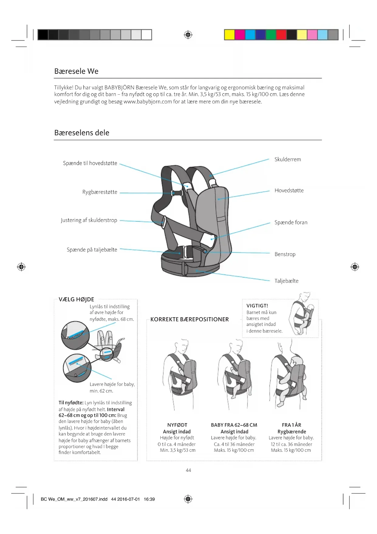 Ansigt indad Lavere højde for baby. Ca. 4 til 36 måneder Maks. 15 kg/100 cm FRA 1 ÅR Rygbærende Lavere højde for baby. 12 til ca. 36 måneder Maks. 15 kg/100 cm BC We_OM_ww_v7_201607.indd 44 2016-07-01 16:3944