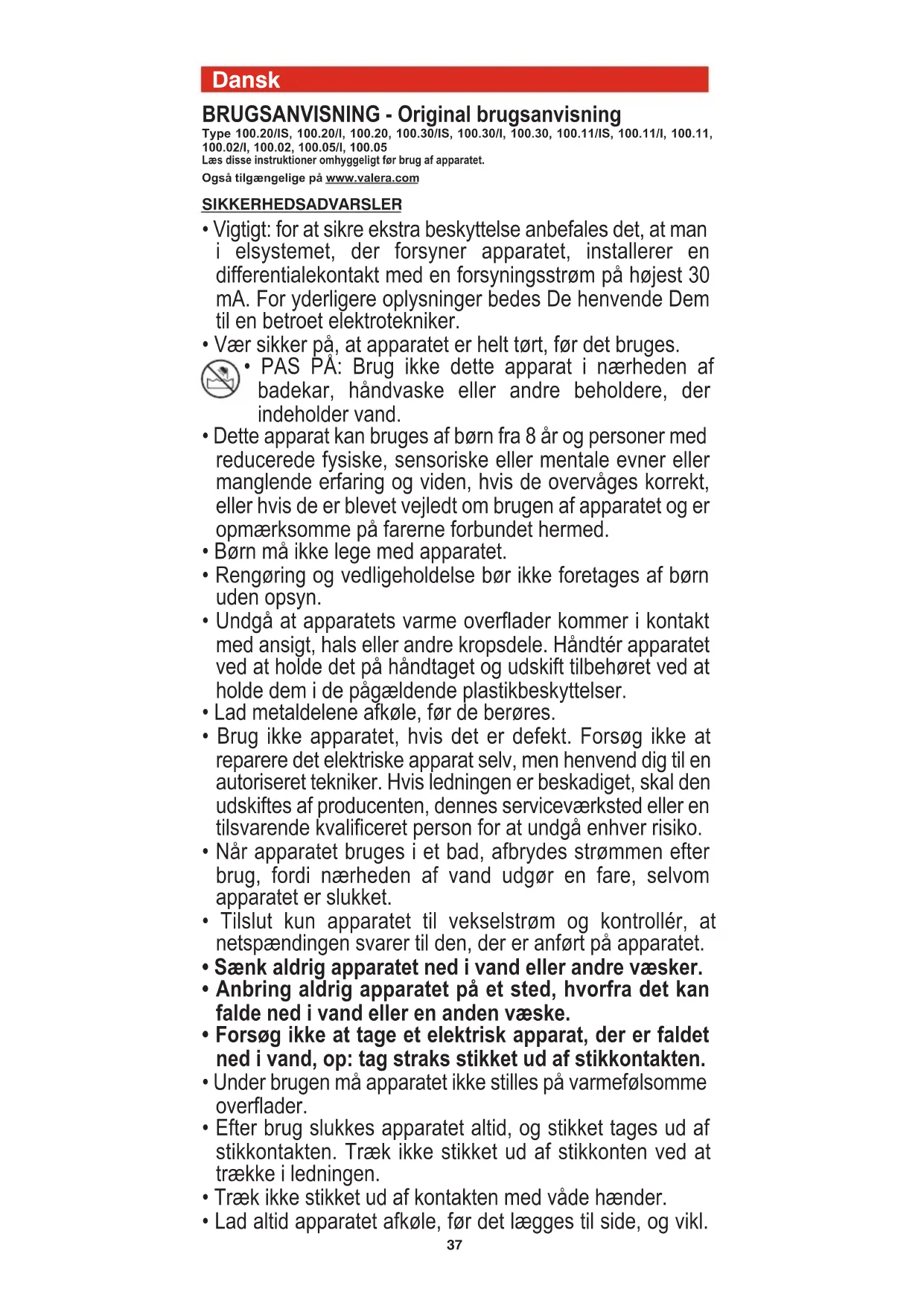 - Dette apparat kan bruges af børn fra 8 år og personer med reducerede fysiske, sensoriske eller mentale evner eller manglende erfaring og viden, hvis de overvåges korrekt, eller hvis de er blevet vejledt om brugen af apparatet og er opmærksomme på farerne forbundet hermed.