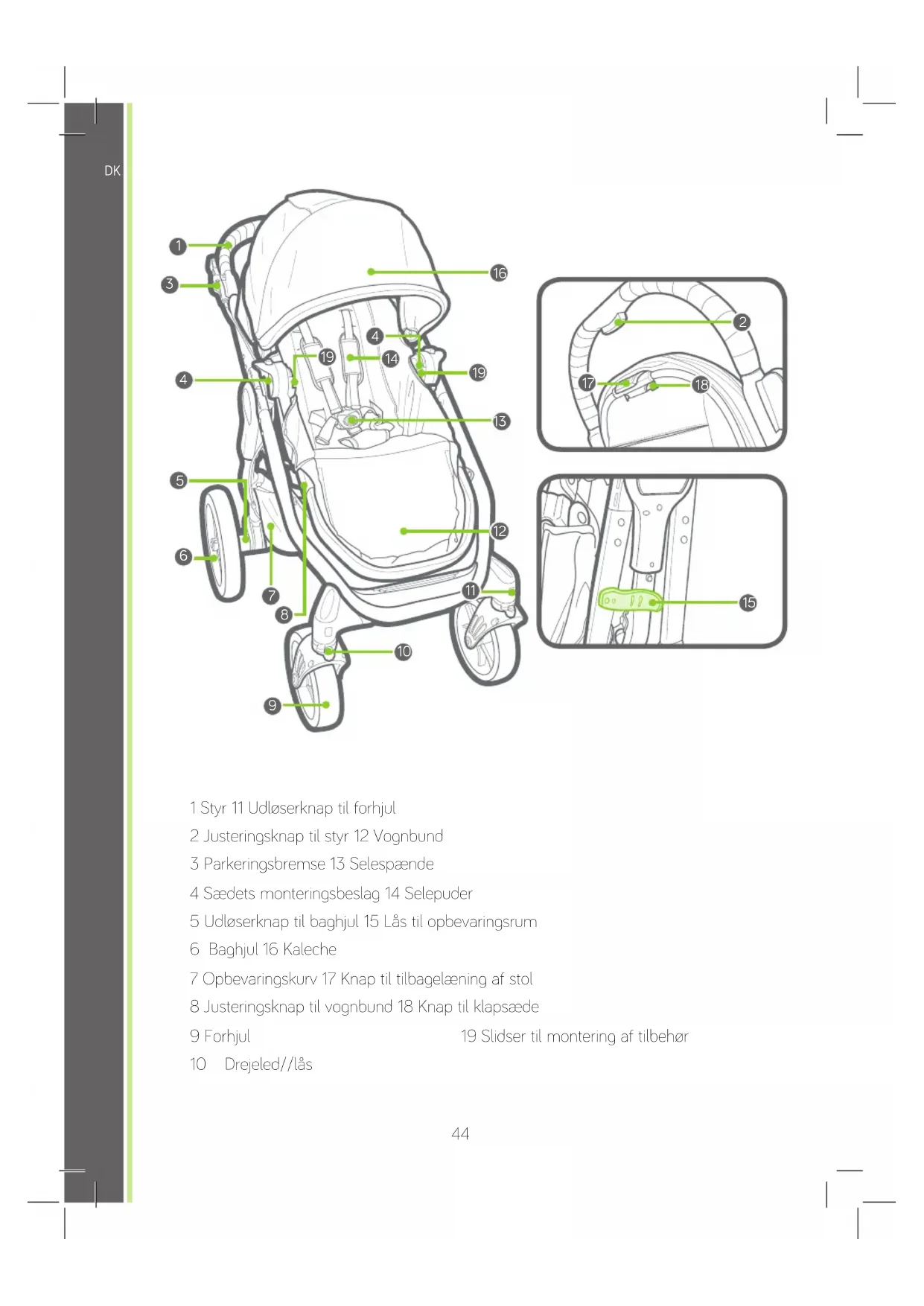 1 Styr 11 Udløserknap til forhjul 2 Justeringsknap til styr 12 Vognbund 3 Parkeringsbremse 13 Selespænde 4 Sædets monteringsbeslag 14 Selepuder 5 Udløserknap til baghjul 15 Lås til opbevaringsrum 6 Baghjul 16 Kaleche 7 Opbevaringskurv 17 Knap til tilbagelæning af stol 8 Justeringsknap til vognbund 18 Knap til klapsæde 9 Forhjul 19 Slidser til montering af tilbehør 10 Drejeled//lås