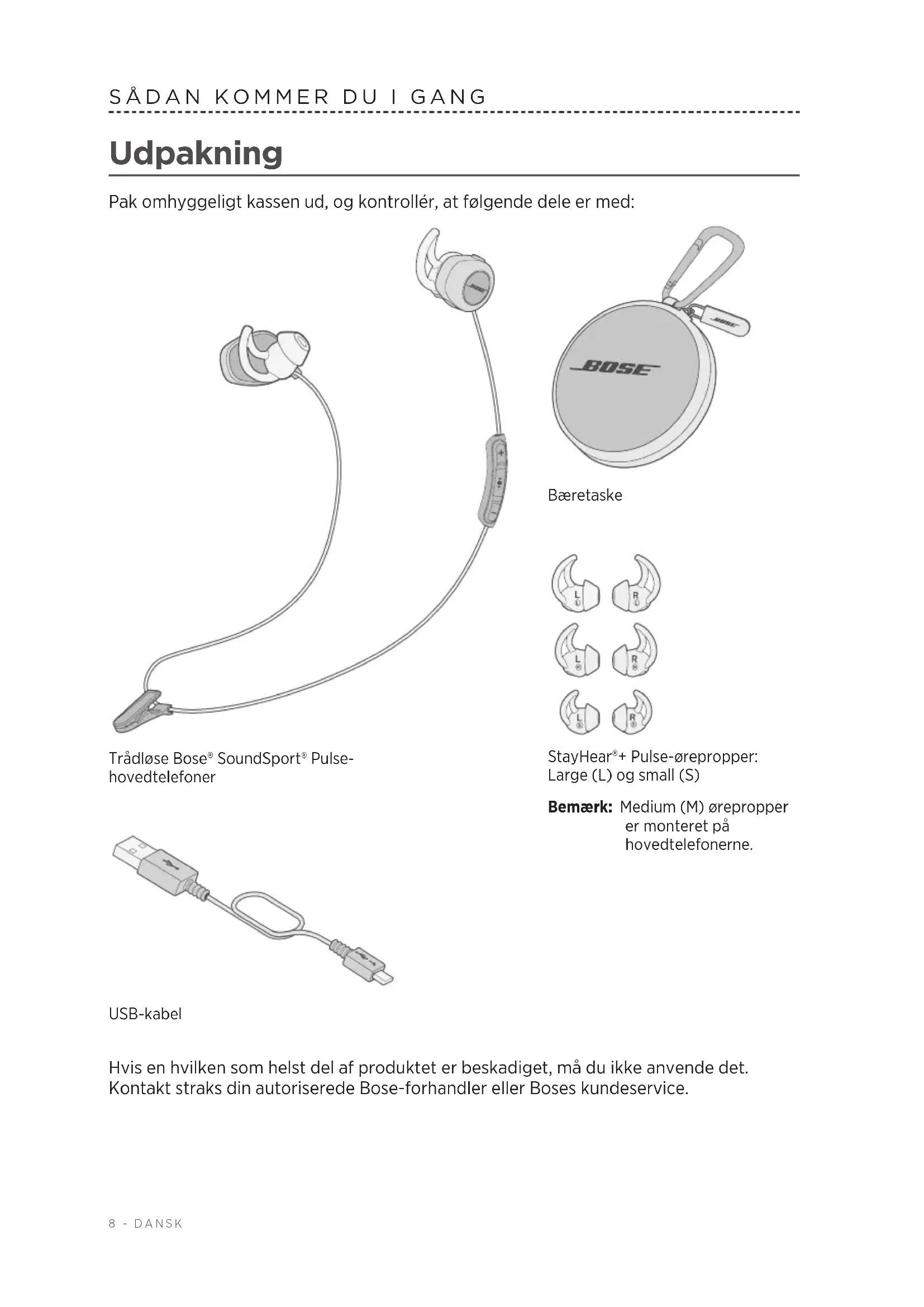 Udpakning Pak omhyggeligt kassen ud, og kontrollér, at følgende dele er med: StayHear®+ Pulse-ørepropper: Large (L) og small (S) Bemærk: Medium (M) ørepropper er monteret på hovedtelefonerne. Trådløse Bose® SoundSport® Pulse- hovedtelefoner Bæretaske USB-kabel Hvis en hvilken som helst del af produktet er beskadiget, må du ikke anvende det. Kontakt straks din autoriserede Bose-forhandler eller Boses kundeservice.DANSK - 9