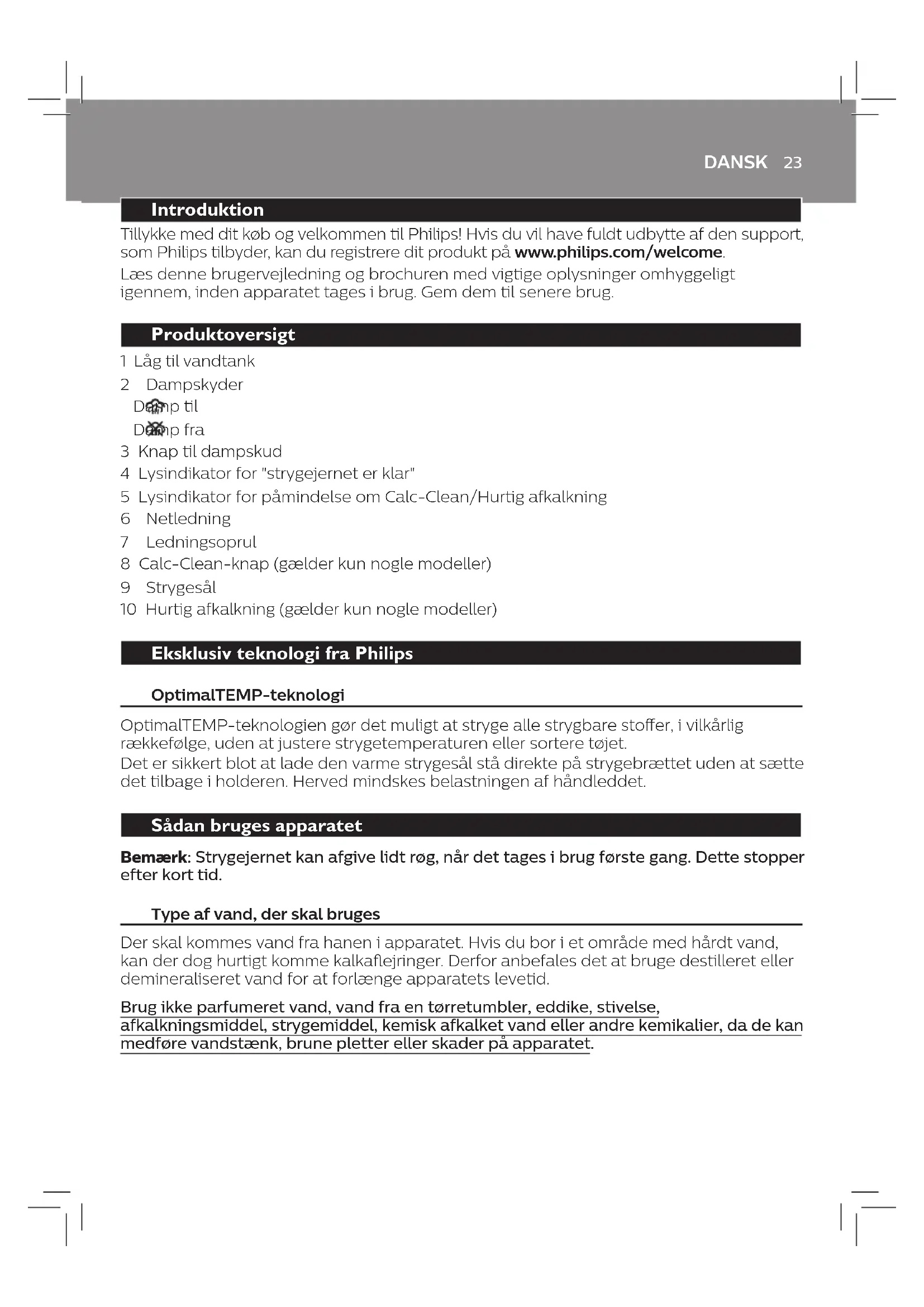Problem Mulig årsag Løsning Strygejernet er endnu ikke varmt nok til at producere damp. Vent, indtil lysindikatoren for "strygejernet er klar" stopper luftindsugningstilstanden og lyser konstant. Beklædningen på strygebrættet bliver våd, eller der dannes vanddråber på stoet under strygning. Dampen har dannet kondens på strygebrættet efter længere tids strygning. Udskift beklædningen på strygebrættet, hvis skummaterialet er slidt op. Du kan også lægge et ekstra lag lt under strygebrættets beklædning for at undgå kondens på strygebrættet. Du kan købe lt i en stofbutik. Beklædningen på dit strygebræt er ikke beregnet til at tåle den store mængde damp fra apparatet. Sæt et ekstra lag lt under strygebrættets beklædning for at undgå kondens på strygebrættet. Du kan købe lt i en stofbutik. Der drypper vand på tøjet under strygning. Du har anvendt dampskudsfunktionen for ofte inden for en kort periode. Fortsæt strygningen i vandret position, og vent lidt, før du bruger dampskudsfunktionen igen. Vandtankens låg er ikke lukket ordentligt. Tryk på låget, til der høres et "klik". Du har ikke sat Hurtig afkalkning- opsamleren korrekt ind i apparatet (gælder kun nogle modeller). Stop strygningen, og lad strygejernet køle ned i mindst 1 time. Tag Hurtig afkalkning-opsamleren ud. Sæt den tilbage i apparatet, og kontroller, at opsamleren ugter med apparatets overade. Tryk udløseren ned ("klik"). Hvis Hurtig afkalkning-opsamleren er beskadiget, skal du kontakte et kundecenter i dit land (se folderen om den verdensomspændende garanti for kontaktoplysninger). Strygejernet producerer ikke dampskud. Du har anvendt dampskudsfunktionen for ofte inden for en kort periode. Fortsæt strygningen i vandret position, og vent lidt, før du bruger dampskudsfunktionen igen. Strygejernet er endnu ikke varmt nok til strygning. Vent, indtil lysindikatoren for "strygejernet er klar" stopper luftindsugningstilstanden og lyser konstant. Du har hældt et kemikalie i vandtanken. Skyl vandtanken, og undlad at hælde parfume eller kemikalier i vandtanken. Der kommer snavset vand og urenheder ud fra strygesålen under strygning. Hårdt vand med urenheder eller kemikalier har dannet kalkaejringer inde i strygesålen. Foretag Hurtig afkalkning (gælder kun nogle modeller) eller Calc-Clean (gælder kun nogle modeller). Se kapitlet "Rengøring og vedligeholdelse". Der drypper vand ud af strygesålen, efter at strygejernets stik er taget ud af stikkontakten. Strygejernet står vandret, og der er stadig vand i vandtanken. Tøm vandtanken efter brug, eller hold strygejernet i lodret position. Dampskyderen er indstillet til . Indstil dampskyderen til . En gul lampe blinker på strygejernets håndtag. Lysindikatoren for påmindelse om Calc-Clean aktiveres. Dette er for at minde dig om at foretage afkalkning. Foretag Hurtig afkalkning (gælder kun nogle modeller) eller Calc-Clean (gælder kun nogle modeller). Se kapitlet "Rengøring og vedligeholdelse". Strygejernet efterlader glans eller mærker på stoet. Stoets overade var ujævn, f.eks. fordi du strøg oven på en søm eller en fold. Strygejernet er sikkert at bruge på alt tøj, der tåler strygning. Glansen eller mærket er ikke permanent og forsvinder, når du vasker tøjet. Undgå at stryge hen over sømme og folder. Du kan også anbringe et stykke bomuldsstof over området, der skal stryges, for at undgå mærker.27 SUOMI Johdanto Onnittelut hankinnastasi ja tervetuloa Philips-tuotteiden käyttäjäksi! Saat parhaan mahdollisen hyödyn Philipsin palveluista rekisteröimällä tuotteen osoitteessa www.philips.com/welcome. Lue tämä käyttöopas ja Tärkeitä tietoja -lehtinen huolellisesti ennen laitteen käyttöä. Säilytä ne myöhempää tarvetta varten. Tuotteen yleiskuvaus 1 Vesisäiliön kansi 2 Höyrystimen säädin Höyrystin käytössä Höyrystin ei käytössä 3 Höyrysuihkauspainike 4 Silitysrauta valmis -merkkivalo 5 Calc-Clean- / Quick Calc Release -merkkivalo 6 Virtajohto 7 Johtokela 8 Calc-Clean-painike (vain tietyissä malleissa) 9 Pohja 10 Quick Calc Release (vain tietyissä malleissa) Ainutlaatuista Philips-tekniikkaa OptimalTEMP-tekniikka OptimalTEMP-tekniikka mahdollistaa kaikkien silitystä kestävien kangastyyppien silittämisen ilman silityslämpötilan tai vaatteiden lajittelua. Kuuman pohjan voi jättää turvallisesti silityslautaa vasten ilman silitysraudan laskualustaa. Tämä vähentää ranteen rasitusta. Käyttö Huomautus: Ensimmäisellä käyttökerralla silitysrauta saattaa hieman kärytä. Tämä loppuu vähän ajan kuluttua. Käytettävä vesityyppi Tämä laite on suunniteltu käyttämään vesijohtovettä. Jos asut alueella, jossa on kova vesi, kalkkia voi muodostua nopeasti. Tästä syystä suosittelemme, että laitteessa käytetään tislattua tai demineralisoitua vettä. Tämä pidentää laitteen käyttöikää. Älä käytä hajustettua vettä, kuivausrummun vettä tai vettä, johon on lisätty etikkaa, tärkkiä, kalkinpoistoaineita, silitysaineita, kemiallisesti puhdistettua vettä tai muita kemikaaleja, koska se voi vahingoittaa laitetta tai aiheuttaa veden pirskahtelua ja ruskeita tahroja silitettävään kankaaseen.SUOMI