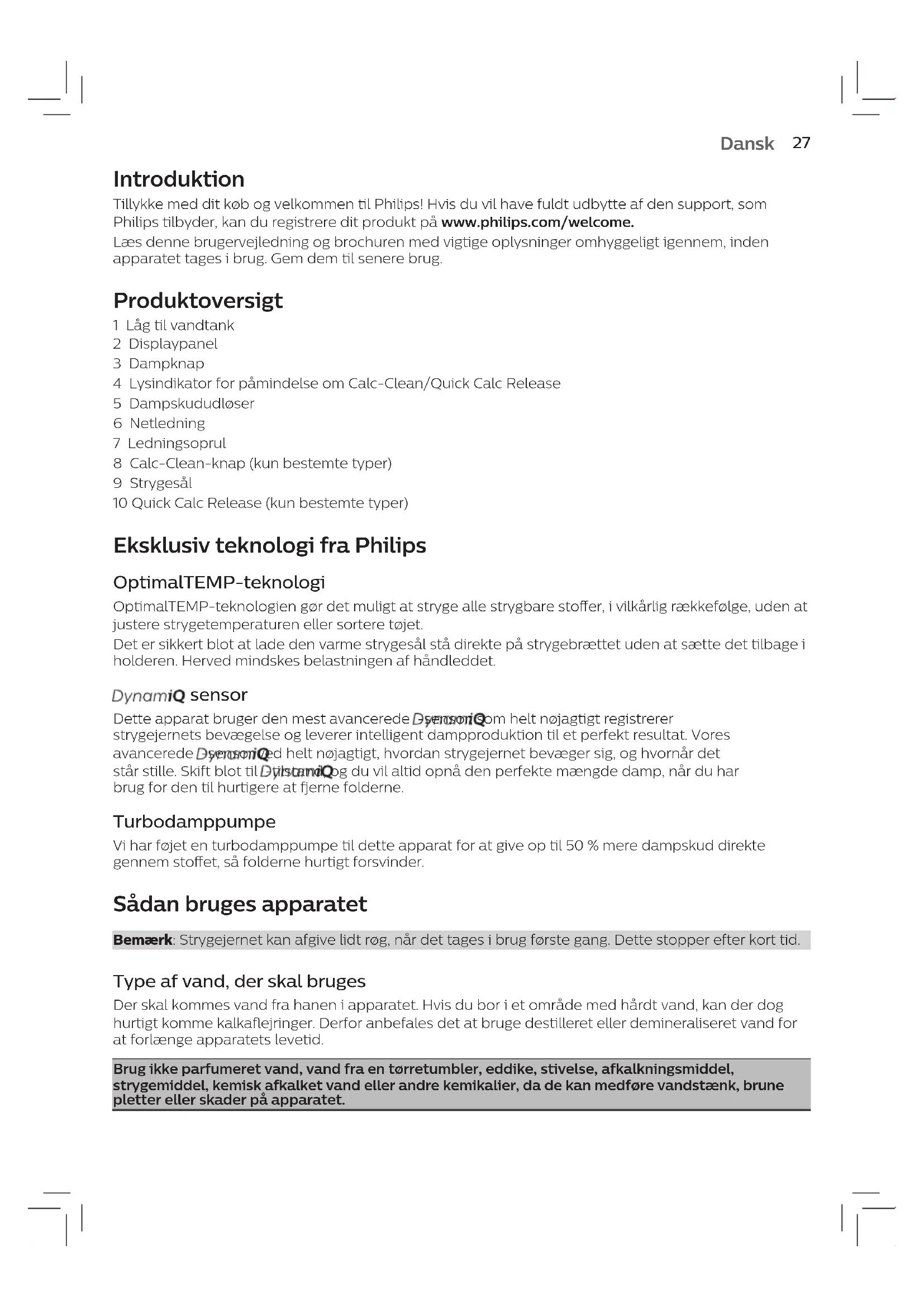 NederlandsIntroduktion Tillykke med dit køb og velkommen til Philips! Hvis du vil have fuldt udbytte af den support, som Philips tilbyder, kan du registrere dit produkt på www.philips.com/welcome. Læs denne brugervejledning og brochuren med vigtige oplysninger omhyggeligt igennem, inden apparatet tages i brug. Gem dem til senere brug. Produktoversigt 1 Låg til vandtank 2 Displaypanel 3 Dampknap 4 Lysindikator for påmindelse om Calc-Clean/Quick Calc Release 5 Dampskududløser 6 Netledning 7 Ledningsoprul 8 Calc-Clean-knap (kun bestemte typer) 9 Strygesål 10 Quick Calc Release (kun bestemte typer) Eksklusiv teknologi fra Philips OptimalTEMP-teknologi OptimalTEMP-teknologien gør det muligt at stryge alle strygbare stoer, i vilkårlig rækkefølge, uden at justere strygetemperaturen eller sortere tøjet. Det er sikkert blot at lade den varme strygesål stå direkte på strygebrættet uden at sætte det tilbage i holderen. Herved mindskes belastningen af håndleddet. sensor Dette apparat bruger den mest avancerede -sensor, som helt nøjagtigt registrerer strygejernets bevægelse og leverer intelligent dampproduktion til et perfekt resultat. Vores avancerede -sensor ved helt nøjagtigt, hvordan strygejernet bevæger sig, og hvornår det står stille. Skift blot til -tilstand, og du vil altid opnå den perfekte mængde damp, når du har brug for den til hurtigere at fjerne folderne. Turbodamppumpe Vi har føjet en turbodamppumpe til dette apparat for at give op til 50 % mere dampskud direkte gennem stoet, så folderne hurtigt forsvinder. Sådan bruges apparatet Bemærk: Strygejernet kan afgive lidt røg, når det tages i brug første gang. Dette stopper efter kort tid. Type af vand, der skal bruges Der skal kommes vand fra hanen i apparatet. Hvis du bor i et område med hårdt vand, kan der dog hurtigt komme kalkaejringer. Derfor anbefales det at bruge destilleret eller demineraliseret vand for at forlænge apparatets levetid. Brug ikke parfumeret vand, vand fra en tørretumbler, eddike, stivelse, afkalkningsmiddel, strygemiddel, kemisk afkalket vand eller andre kemikalier, da de kan medføre vandstænk, brune pletter eller skader på apparatet.