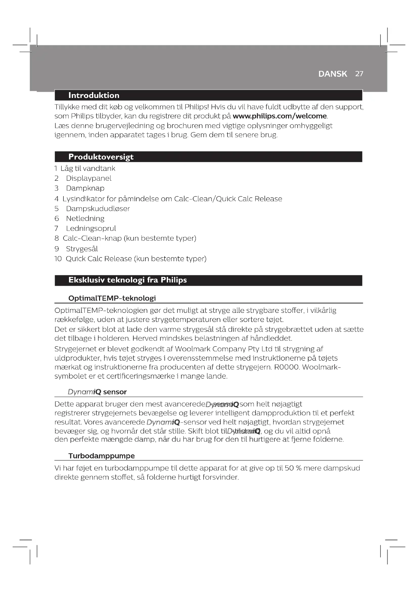 Sådan bruges apparatet Bemærk: Strygejernet kan afgive lidt røg, når det tages i brug første gang. Dette stopper efter kort tid. Type af vand, der skal bruges Der skal kommes vand fra hanen i apparatet. Hvis du bor i et område med hårdt vand, kan der dog hurtigt komme kalkaejringer. Derfor anbefales det at bruge destilleret eller demineraliseret vand for at forlænge apparatets levetid. Brug ikke parfumeret vand, vand fra en tørretumbler, eddike, stivelse, afkalkningsmiddel, strygemiddel, kemisk afkalket vand eller andre kemikalier, da de kan medføre vandstænk, brune pletter eller skader på apparatet. Strygbare materialer 1 Kontroller, om tøjet kan stryges ved at læse mærkaten på stoet (g. 1-3). Stryg ikke materialer, der ikke er beregnet til strygning. Tryk på tøjet kan heller ikke stryges. Dampindstillinger 1 Vip strygejernet en smule opad (ca. 20 grader og mere) for at ændre dampindstillingerne, og tryk på dampknappen oven på håndtaget (g. 1-5) Bemærk: Alle dampindstillinger er udstyret med OptimalTEMP-teknologi og er sikre at anvende på alle stoer, der kan stryges. - ( -indstilling) (g. 1-6): Ved hjælp af -sensoren produceres den perfekte mængde damp automatisk, når der er brug for den under strygejernets bevægelse. Dampproduktionen stopper, når strygejernet ikke bevæges eller stilles i lodret position. Det anbefales at bruge -indstillingen, der giver den ultimative komfort på alt tøj. - (MAX-indstilling) (g. 1-7): Der leveres kontinuerligt maksimal damp til genstridige folder. For at opnå det bedste resultat på vanskelige stoer som f.eks. bomuld, cowboybukser og linned anbefales det at bruge MAX-indstillingen. Dampproduktionen stopper, når strygejernet stilles i lodret position. - (ECO-indstilling) (kun bestemte typer) (g. 1-8): Der leveres kontinuerligt et minimum af damp til stoer med færre folder. Denne indstilling sparer samtidig energi. Dampproduktionen stopper, når strygejernet stilles i lodret position. - (ionisk indstilling) (kun bestemte typer) (g. 1-9): Dybe og kraftfulde ioniske dampskud udsendes for at gøre strygningen mere hygiejnisk. - (indstilling for damp fra) (g. 1-10): Vælg denne indstilling for at stryge uden damp. Tip: Ved alle dampindstillinger kan du trykke på dampknappen under strygningen for at få mere damp. Auto-sluk Auto-sluk-sikkerhedsfunktionen slukker automatisk for apparatet, hvis det ikke har været brugt i 2 minutter, mens det står på strygesålen, eller i 8 minutter, mens det står på bagpladen. Displaypanelet blinker for at indikere, at apparatet er i auto-sluk-tilstand. Løft apparatet, eller bevæg det en lille smule for få strygejernet til at varme op igen. Displaypanelet skifter til luftindsugningstilstand, og apparatet begynder at varme op.DANSK