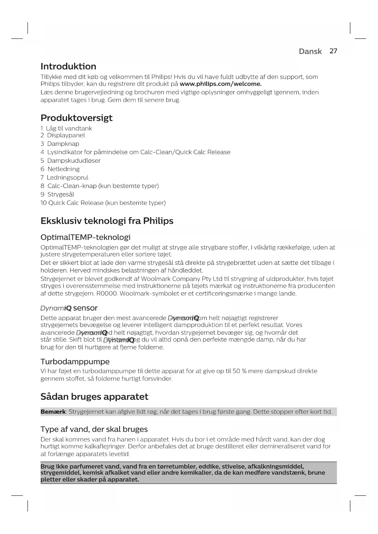 NederlandsIntroduktion Tillykke med dit køb og velkommen til Philips! Hvis du vil have fuldt udbytte af den support, som Philips tilbyder, kan du registrere dit produkt på www.philips.com/welcome. Læs denne brugervejledning og brochuren med vigtige oplysninger omhyggeligt igennem, inden apparatet tages i brug. Gem dem til senere brug. Produktoversigt 1 Låg til vandtank 2 Displaypanel 3 Dampknap 4 Lysindikator for påmindelse om Calc-Clean/Quick Calc Release 5 Dampskududløser 6 Netledning 7 Ledningsoprul 8 Calc-Clean-knap (kun bestemte typer) 9 Strygesål 10 Quick Calc Release (kun bestemte typer) Eksklusiv teknologi fra Philips OptimalTEMP-teknologi OptimalTEMP-teknologien gør det muligt at stryge alle strygbare stoer, i vilkårlig rækkefølge, uden at justere strygetemperaturen eller sortere tøjet. Det er sikkert blot at lade den varme strygesål stå direkte på strygebrættet uden at sætte det tilbage i holderen. Herved mindskes belastningen af håndleddet. Strygejernet er blevet godkendt af Woolmark Company Pty Ltd til strygning af uldprodukter, hvis tøjet stryges i overensstemmelse med instruktionerne på tøjets mærkat og instruktionerne fra producenten af dette strygejern. R0000. Woolmark-symbolet er et certiceringsmærke i mange lande. sensor Dette apparat bruger den mest avancerede -sensor, som helt nøjagtigt registrerer strygejernets bevægelse og leverer intelligent dampproduktion til et perfekt resultat. Vores avancerede -sensor ved helt nøjagtigt, hvordan strygejernet bevæger sig, og hvornår det står stille. Skift blot til -tilstand, og du vil altid opnå den perfekte mængde damp, når du har brug for den til hurtigere at fjerne folderne. Turbodamppumpe Vi har føjet en turbodamppumpe til dette apparat for at give op til 50 % mere dampskud direkte gennem stoet, så folderne hurtigt forsvinder. Sådan bruges apparatet Bemærk: Strygejernet kan afgive lidt røg, når det tages i brug første gang. Dette stopper efter kort tid. Type af vand, der skal bruges Der skal kommes vand fra hanen i apparatet. Hvis du bor i et område med hårdt vand, kan der dog hurtigt komme kalkaejringer. Derfor anbefales det at bruge destilleret eller demineraliseret vand for at forlænge apparatets levetid. Brug ikke parfumeret vand, vand fra en tørretumbler, eddike, stivelse, afkalkningsmiddel, strygemiddel, kemisk afkalket vand eller andre kemikalier, da de kan medføre vandstænk, brune pletter eller skader på apparatet.