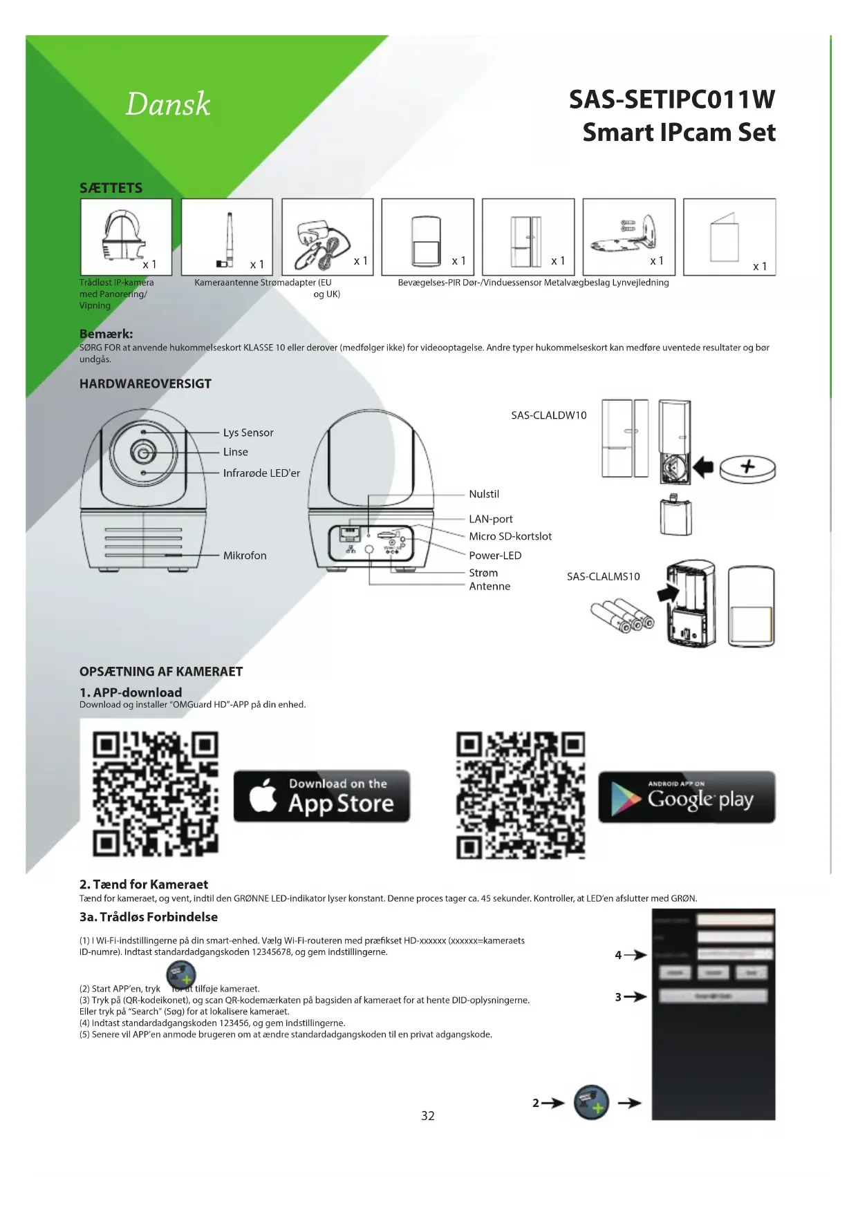SAS-SETIPC011W Smart IPcam Set Dansk Trådløst IP-kamera med Panorering/Vipning Kameraantenne Strømadapter (EU og UK)Bevægelses-PIR Dør-/Vinduessensor Metalvægbeslag Lynvejledning33 3b. Ledningsforbindel (1) Sørg for, at din smartphone er tilsluttet din Wi-Fi-router. (2) Slut kameraet til Wi-Fi-routeren med et Ethernet-kabel. (3) Start APP’en, tryk på “Search” (Søg) for at lokalisere kameraet. (4) Indtast standardadgangskoden 123456, og gem indstillingerne. (5) Senere vil APP’en anmode brugeren om at ændre standardadgangskoden til en privat adgangskode. Bemærk: I soft AP-tilstand, vil den GRØNNE LED udføre ét langt blink efterfulgt af 2 korte blink. I normal tilstand vil LED’en blinke grønt. Se brugervejledningen for yderligere oplysninger.
