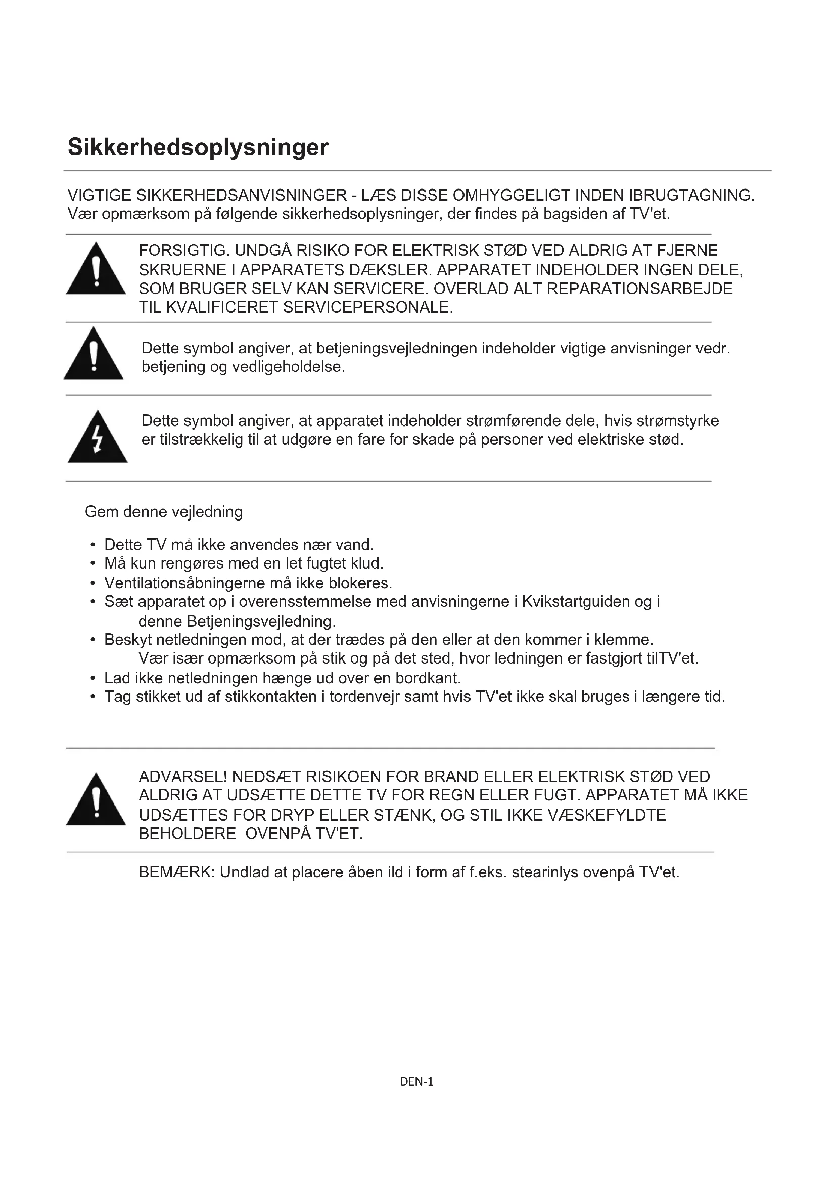 - Dette TV må ikke anvendes nær vand.