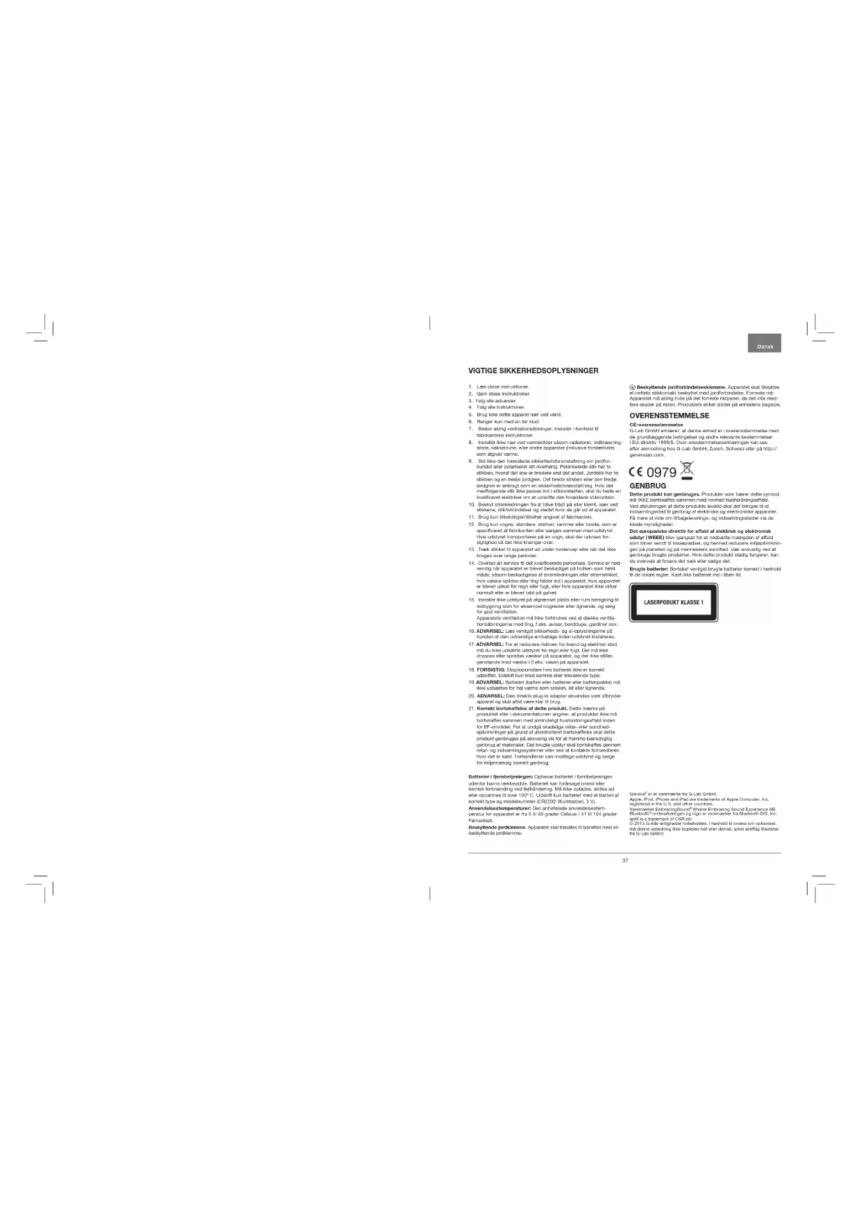 GENBRUG Dette produkt kan genbruges. Produkter som bærer dette symbol må IKKE bortskaffes sammen med normalt husholdningsaffald. Ved afslutningen af dette produkts levetid skal det bringes til et indsamlingssted til genbrug af elektriske og elektroniske apparater. Få mere at vide om tilbageleverings- og indsamlingssteder via de lokale myndigheder. Det europæiske direktiv for affald af elektrisk og elektronisk udstyr ( WEEE ) blev igangsat for at nedsætte mængden af affald som bliver sendt til lossepladser, og hermed reducere miljøpåvirknin-gen på planeten og på menneskers sundhed. Vær ansvarlig ved at genbruge brugte produkter. Hvis dette produkt stadig fungerer, kan du overveje at forære det væk eller sælge det.Brugte batterier: Bortskaf venligst brugte batterier korrekt i henhold til de lokale regler. Kast ikke batteriet ind i åben ild.Geneva er et varemærke fra G-Lab GmbH.Apple, iPod, iPhone and iPad are trademarks of Apple Computer, Inc. registered in the U.S. and other countries.Varemærket EmbracingSound tilhører Embracing Sound Experience AB.Bluetooth -ordmarkeringen og logo er varemærker fra Bluetooth SIG, Inc.aptX is a trademark of CSR plc© 2013 G-Alle rettigheder forbeholdes. I henhold til lovene om ophavsret, må denne vejledning ikke kopieres helt eller delvist, uden skriftlig tilladelse fra G-Lab GmbH. Dansk VIGTIGE SIKKERHEDSOPLYSNINGER38 39