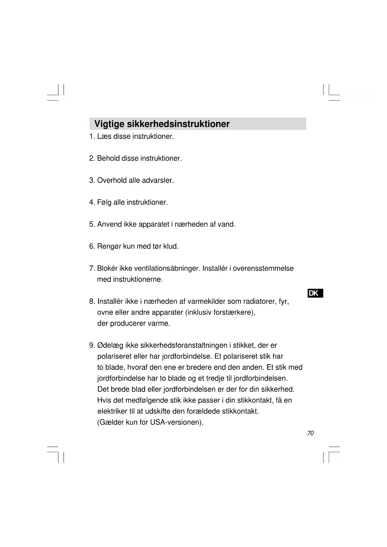 polariseret eller har jordforbindelse. Et polariseret stik har to blade, hvoraf den ene er bredere end den anden. Et stik med jordforbindelse har to blade og et tredje til jordforbindelsen. Det brede blad eller jordforbindelsen er der for din sikkerhed. Hvis det medfølgende stik ikke passer i din stikkontakt, få en elektriker til at udskifte den forældede stikkontakt. (Gælder kun for USA-versionen).71