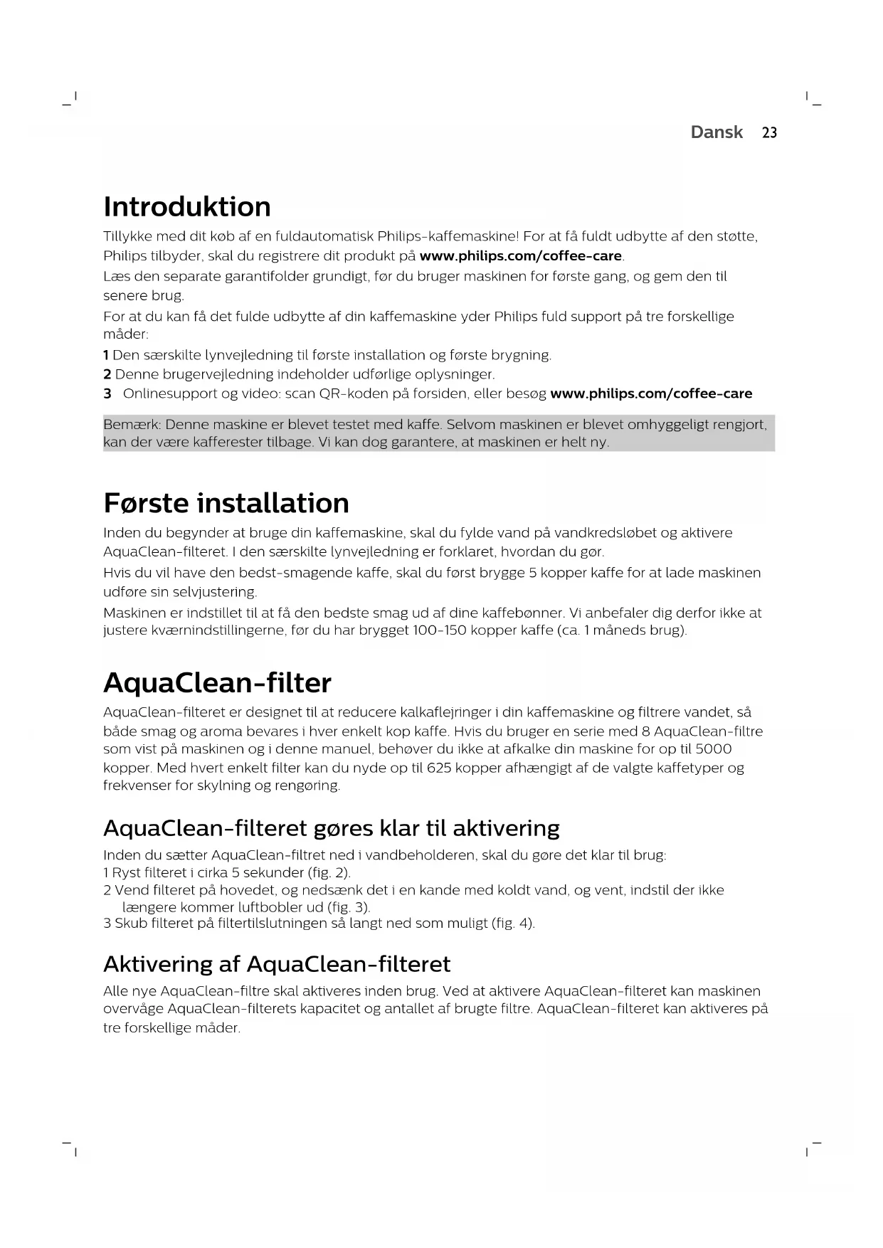 Dansk 17 Indersiden af lågen med kontaktoplysninger Rensebørste (ekstraudstyr) Smøringsrør (ekstraudstyr)Introduktion Tillykke med dit køb af en fuldautomatisk Philips-kaffemaskine! For at få fuldt udbytte af den støtte, Philips tilbyder, skal du registrere dit produkt på www.philips.com/coffee-care. Læs den separate garantifolder grundigt, før du bruger maskinen for første gang, og gem den til senere brug. For at du kan få det fulde udbytte af din kaffemaskine yder Philips fuld support på tre forskellige måder: 1 Den særskilte lynvejledning til første installation og første brygning. 2 Denne brugervejledning indeholder udførlige oplysninger. 3 Onlinesupport og video: scan QR-koden på forsiden, eller besøg www.philips.com/coffee-care Bemærk: Denne maskine er blevet testet med kaffe. Selvom maskinen er blevet omhyggeligt rengjort, kan der være kafferester tilbage. Vi kan dog garantere, at maskinen er helt ny. Første installation Inden du begynder at bruge din kaffemaskine, skal du fylde vand på vandkredsløbet og aktivere AquaClean-filteret. I den særskilte lynvejledning er forklaret, hvordan du gør. Hvis du vil have den bedst-smagende kaffe, skal du først brygge 5 kopper kaffe for at lade maskinen udføre sin selvjustering. Maskinen er indstillet til at få den bedste smag ud af dine kaffebønner. Vi anbefaler dig derfor ikke at justere kværnindstillingerne, før du har brygget 100-150 kopper kaffe (ca. 1 måneds brug). AquaClean-filter AquaClean-filteret er designet til at reducere kalkaflejringer i din kaffemaskine og filtrere vandet, så både smag og aroma bevares i hver enkelt kop kaffe. Hvis du bruger en serie med 8 AquaClean-filtre som vist på maskinen og i denne manuel, behøver du ikke at afkalke din maskine for op til 5000 kopper. Med hvert enkelt filter kan du nyde op til 625 kopper afhængigt af de valgte kaffetyper og frekvenser for skylning og rengøring. AquaClean-filteret gøres klar til aktivering Inden du sætter AquaClean-filtret ned i vandbeholderen, skal du gøre det klar til brug: 1 Ryst filteret i cirka 5 sekunder (fig. 2). 2 Vend filteret på hovedet, og nedsænk det i en kande med koldt vand, og vent, indstil der ikke længere kommer luftbobler ud (fig. 3). 3 Skub filteret på filtertilslutningen så langt ned som muligt (fig. 4). Aktivering af AquaClean-filteret Alle nye AquaClean-filtre skal aktiveres inden brug. Ved at aktivere AquaClean-filteret kan maskinen overvåge AquaClean-filterets kapacitet og antallet af brugte filtre. AquaClean-filteret kan aktivere s på tre forskellige måder.
