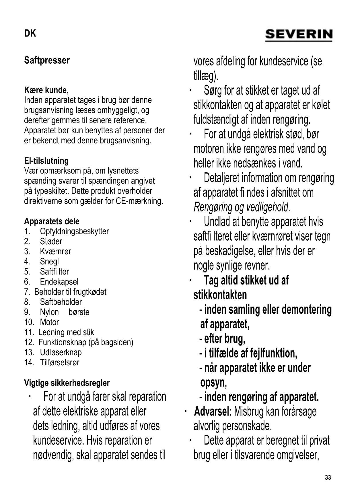 Vigtige sikkerhedsregler ∙ For at undgå farer skal reparation af dette elektriske apparat eller dets ledning, altid udføres af vores kundeservice. Hvis reparation er nødvendig, skal apparatet sendes til vores afdeling for kundeservice (se tillæg). ∙ Sørg for at stikket er taget ud af stikkontakten og at apparatet er kølet fuldstændigt af inden rengøring. ∙ For at undgå elektrisk stød, bør motoren ikke rengøres med vand og heller ikke nedsænkes i vand. ∙ Detaljeret information om rengøring af apparatet fi ndes i afsnittet om Rengøring og vedligehold. ∙ Undlad at benytte apparatet hvis saftfi lteret eller kværnrøret viser tegn på beskadigelse, eller hvis der er nogle synlige revner. ∙ Tag altid stikket ud af stikkontakten - inden samling eller demontering af apparatet, - efter brug, - i tilfælde af fejlfunktion, - når apparatet ikke er under opsyn, - inden rengøring af apparatet. ∙ Advarsel: Misbrug kan forårsage alvorlig personskade. ∙ Dette apparat er beregnet til privat brug eller i tilsvarende omgivelser, DK34 såsom - butikspersonale, kontorer eller andre mindre virksomheder, - landbrugsvirksomheder, - af kunder på hoteller, moteller m.m. og tilsvarende foretagender, - B&B pensionater. ∙ Apparatet må ikke benyttes af personer med reducerede fysiske, sensoriske eller mentale evner, eller mangel på erfaring eller viden, medmindre de har fået vejledning og instruktion i brugen af dette apparat og fuldt ud forstår alle farer og forholdsregler vedrørende sikkerheden som brug af apparatet medfører. ∙ Børn må aldrig få lov til at benytte dette apparat. Apparatet og dets ledning må altid holdes langt væk fra børn. ∙ Børn må aldrig få lov til at lege med apparatet. ∙ Advarsel: Hold altid børn væk fra emballagen eftersom den udgør en potentiel fare. Der er f.eks. risiko for kvælning. ∙ Inden apparatet benyttes må både apparatet og dets tilbehør ses grundigt efter for fejl. Hvis apparatet for eksempel har været tabt på en hård overfl ade eller der er blevet trukket i ledningen med stor kraft, må det ikke længere benyttes: Selv skader der ikke er synlige kan have ugunstig indvirkning på sikkerheden ved brug af apparatet. ∙ Efterlad aldrig apparatet uden opsyn når det er tilsluttet til strømforsyningen. ∙ Af sikkerhedsgrunde bør man altid benytte støderen til at skubbe madvarer ind i tilførselsrøret. Brug under ingen omstændigheder fi ngrene. ∙ Efter at være blevet slukket, fortsætter motoren med at køre i kortere tid. Vent altid indtil motoren er stoppet fuldstændigt, inden der åbnes for apparatet. ∙ Lad aldrig apparatet eller dets ledning berøre eller komme i kontakt med varme overfl ader eller andre varmekilder. ∙ Træk aldrig i selve ledningen, når ledningen tages ud af stikkontakten; tag altid fat i selve stikket. Lad aldrig ledningen hænge løst ud over bordkanten. ∙ Vi påtager os intet ansvar for skader, der skyldes misbrug eller manglende overholdelse af denne brugsanvisning. Nyttige tips til saftudvinding ∙ Næsten alle almindelige typer frugt er egnede til saftudvinding såsom æbler, pærer, blommer, jordbær, vindruer, appelsiner, meloner, kiwi, ananas, mango og papaja. ∙ De følgende grønsager er også brugbare for et godt saftudbytte: gulerødder, kålrabi, selleri og agurk. Desuden kan spinat, rucola og andre typer salatblade meget vel bruges. ∙ Æbler, gulerødder, agurk og selleri, blandt andet, giver en vitaliserende saft.35 ∙ En velsmagende morgenjuice kan presses af grapefrugter, gulerødder og æbler. ∙ Bananer er ikke egnede til saftudvinding, da de indeholder meget lidt saft. ∙ Vask og skær frugt eller grønsager groft. Fjern sten, kernehuse og kerner for at undgå skade på apparatet. ∙ For at lette saftudvindingen, bør hårde frugter og grønsager, såsom gulerødder, fennikel og kålrabi, skæres i mindre stykker. Kort tids betjening Apparatet er kun designet til kort tids betjening, dvs. at det ikke må benyttes kontinuerligt i mere end 10 minut. Lad det herefter køle af i 10 minut, hvorefter det er klar til brug igen. Termosikring Apparatet har en indbygget termosikring som beskytter det mod overophedning. Hvis termosikringen er blevet aktiveret, må man lade apparatet få tid til at køle ned til stuetemperatur inden det tændes igen. Før brug Inden apparatet benyttes første gang, må det rengøres som beskrevet under afsnittet Rengøring og vedligehold. Kontakten Apparatet er udstyret med en funktionsknap. 0 Saftpresseren er slukket ON normal drift R modsat drift Betjening ∙ Sæt kværnrøret ind i motordelen således, at pil symbolet på kværnrøret er ud for det åbne lås-symbolet på motordelen. ∙ Drej mod uret, indtil pilen er ud for det låste symbol. ∙ Indfør sneglen i kværnrøret, skub det helt ind; om nødvendigt, drej sneglen en smule. ∙ Placer saftfi lteret, med den brede ende først, udenom sneglen med et let tryk. ∙ Fastgør endekapslen og drej mod uret for at låse. ∙ Opfyldningsbeskytteren sættes på tilførselsrøret. ∙ Placer saftbeholderen under saftafl øbshullet på underside af kværnrøret. ∙ Placer beholderen til frugtkød under åbningen i endekapslen. ∙ Sæt stikket i stikkontakten. ∙ Stil funktionsknappen på ON positionen. ∙ Der lyder et kort bip signal, og apparatet vil da starte efter nogle få sekunder. ∙ Kom de rene, skårne frugt- eller grønsagsstykker ned gennem tilførselsrøret medens maskinen kører, brug støderen til at skubbe stykkerne forsigtigt ned. Advarsel: For hårdt pres kan resultere i skade på motor eller fi lter. ∙ Skulle der opstå en blokering under brug, vil der lyde et bip signal. I tilfælde af dette, tryk funktionsknappen til modsat drift (R positionen) for at fjerne blokeringen. ∙ Hvis store mængder frugt og grønsager skal presses, er det nødvendigt at tømme saft- og frugtkødsbeholderne ind i mellem, efter behov. ∙ Når saften er holdt op med at løbe