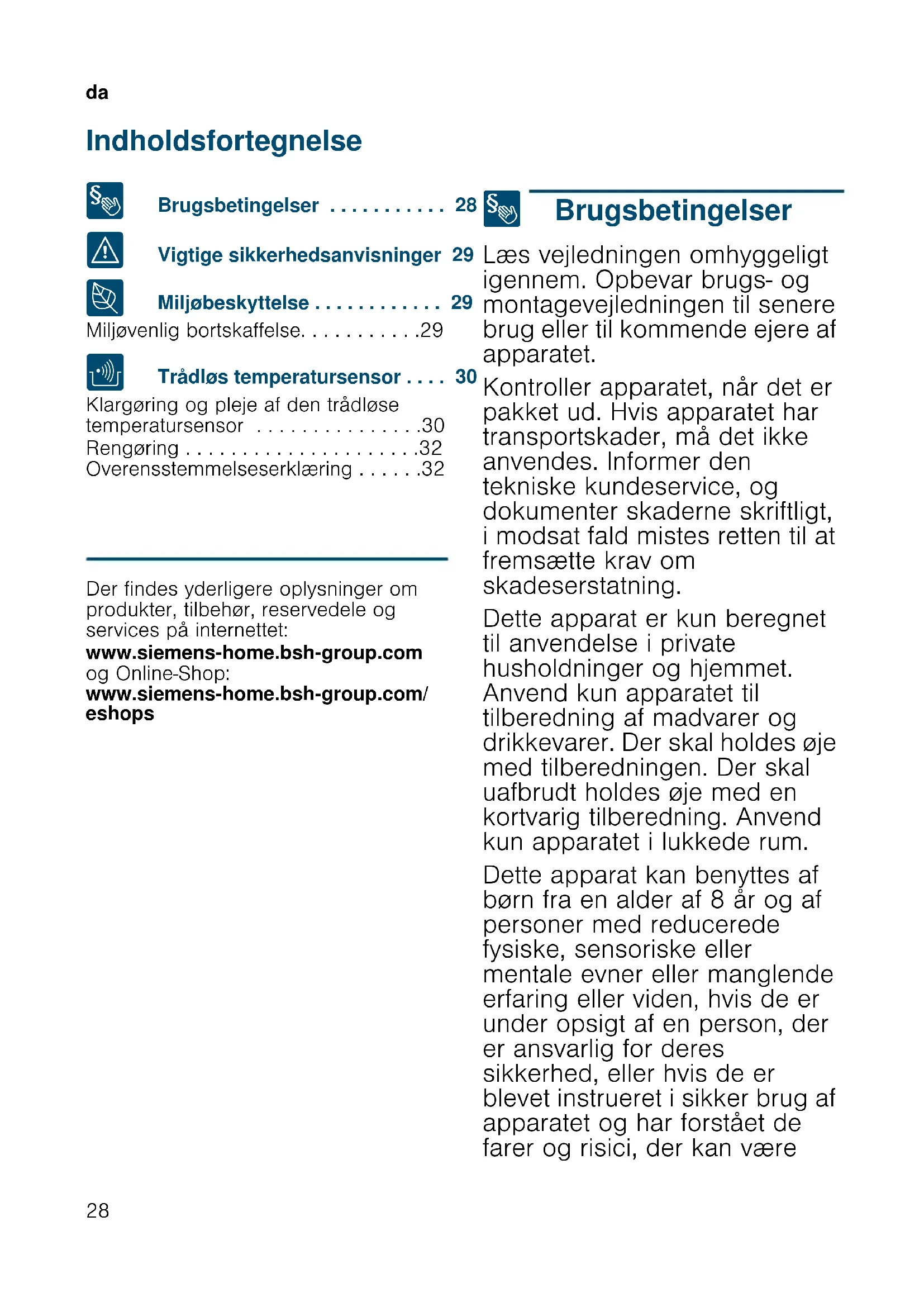 - Overensstemmelseserklæring Produktinfo Der findes yderligere oplysninger om produkter, tilbehør, reservedele og services på internettet: www.siemens-home.bsh-group.com og Online-Shop: www.siemens-home.bsh-group.com/ eshops 8 Brugsbetingelser Brugsbetingelser Læs vejledningen omhyggeligt igennem. Opbevar brugs- og montagevejledningen til senere brug eller til kommende ejere af apparatet. Kontroller apparatet, når det er pakket ud. Hvis apparatet har transportskader, må det ikke anvendes. Informer den tekniske kundeservice, og dokumenter skaderne skriftligt, i modsat fald mistes retten til at fremsætte krav om skadeserstatning. Dette apparat er kun beregnet til anvendelse i private husholdninger og hjemmet. Anvend kun apparatet til tilberedning af madvarer og drikkevarer. Der skal holdes øje med tilberedningen. Der skal uafbrudt holdes øje med en kortvarig tilberedning. Anvend kun apparatet i lukkede rum. Dette apparat kan benyttes af børn fra en alder af 8 år og af personer med reducerede fysiske, sensoriske eller mentale evner eller manglende erfaring eller viden, hvis de er under opsigt af en person, der er ansvarlig for deres sikkerhed, eller hvis de er blevet instrueret i sikker brug af apparatet og har forstået de farer og risici, der kan væreda p. 32