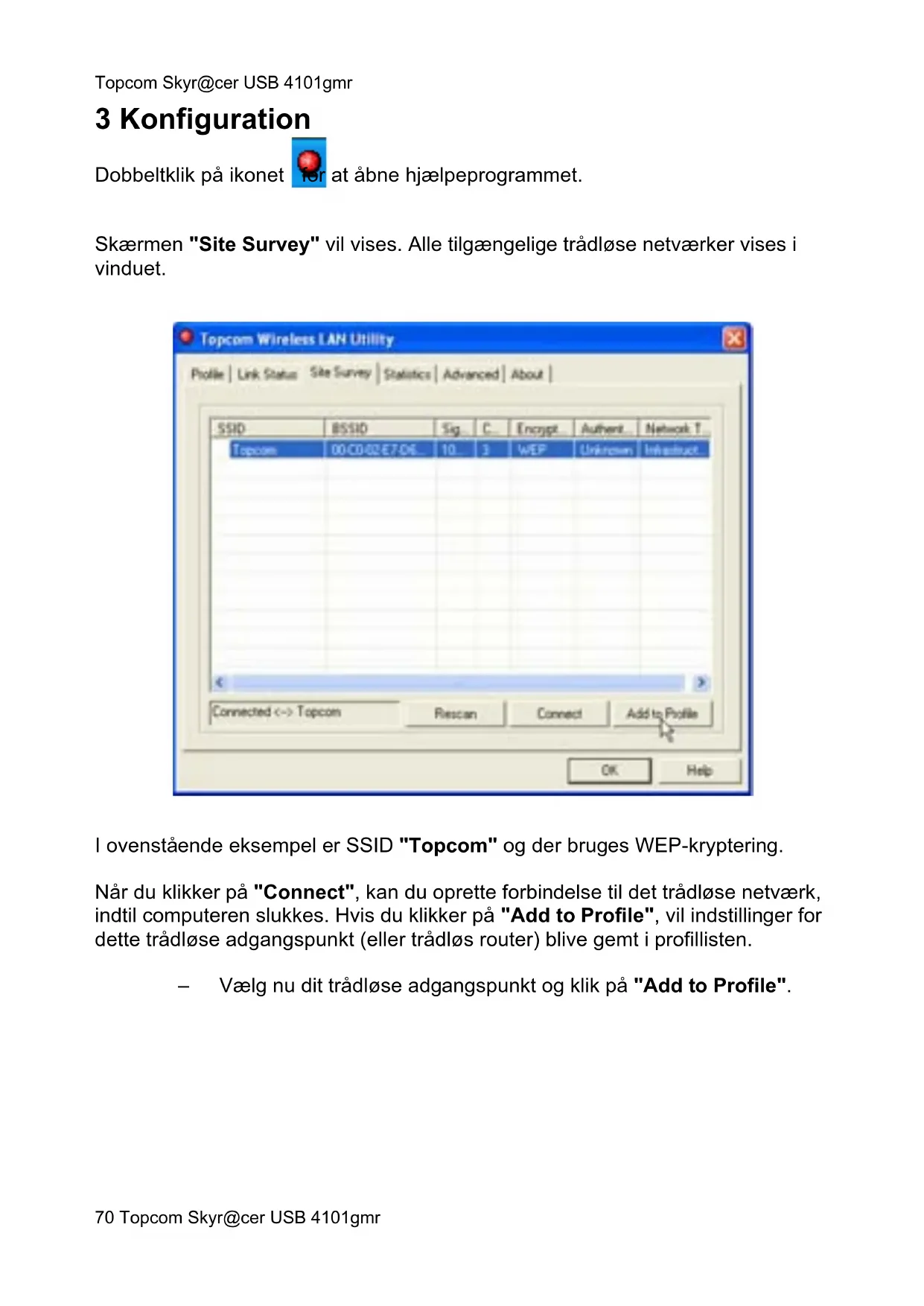 – Klik på "Yes" for at starte installationen. – Klik på "Next"Topcom Skyr@cer USB 4101gmr Topcom Skyr@cer USB 4101gmr 67 DANSK – Klik på "Next" Indsæt nu det trådløse USB Stick i USB-stikket. Driverne vil blive installeret automatisk.Topcom Skyr@cer USB 4101gmr 68 Topcom Skyr@cer USB 4101gmr – Klik på "Next" Under installation vil næste skærm blive vist: – Klik på "Continue Anyway"Topcom Skyr@cer USB 4101gmr Topcom Skyr@cer USB 4101gmr 69 DANSK – Klik på "Finish" – Klik på "Finish" Når installationen er gennemført, vil ikonet blive vist i systembakken.Topcom Skyr@cer USB 4101gmr 70 Topcom Skyr@cer USB 4101gmr 3 Konfiguration Dobbeltklik på ikonet for at åbne hjælpeprogrammet. Skærmen "Site Survey" vil vises. Alle tilgængelige trådløse netværker vises i vinduet. I ovenstående eksempel er SSID "Topcom" og der bruges WEP-kryptering. Når du klikker på "Connect", kan du oprette forbindelse til det trådløse netværk, indtil computeren slukkes. Hvis du klikker på "Add to Profile", vil indstillinger for dette trådløse adgangspunkt (eller trådløs router) blive gemt i profillisten. – Vælg nu dit trådløse adgangspunkt og klik på "Add to Profile".Topcom Skyr@cer USB 4101gmr Topcom Skyr@cer USB 4101gmr 71 DANSK Næste skæm vil vises: – Indtast nu et profilnavn: i ovenstående eksempel oprettes "ROUTER". –Tryk på OK for at bekræfte. Bemærk: Hvis det trådløse adgangspunkt har krypteringsindstillinger, vises næste skærm. I ovenstående eksempel anvendes WEP-kryptering. – Klik på OK.Topcom Skyr@cer USB 4101gmr 72 Topcom Skyr@cer USB 4101gmr Næste skæm vil vises: – Indtast krypteringsnøglen. Sørg for at indtaste helt den samme krypteringstype/nøgle som i det trådløse adgangspunkt (eller trådløs router). –Tryk på OK for at bekræfte. Den trådløse profil er nu oprettet.Topcom Skyr@cer USB 4101gmr Topcom Skyr@cer USB 4101gmr 73 DANSK – Klik nu på "Activate" for at aktivere profilen. Ikonet foran profilnavnet og ikonet i systembakken angiver, at forbindelsen er oprettet. For flere oplysninger henvises til den komplette engelske brugsanvisning på den medfølgende CD-ROM.Topcom Skyr@cer USB 4101gmr 74 Topcom Skyr@cer USB 4101gmr 4 Reklamationsret