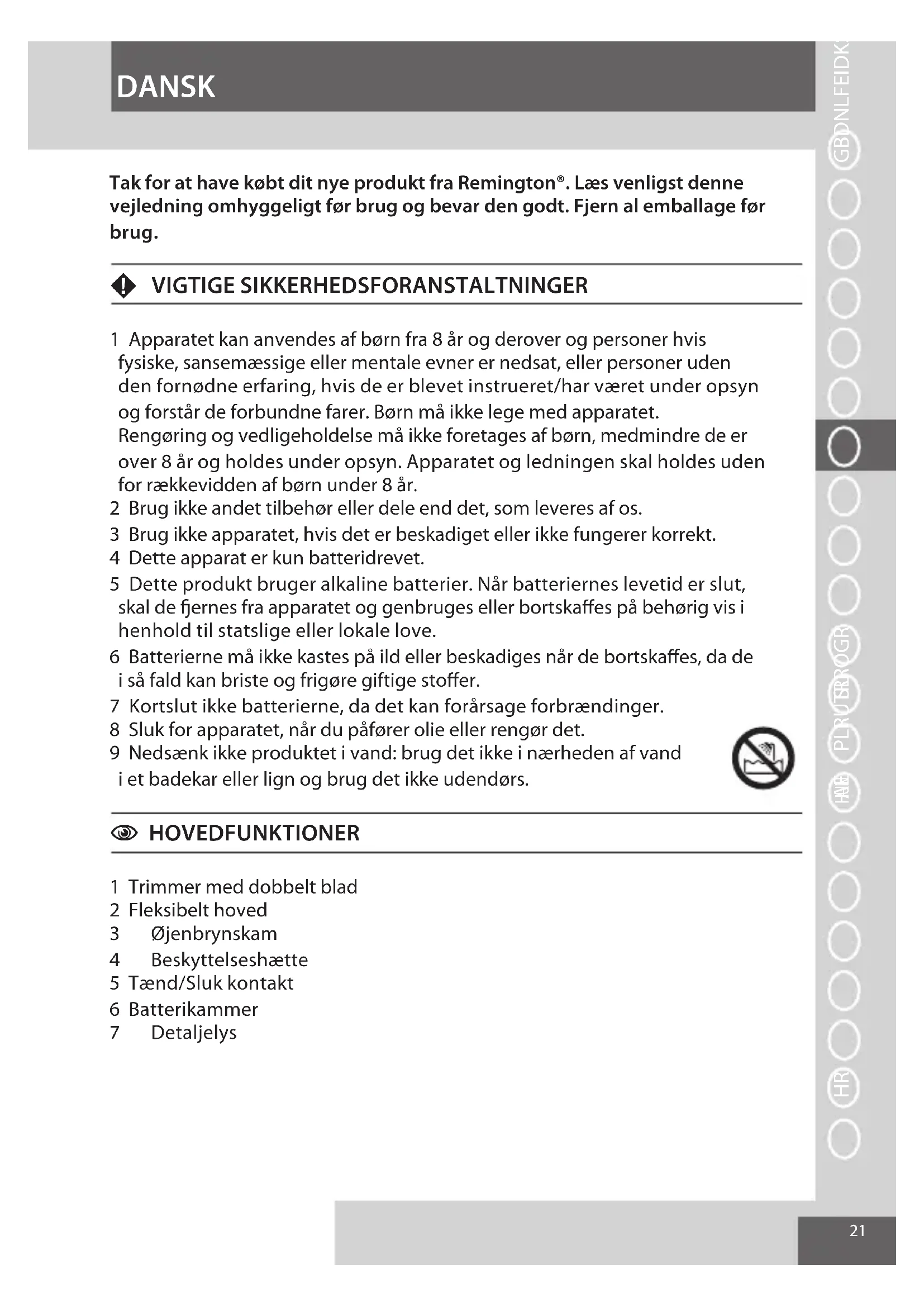 1 Apparatet kan anvendes af børn fra 8 år og derover og personer hvis fysiske, sansemæssige eller mentale evner er nedsat, eller personer uden den fornødne erfaring, hvis de er blevet instrueret/har været under opsyn og forstår de forbundne farer. Børn må ikke lege med apparatet. Rengøring og vedligeholdelse må ikke foretages af børn, medmindre de er over 8 år og holdes under opsyn. Apparatet og ledningen skal holdes uden for rækkevidden af børn under 8 år. 2 Brug ikke andet tilbehør eller dele end det, som leveres af os. 3 Brug ikke apparatet, hvis det er beskadiget eller ikke fungerer korrekt. 4 Dette apparat er kun batteridrevet. 5 Dette produkt bruger alkaline batterier. Når batteriernes levetid er slut, skal de ernes fra apparatet og genbruges eller bortskaffes på behørig vis i henhold til statslige eller lokale love. 6 Batterierne må ikke kastes på ild eller beskadiges når de bortskaffes, da de i så fald kan briste og frigøre giftige stoffer. 7 Kortslut ikke batterierne, da det kan forårsage forbrændinger. 8 Sluk for apparatet, når du påfører olie eller rengør det. 9 Nedsænk ikke produktet i vand: brug det ikke i nærheden af vand i et badekar eller lign og brug det ikke udendørs. C HOVEDFUNKTIONER 1 Trimmer med dobbelt blad 2 Fleksibelt hoved 3 Øjenbrynskam 4 Beskyttelseshætte 5 Tænd/Sluk kontakt 6 Batterikammer 7 Detaljelys GBDNLFEIDKSFINPSKCZ HUN PLRUTRROGRSLAE