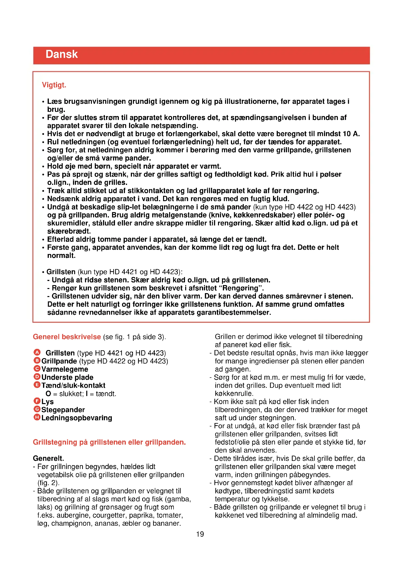 18Generel beskrivelse (se fig. 1 på side 3). A Grillsten (type HD 4421 og HD 4423) B Grillpande (type HD 4422 og HD 4423) C Varmelegeme D Underste plade E Tænd/sluk-kontakt O = slukket; I = tændt. F Lys G Stegepander H Ledningsopbevaring Grillstegning på grillstenen eller grillpanden. Generelt. - Før grillningen begyndes, hældes lidt vegetabilsk olie på grillstenen eller grillpanden (fig. 2). - Både grillstenen og grillpanden er velegnet til tilberedning af al slags mørt kød og fisk (gamba, laks) og grillning af grønsager og frugt som f.eks. aubergine, courgetter, paprika, tomater, løg, champignon, ananas, æbler og bananer. Grillen er derimod ikke velegnet til tilberedning af paneret kød eller fisk. - Det bedste resultat opnås, hvis man ikke lægger for mange ingredienser på stenen eller panden ad gangen. - Sørg for at kød m.m. er mest mulig fri for væde, inden det grilles. Dup eventuelt med lidt køkkenrulle. - Kom ikke salt på kød eller fisk inden tilberedningen, da der derved trækker for meget saft ud under stegningen. - For at undgå, at kød eller fisk brænder fast på grillstenen eller grillpanden, svitses lidt fedstof/olie på sten eller pande et stykke tid, før den skal anvendes. - Dette tilrådes især, hvis De skal grille bøffer, da grillstenen eller grillpanden skal være meget varm, inden grillningen påbegyndes. - Hvor gennemstegt kødet bliver afhænger af kødtype, tilberedningstid samt kødets temperatur og tykkelse. - Både grillsten og grillpande er velegnet til brug i køkkenet ved tilberedning af almindelig mad.