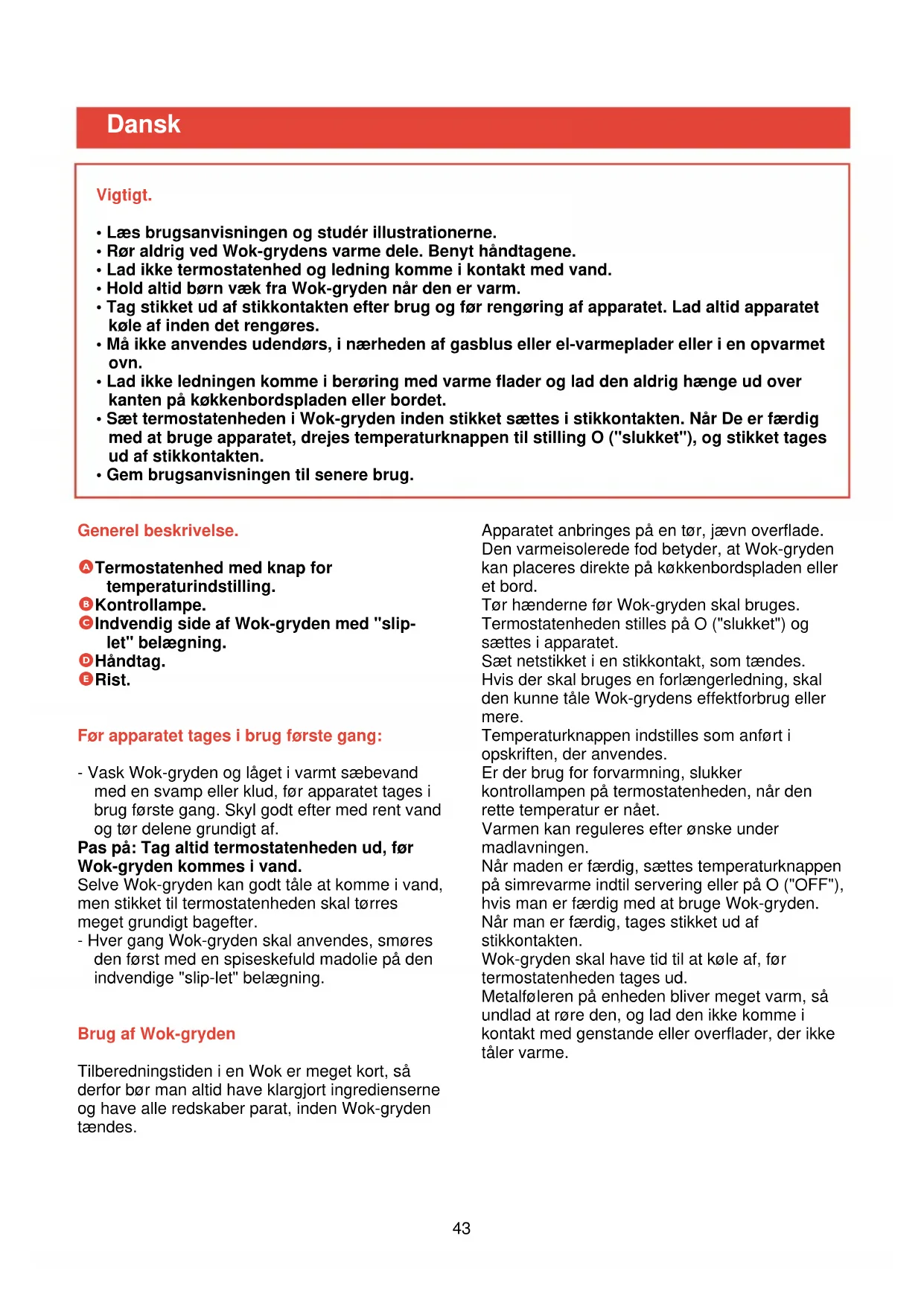 - Gem brugsanvisningen til senere brug. Dansk Generel beskrivelse. A Termostatenhed med knap for temperaturindstilling. B Kontrollampe. C Indvendig side af Wok-gryden med "slip- let" belægning. D Håndtag. E Rist. Før apparatet tages i brug første gang: - Vask Wok-gryden og låget i varmt sæbevand med en svamp eller klud, før apparatet tages i brug første gang. Skyl godt efter med rent vand og tør delene grundigt af. Pas på: Tag altid termostatenheden ud, før Wok-gryden kommes i vand. Selve Wok-gryden kan godt tåle at komme i vand, men stikket til termostatenheden skal tørres meget grundigt bagefter. - Hver gang Wok-gryden skal anvendes, smøres den først med en spiseskefuld madolie på den indvendige "slip-let" belægning. Brug af Wok-gryden Tilberedningstiden i en Wok er meget kort, så derfor bør man altid have klargjort ingredienserne og have alle redskaber parat, inden Wok-gryden tændes. Apparatet anbringes på en tør, jævn overflade. Den varmeisolerede fod betyder, at Wok-gryden kan placeres direkte på køkkenbordspladen eller et bord. Tør hænderne før Wok-gryden skal bruges. Termostatenheden stilles på O ("slukket") og sættes i apparatet. Sæt netstikket i en stikkontakt, som tændes. Hvis der skal bruges en forlængerledning, skal den kunne tåle Wok-grydens effektforbrug eller mere. Temperaturknappen indstilles som anført i opskriften, der anvendes. Er der brug for forvarmning, slukker kontrollampen på termostatenheden, når den rette temperatur er nået. Varmen kan reguleres efter ønske under madlavningen. Når maden er færdig, sættes temperaturknappen på simrevarme indtil servering eller på O ("OFF"), hvis man er færdig med at bruge Wok-gryden. Når man er færdig, tages stikket ud af stikkontakten. Wok-gryden skal have tid til at køle af, før termostatenheden tages ud. Metalføleren på enheden bliver meget varm, så undlad at røre den, og lad den ikke komme i kontakt med genstande eller overflader, der ikke tåler varme.Redskaber. Brug redskaber af varmebestandigt plastic eller træ. Langskaftede træskeer eller spisepinde er ideelle til omrøring. Undlad at bruge metalredskaber med skarpe kanter, som kan ødelægge "slip-let" belægningen. (Mindre ridser påvirker ikke "slip- let" egenskaberne og skader ikke fødevarerne, der tilberedes i Wok-gryden). Rengøring. Lad den elektriske Wok-gryde afkøle af sig selv. Forsøg ikke at fremskynde afkølingen ved at hælde koldt vand i Wok-gryden. Tag termostatenheden ud. Når apparatet er kølet af, og strømmen er afbrudt, tages termostatenheden ud. Hverken ledning eller termostatenhed må nedsænkes i vand. Rengøring efter hver gang, den har været i brug: For at den elektriske Wok-gryde kan bevare det pæne udseende og fungere optimalt, skal den rengøres hver gang, den har været brugt. Gryden kan vaskes i hånden eller i opvaskemaskine. "Slip-let" belægningen. Brug en nylonsvamp til rengøring af Wok-grydens inderside og sørg for, at alle madrester er fjernet fra "slip-let" belægningen. Får de får lov at blive siddende, brænder de fast og laver pletter, næste gang Wok-gryden bruges, hvilket ødelægger "slip-let" belægningen. Der må aldrig anvendes metalsvamp eller skure/slibemidler. Udvendigt. Wok-gryden tørres ren udvendigt med en almindelig svamp eller en nylonsvamp. Man kan bruge et ikke-slibende rengøringsmiddel, men aldrig en metalsvamp eller skure/slibemidler. Skylning. Efter rengøring af Wok-gryden skylles den grundigt i vand fra vandhanen for at undgå, at der sidder rester af rengøringsmidler i gryden næste gang, den skal bruges. Vask i opvaskemaskine. Når ledningen med termostatenheden er taget ud, kan Wok-gryden og låget vaskes i opvaskemaskine. Undersiden af låget vil dog blive misfarvet. Wok-gryde og låg skal anbringes således i opvaskemaskinen, at de ikke kommer i berøring med hinanden. Efter vask i opvaskemaskine smøres indersiden igen med madolie, før apparatet bruges igen. Fjernelse af pletter. I tidens løb kan der dannes en hvidlig film indvendig i Wok-gryden. Dette skyldes kalkdannelser. Filmen kan fjernes ved at gnide med en klud dyppet i citronsaft eller eddike. Skyl grundigt efter, og smør med madolie igen før brug. "Slip-let" belægningen bliver plettet, hvis Wok- gryden overophedes, eller hvis rengøringen er mangelfuld. Brug et rengøringsmiddel og vask i varmt sæbevand. Skyl grundigt efter. Efter denne behandling smøres indersiden med madolie. Vigtigt! Undgå at termostatenheden bliver våd. 44Opskrifter. Disse enkle opskrifter er udformet som introduktion til Wok-madlavning. Ved at følge opskrifterne bliver De fortrolig med selve Wok- gryden og med nogle ingredienser og madlavningsmetoder, som måske er nye for Dem. Wok-gryden er et utroligt alsidigt køkkenredskab. Man kan tilberede lækre, nærende måltider på få minutter, hvorved der spares både tid og elektricitet. Når Wok-gryden bruges på traditionel kinesisk manér, tilbereder man én fødevare ad gangen, hvorefter den skubbes op ad Wok-grydens side til en køligere placering, hvor den får lov at blive, medens den næste fødevare tilberedes. Forberedelserne er af væsentlig betydning. Alle ingredienser skal være klar, inden man påbegynder madlavningen. Man skærer ingredienserne i terninger, skiver eller strimler og blander tingene på forhånd. Udskæring foretages i ensartede stykker for at gøre tilberedningen jævn og få et appetitvækkende slutresultat. MADOLIEN, der bruges, skal være let og klar. Jordnøddeolie er ideelt til formålet. INGEFÆR er en brun rod, som fås frisk i mange supermarkeder. Den kan holde sig (rullet ind i en papirserviet) i køleskabet i adskillige uger. TOFU er en blød, hvid kage, bagt af sojabønner. Den fås i supermarkeder og orientalske krydderiforretninger og kan holde sig i flere dage i køleskabet, når den opbevares i vand. Vandet skal dog skiftes dagligt. SOYA SAUCE fås mange steder, både i lys og mørk udgave. Den har næsten u