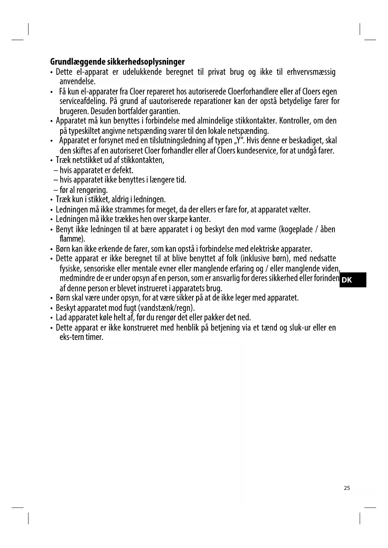 - Få kun el-apparater fra Cloer repareret hos autorisere de Cloerforhandlere eller af Cloers egen serviceafdeling. På grund af uAutorisere reparationer kan der opstå betydelse farer for brugeren. Desuden bortfalder garantien.
