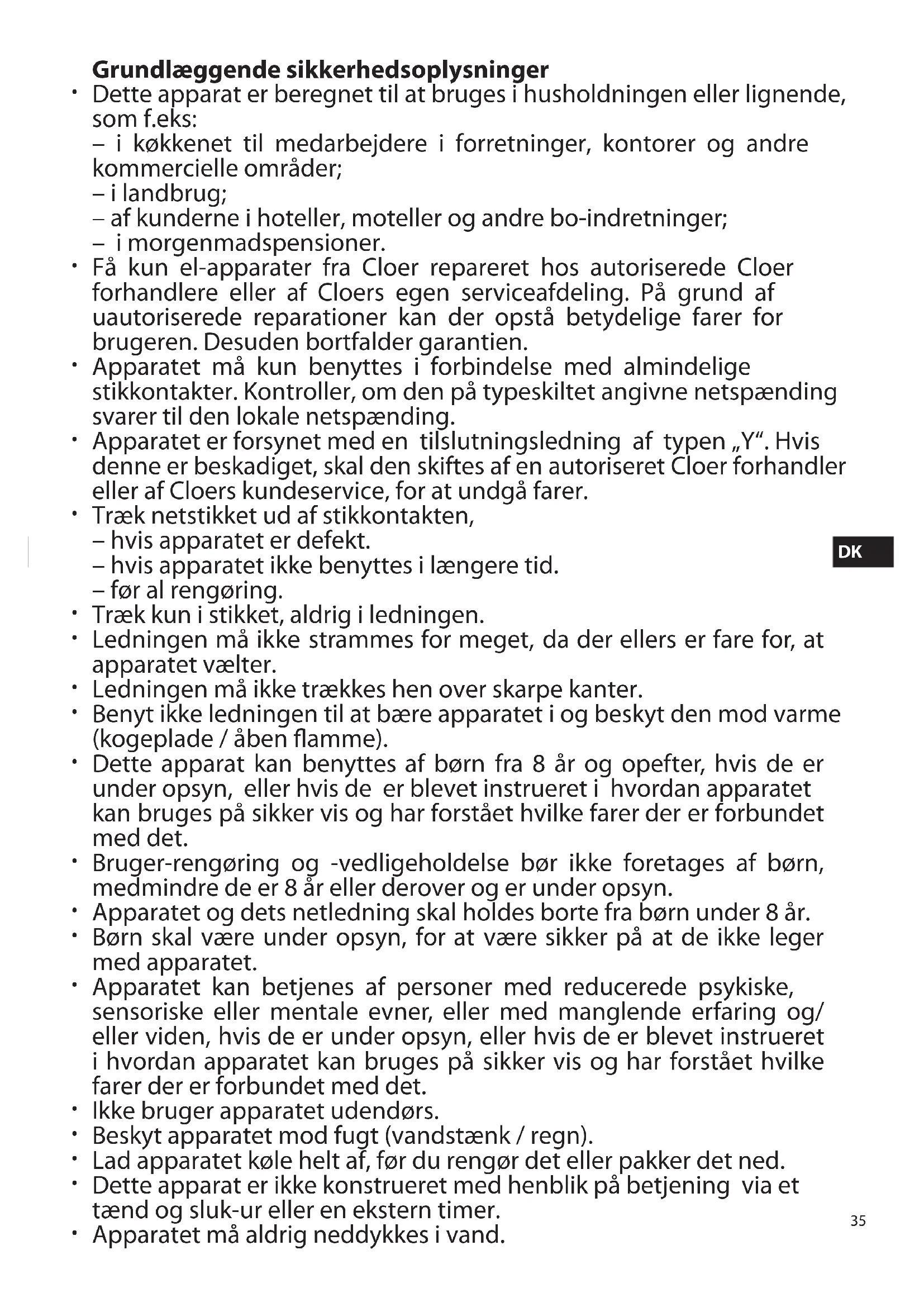 - Apparatet er forsynet med en tilslutningsledning af typen „Y“. Hvis denne er beskadiget, skal den skiftes af en autoriseret Cloer forhandler eller af Cloers kundeservice, for at undgå farer.