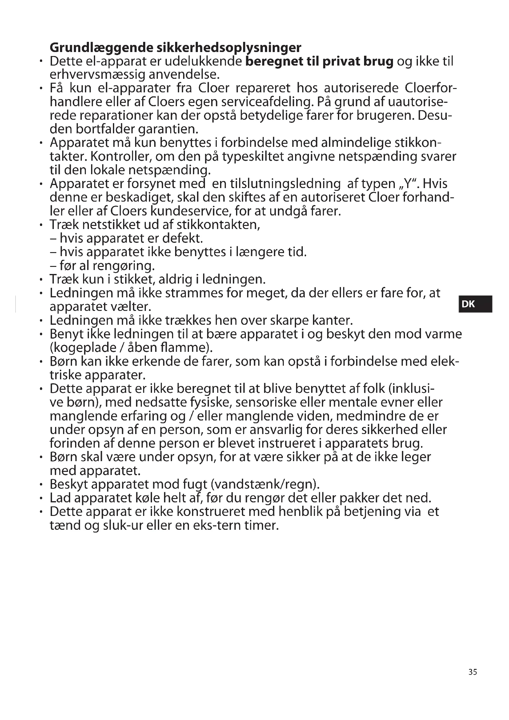 - 35 Grundlæggende sikkerhedsoplysninger Dette el-apparat er udelukkende beregnet til privat brug og ikke til erhvervsmæssig anvendelse. Få kun el-apparater fra Cloer repareret hos autoriserede Cloerfor- handlere eller af Cloers egen serviceafdeling. På grund af uautorise- rede reparationer kan der opstå betydelige farer for brugeren. Desu- den bortfalder garantien. Apparatet må kun benyttes i forbindelse med almindelige stikkon- takter. Kontroller, om den på typeskiltet angivne netspænding svarer til den lokale netspænding. Apparatet er forsynet med en tilslutningsledning af typen „Y“. Hvis denne er beskadiget, skal den skiftes af en autoriseret Cloer forhand- ler eller af Cloers kundeservice, for at undgå farer. Træk netstikket ud af stikkontakten, – hvis apparatet er defekt. – hvis apparatet ikke benyttes i længere tid. – før al rengøring. Træk kun i stikket, aldrig i ledningen. Ledningen må ikke strammes for meget, da der ellers er fare for, at apparatet vælter. Ledningen må ikke trækkes hen over skarpe kanter. Benyt ikke ledningen til at bære apparatet i og beskyt den mod varme (kogeplade / åben amme). Børn kan ikke erkende de farer, som kan opstå i forbindelse med elek- triske apparater. Dette apparat er ikke beregnet til at blive benyttet af folk (inklusi- ve børn), med nedsatte fysiske, sensoriske eller mentale evner eller manglende erfaring og / eller manglende viden, medmindre de er under opsyn af en person, som er ansvarlig for deres sikkerhed eller forinden af denne person er blevet instrueret i apparatets brug. Børn skal være under opsyn, for at være sikker på at de ikke leger med apparatet. Beskyt apparatet mod fugt (vandstænk/regn). Lad apparatet køle helt af, før du rengør det eller pakker det ned. Dette apparat er ikke konstrueret med henblik på betjening via et tænd og sluk-ur eller en eks-tern timer.