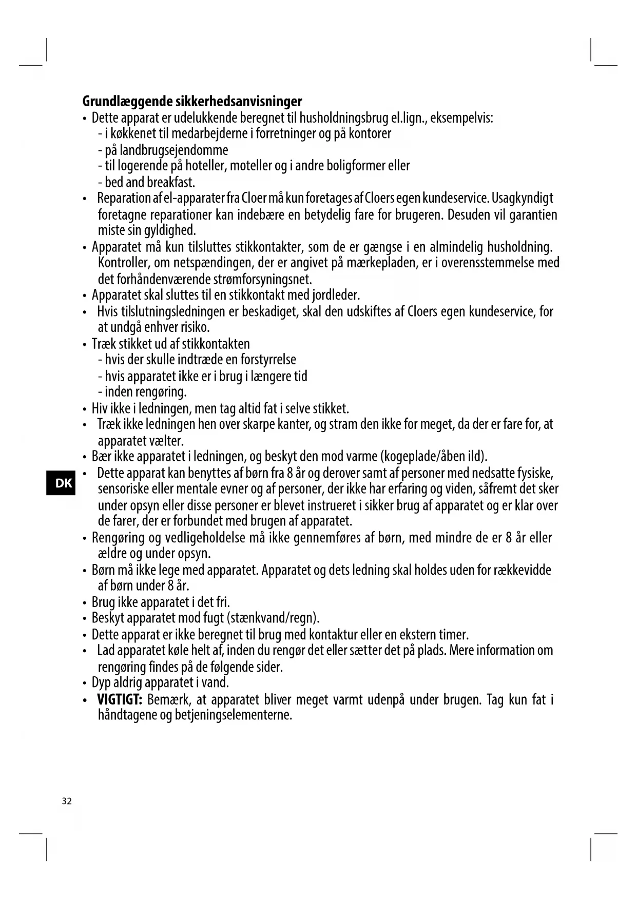 - Hvis tilslutningsledningen er beskadiget, skal den udskiftes af Cloers egen kundeservice, for at undgå enhver risiko.