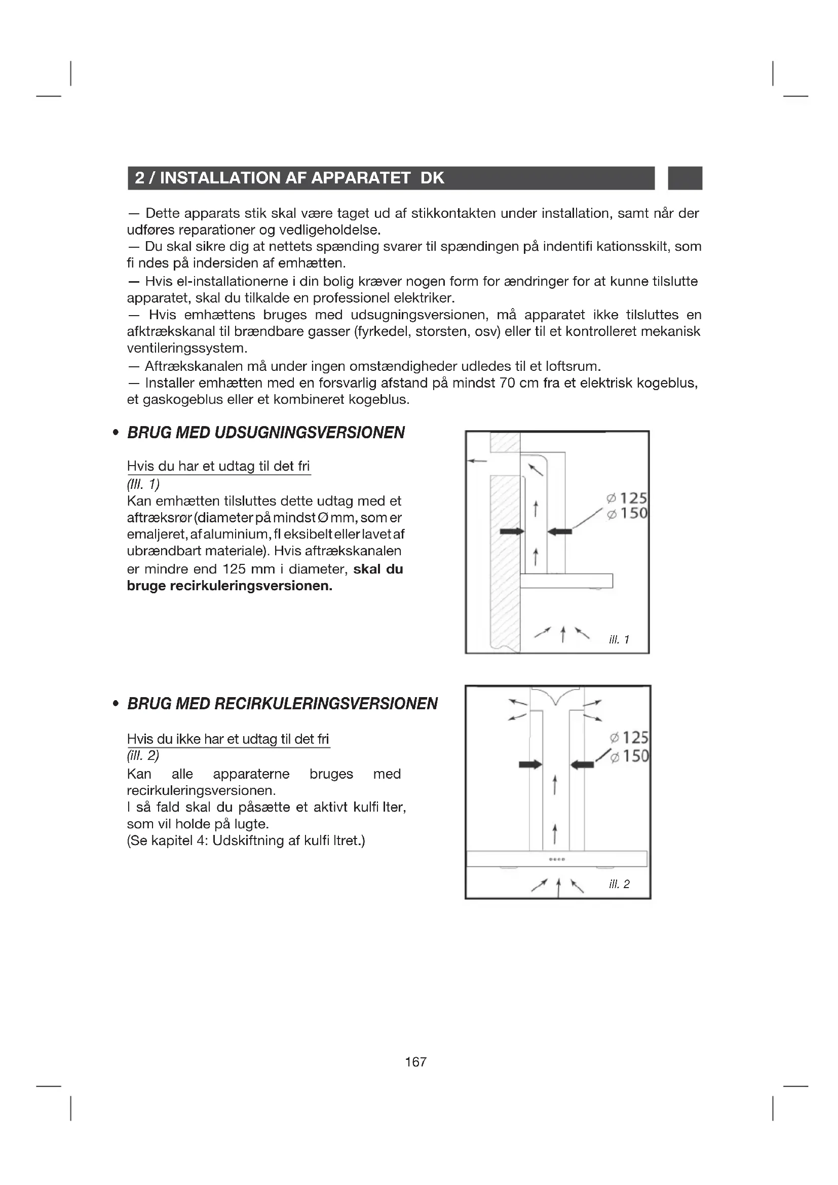 - BRUG MED RECIRKULERINGSVERSIONEN Hvis du har et udtag til det fri (Ill. 1) Kan emhætten tilsluttes dette udtag med et aftræksrør (diameter på mindst Ø mm, som er emaljeret, af aluminium, eksibelt eller lavet af ubrændbart materiale). Hvis aftrækskanalen er mindre end 125 mm i diameter, skal du bruge recirkuleringsversionen. Hvis du ikke har et udtag til det fri (ill. 2) Kan alle apparaterne bruges med recirkuleringsversionen. I så fald skal du påsætte et aktivt kul lter, som vil holde på lugte. (Se kapitel 4: Udskiftning af kul ltret.) — Dette apparats stik skal være taget ud af stikkontakten under installation, samt når der udføres reparationer og vedligeholdelse. — Du skal sikre dig at nettets spænding svarer til spændingen på indenti kationsskilt, som ndes på indersiden af emhætten. — Hvis el-installationerne i din bolig kræver nogen form for ændringer for at kunne tilslutte apparatet, skal du tilkalde en professionel elektriker. — Hvis emhættens bruges med udsugningsversionen, må apparatet ikke tilsluttes en afktrækskanal til brændbare gasser (fyrkedel, storsten, osv) eller til et kontrolleret mekanisk ventileringssystem. — Aftrækskanalen må under ingen omstændigheder udledes til et loftsrum. — Installer emhætten med en forsvarlig afstand på mindst 70 cm fra et elektrisk kogeblus, et gaskogeblus eller et kombineret kogeblus. ill. 1 ill. 2168