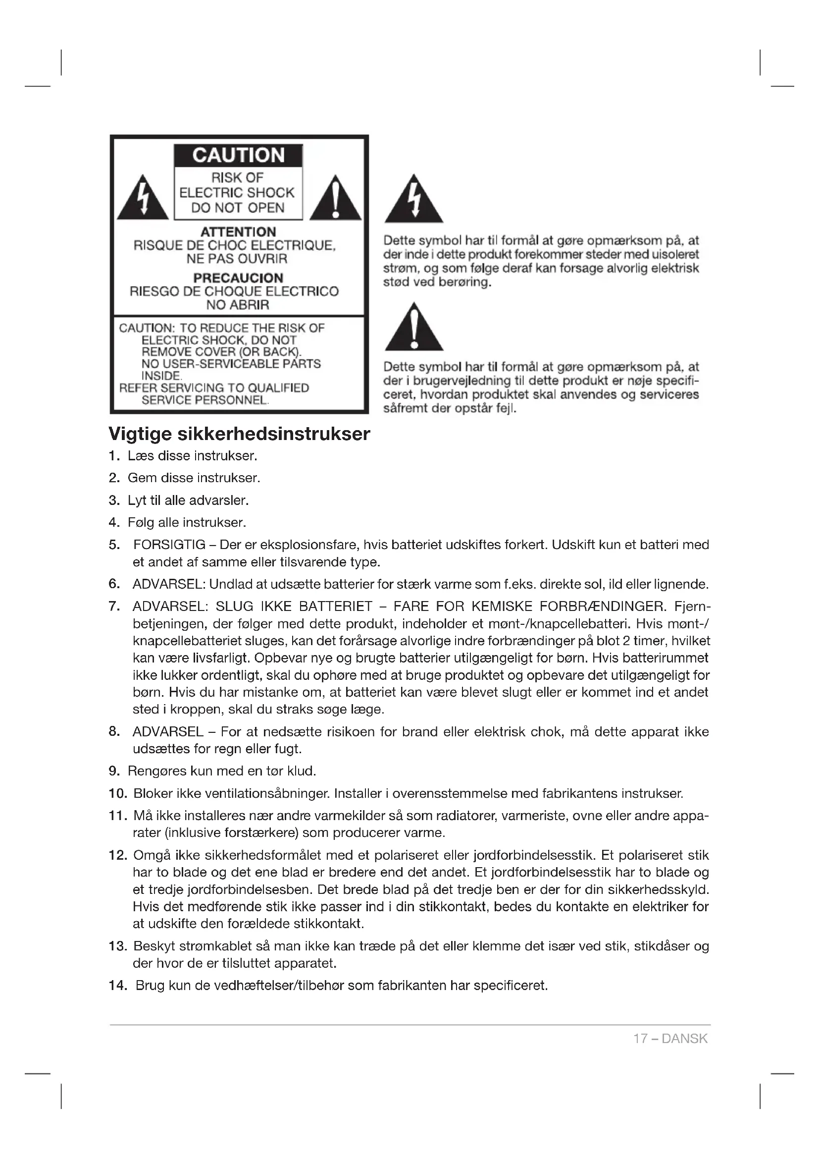 ADVARSEL: SLUG IKKE BATTERIET – FARE FOR KEMISKE FORBRÆNDINGER. Fjern- betjeningen, der følger med dette produkt, indeholder et mønt-/knapcellebatteri. Hvis mønt-/ knapcellebatteriet sluges, kan det forårsage alvorlige indre forbrændinger på blot 2 timer, hvilket kan være livsfarligt. Opbevar nye og brugte batterier utilgængeligt for børn. Hvis batterirummet ikke lukker ordentligt, skal du ophøre med at bruge produktet og opbevare det utilgængeligt for børn. Hvis du har mistanke om, at batteriet kan være blevet slugt eller er kommet ind et andet sted i kroppen, skal du straks søge læge.